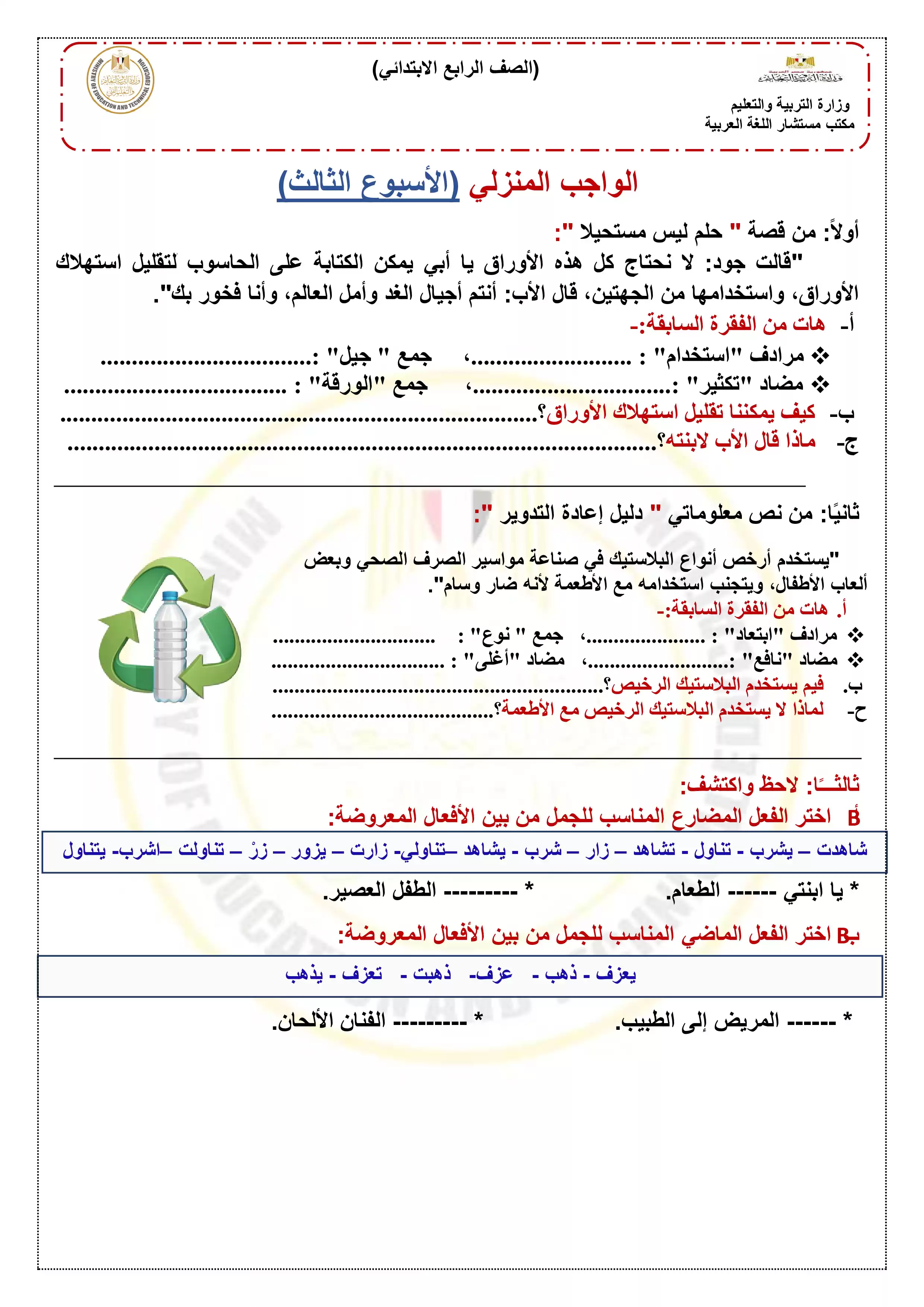 | بيانات الملف: (الواجب المنزلي للأسبوع الثالث في اللغة العربية للصف الرابع الإبتدائي الترم الثاني 2025 - Nezakr) | |