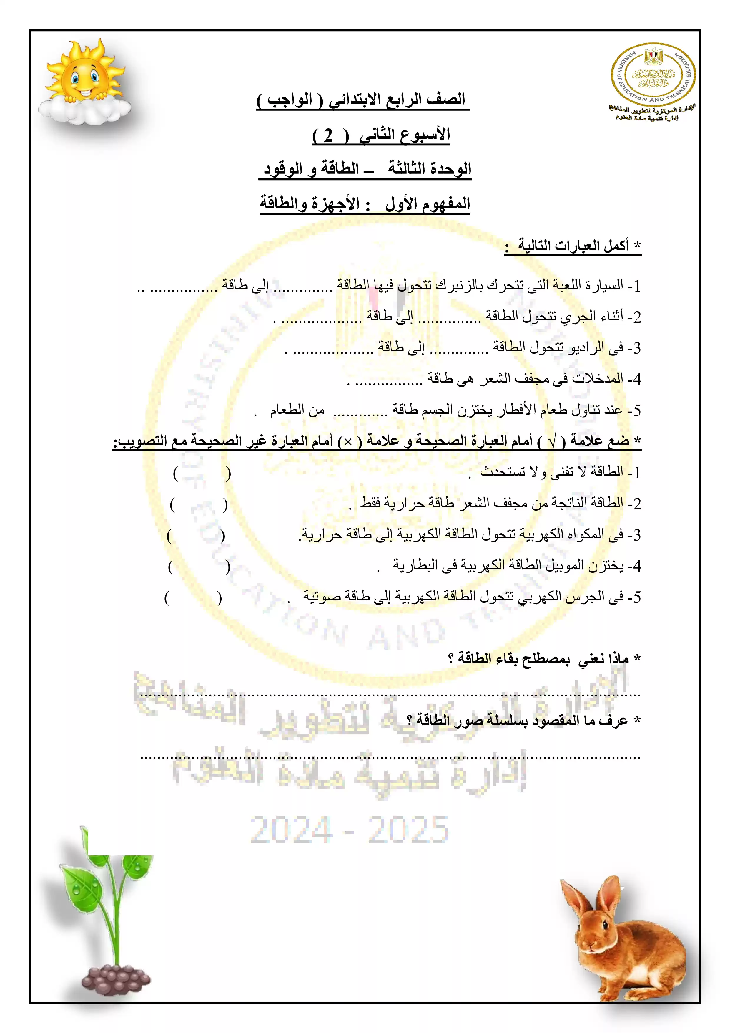 | بيانات الملف: (الواجب والأداء المنزلي للأسبوع الثاني في العلوم للصف الرابع الإبتدائي الترم الثاني 2025 - Nezakr) | |