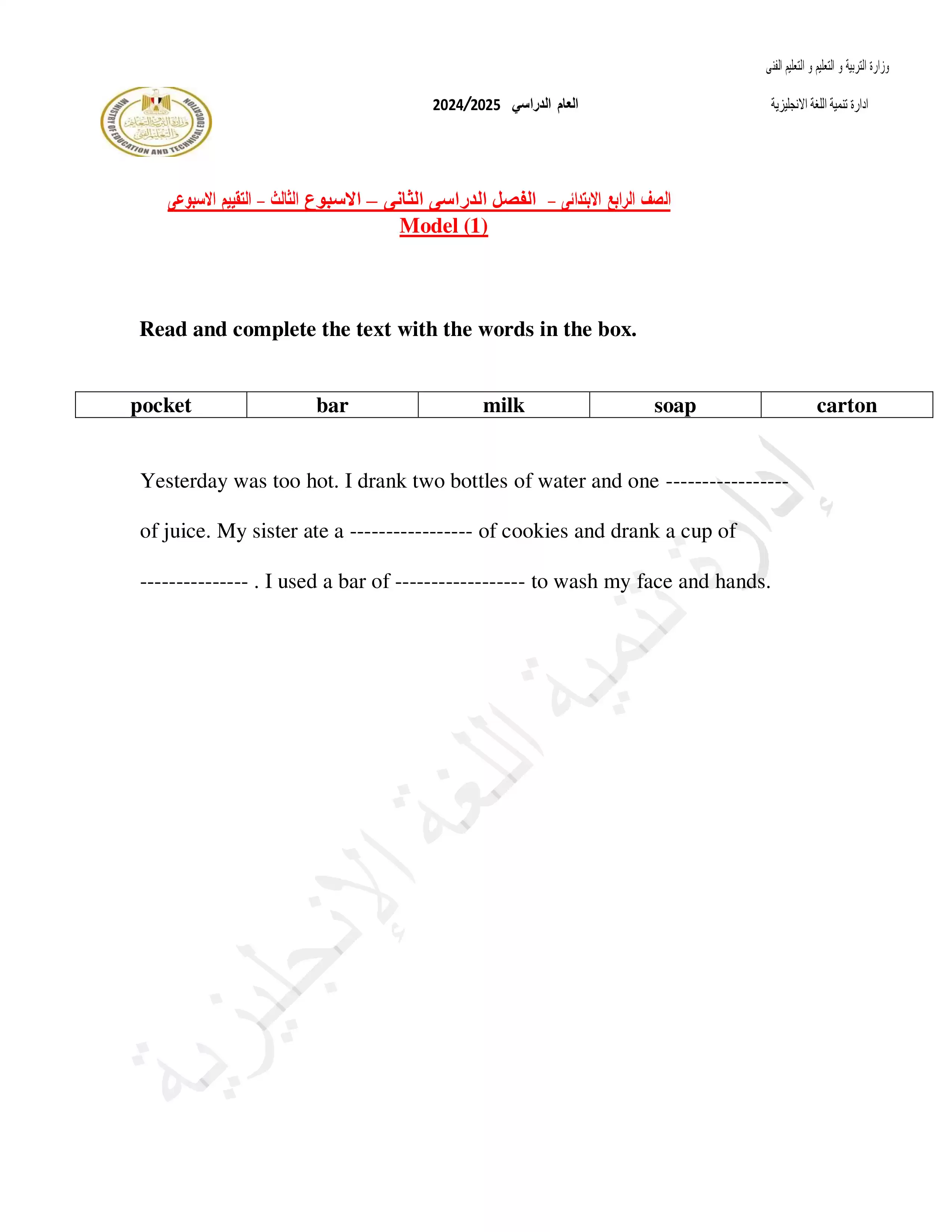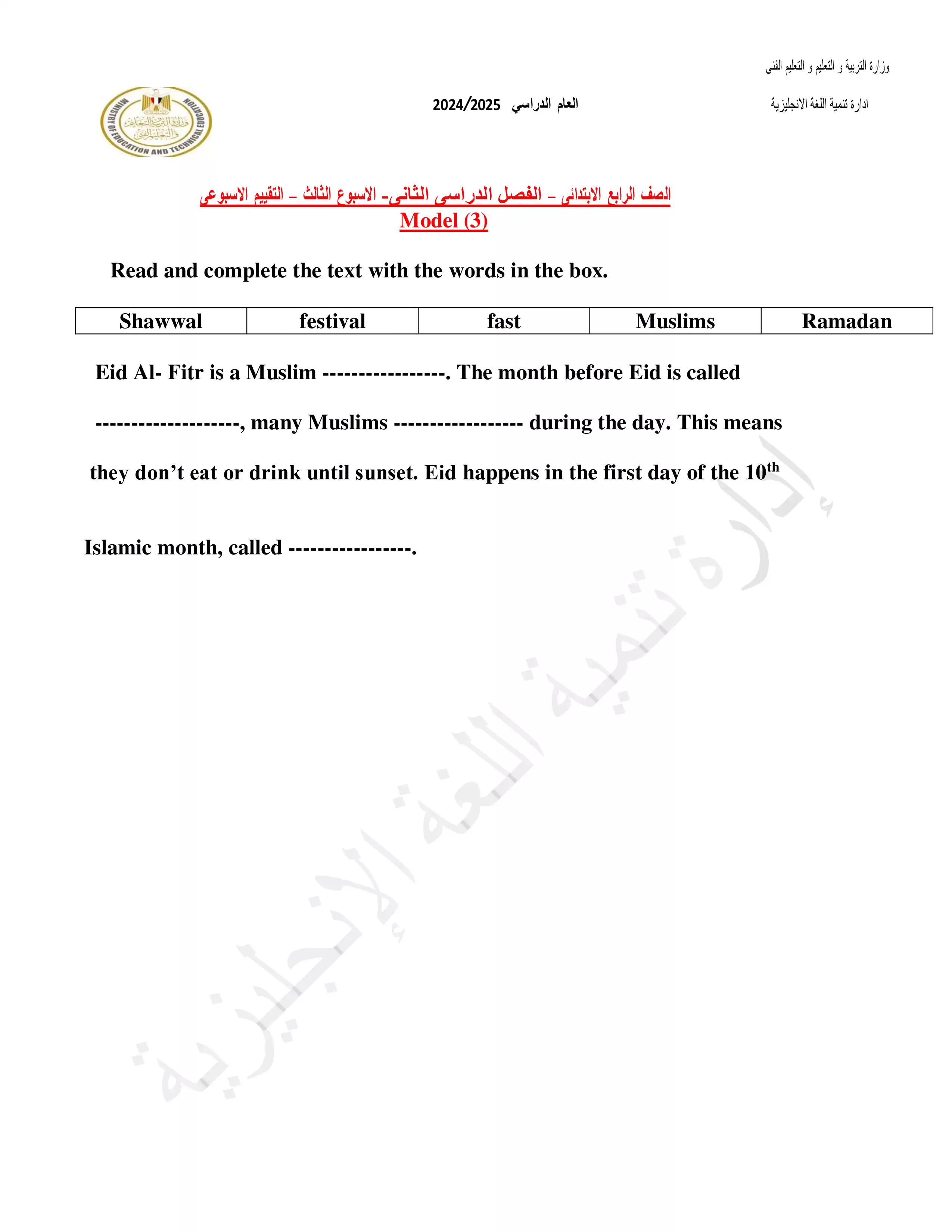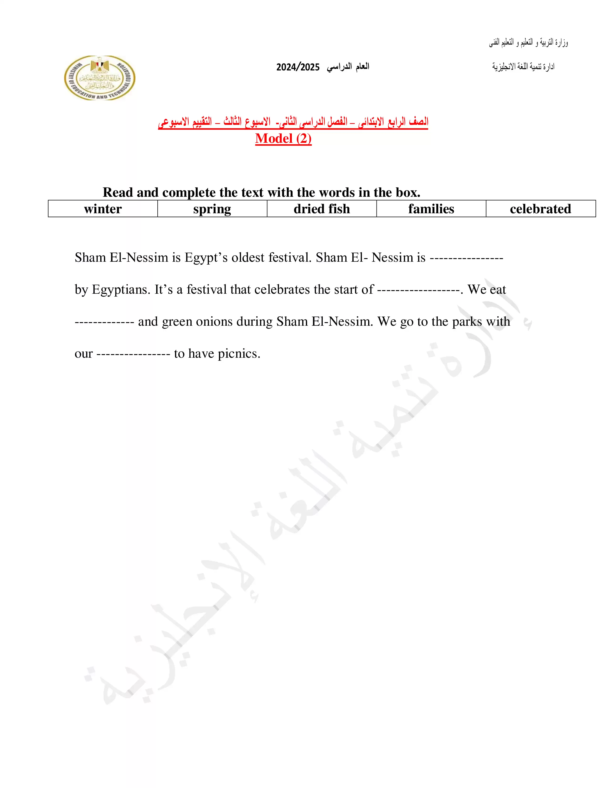 | بيانات الملف: (التقييمات الخاصة بالأسبوع الثالث في اللغة الإنجليزية للصف الرابع الإبتدائي الترم الثاني 2025 - Nezakr) | |