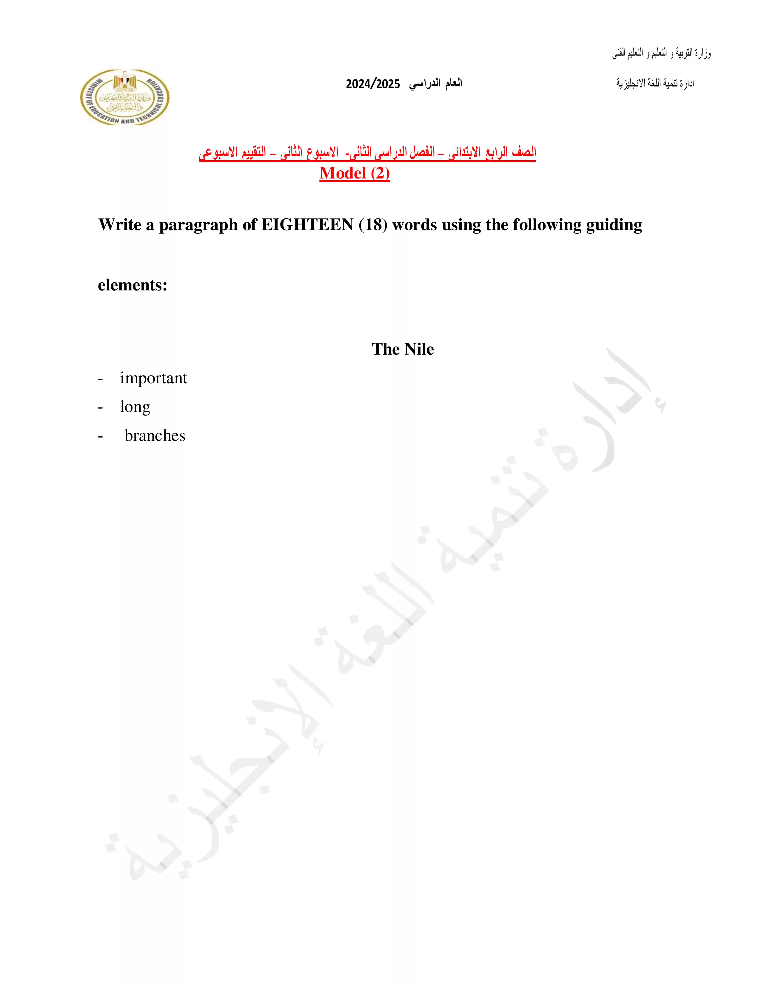 بيانات الملف: (التقييمات الخاصة بالأسبوع الثاني في اللغة الإنجليزية للصف الرابع الإبتدائي الترم الثاني 2025 - Nezakr)