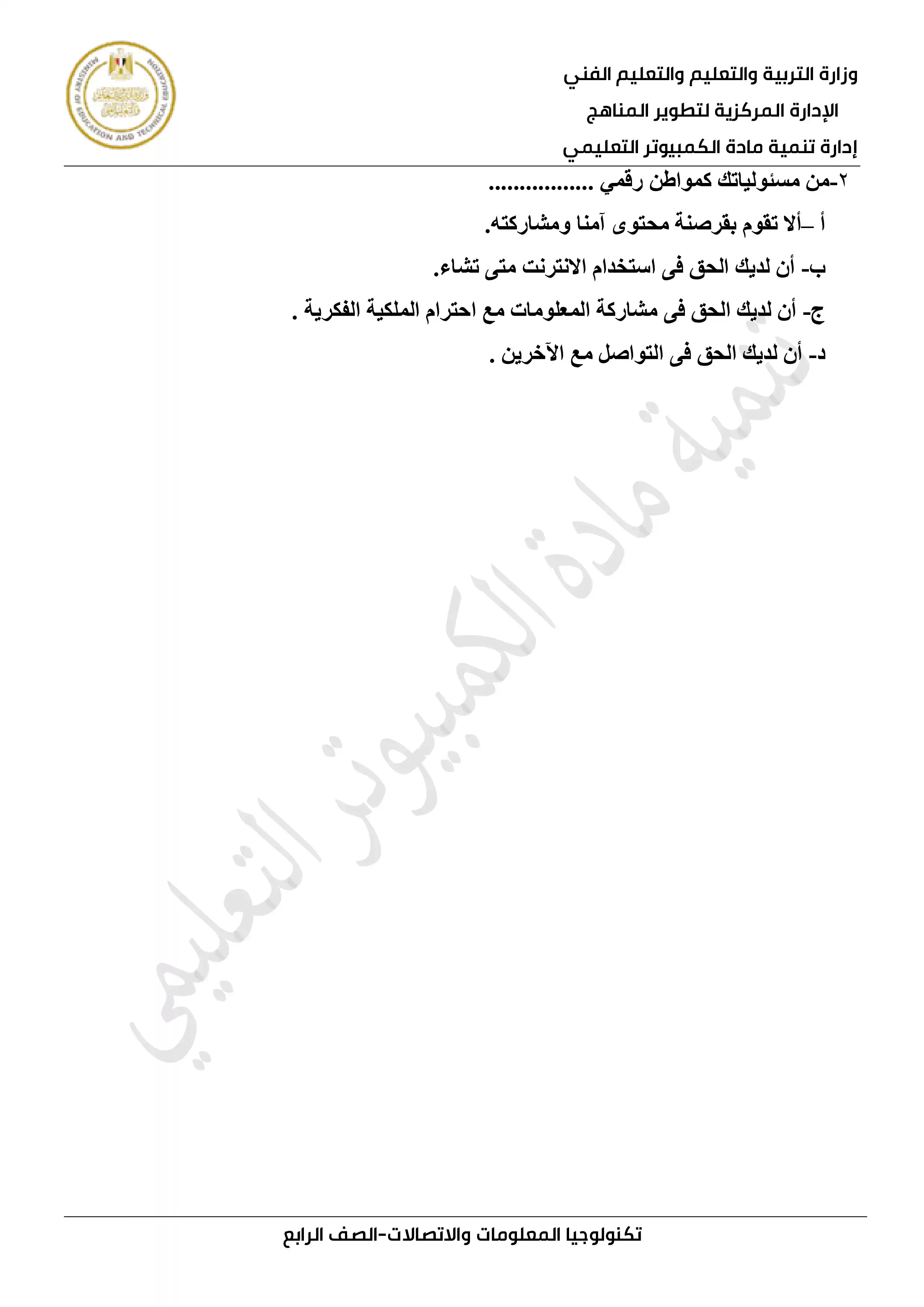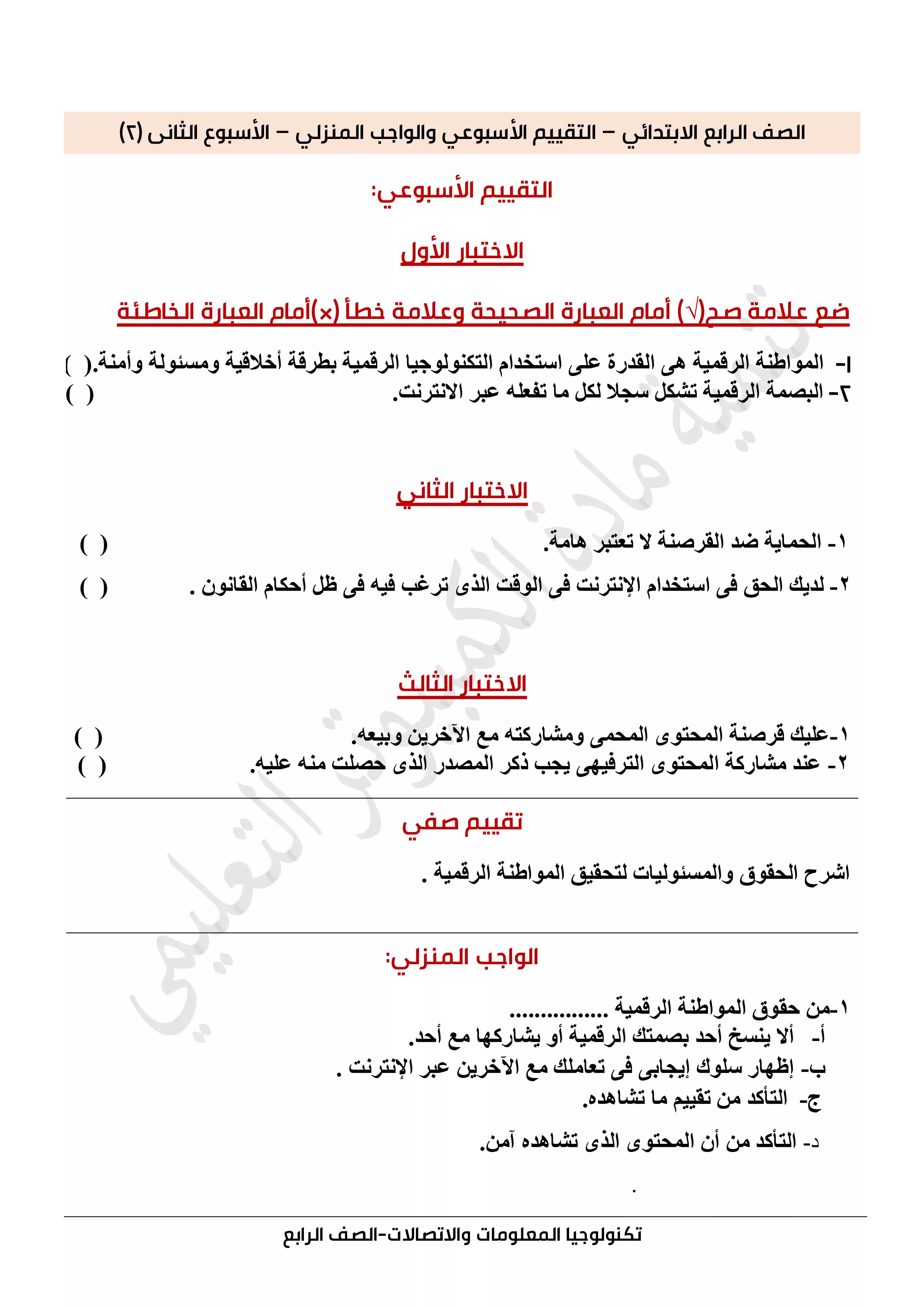 | بيانات الملف: (التقييمات الخاصة بالأسبوع الثاني في الكمبيوتر وتكنولوجيا المعلومات للصف الرابع الإبتدائي الترم الثاني 2025 - Nezakr) | |