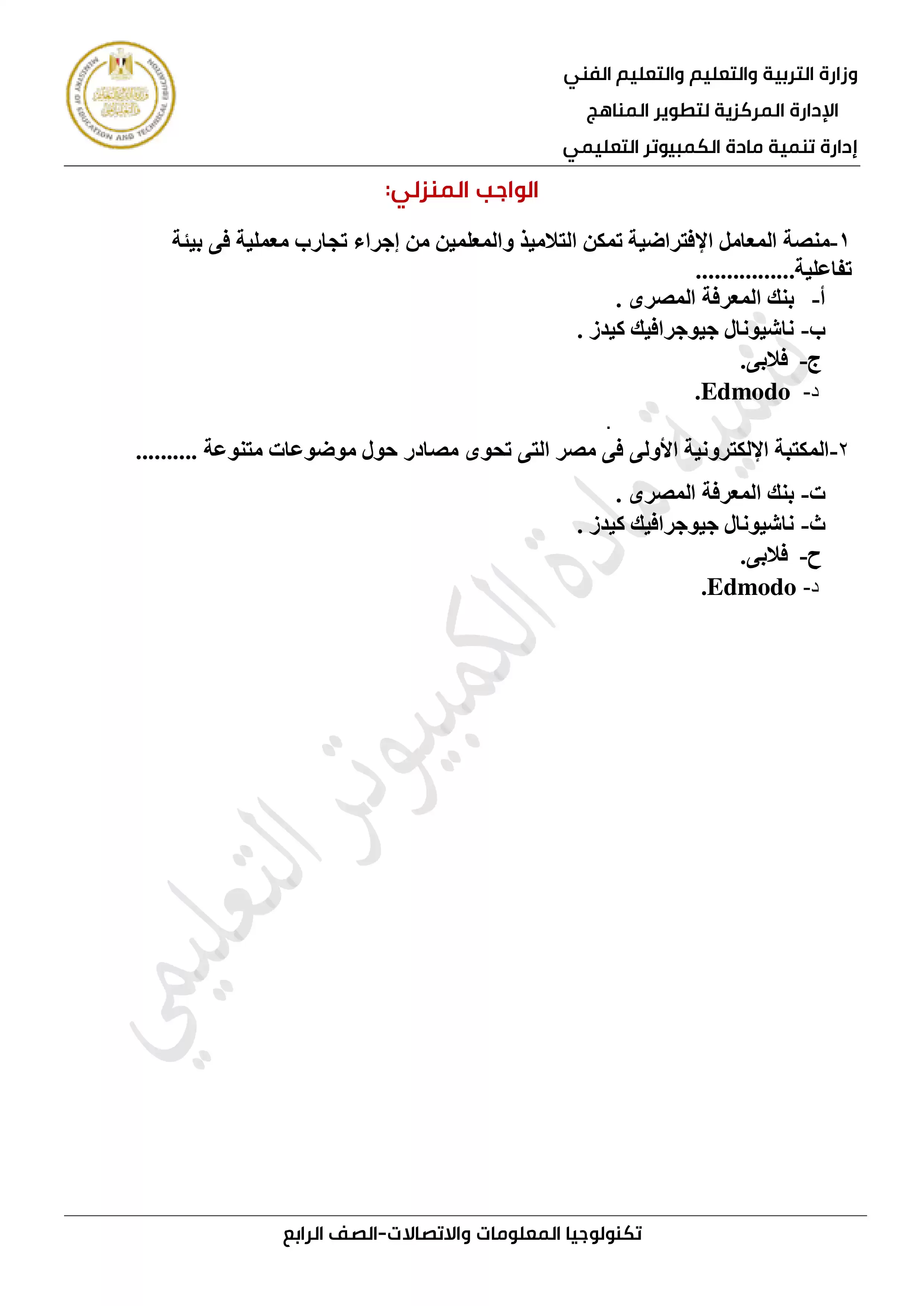• تقييم مادة الكمبيوتر وتكنولوجيا المعلومات رابعة ابتدائي