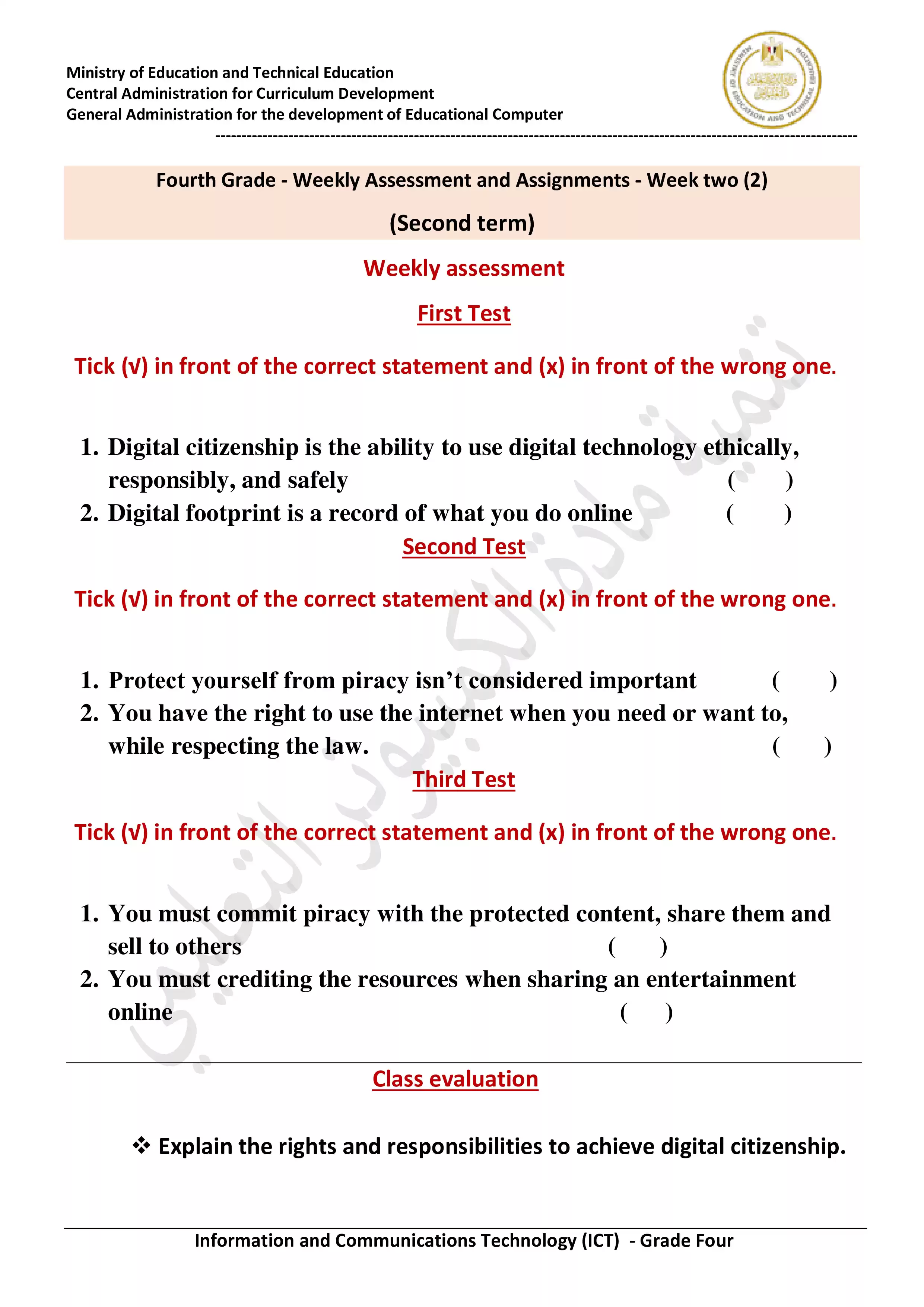 بيانات الملف: (التقييمات الخاصة بالأسبوع الثاني في الكمبيوتر وتكنولوجيا المعلومات ICT للصف الرابع الإبتدائي الترم الثاني 2025 - Nezakr)