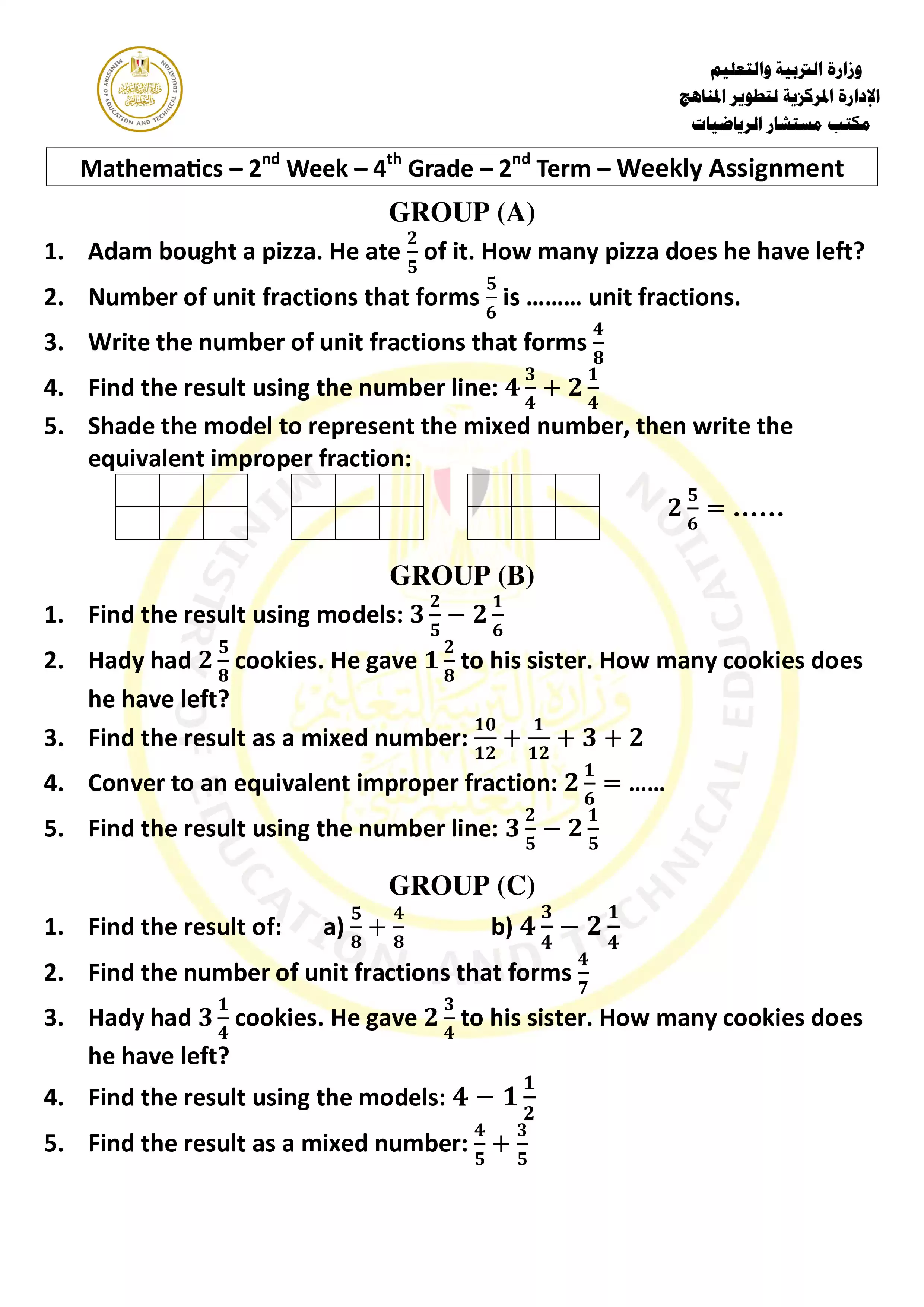 • التقييم الأسبوعي الثاني في مادة الرياضيات للغات Math للصف الرابع الابتدائي الترم الثاني 2025