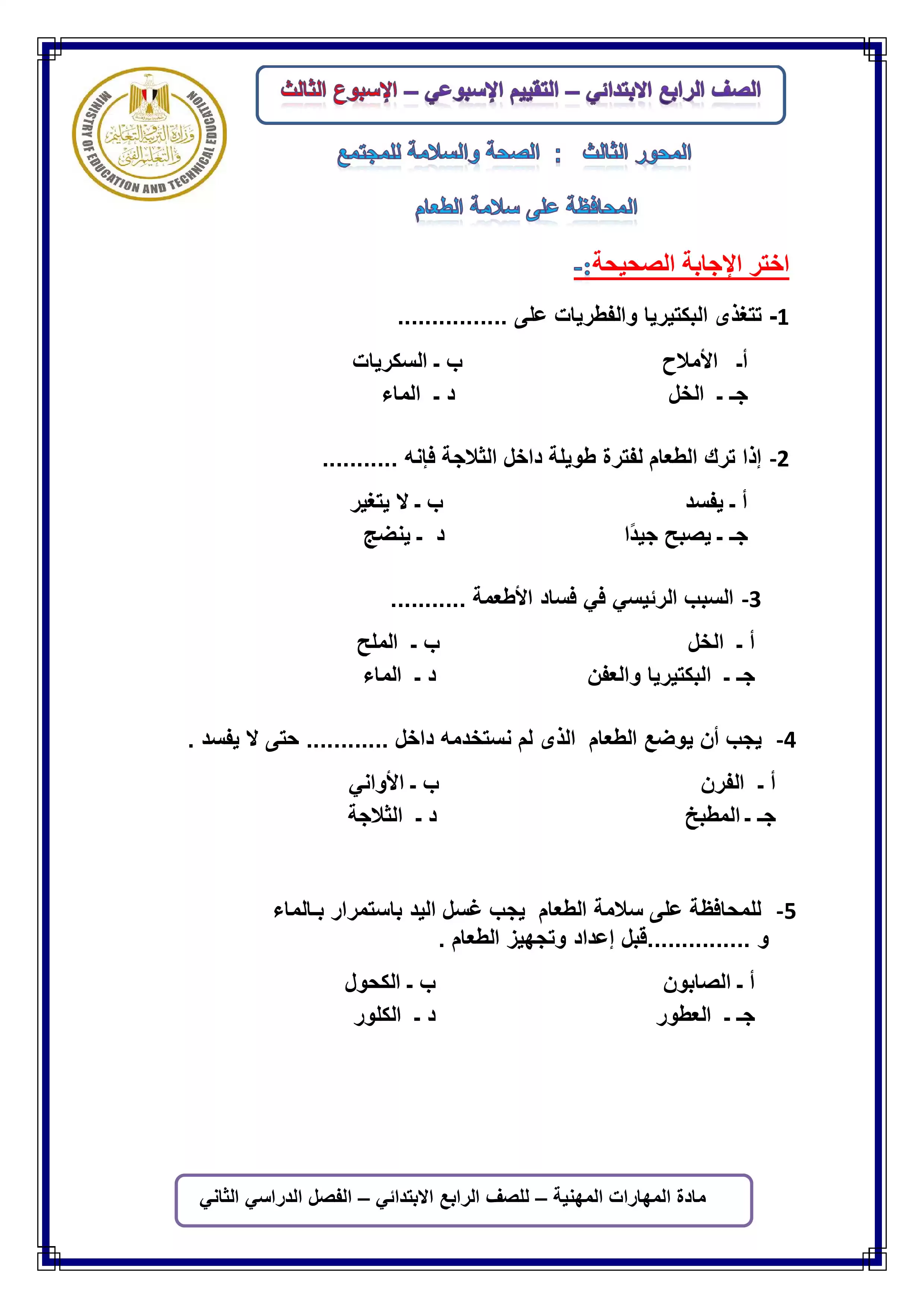 الصف الرابع الإبتدائي > المهارات المهنية > تقييمات الأسبوع الثالث في مادة المهارات المهنية للصف الرابع الإبتدائي الترم الثاني 2025 بصيغة PDF