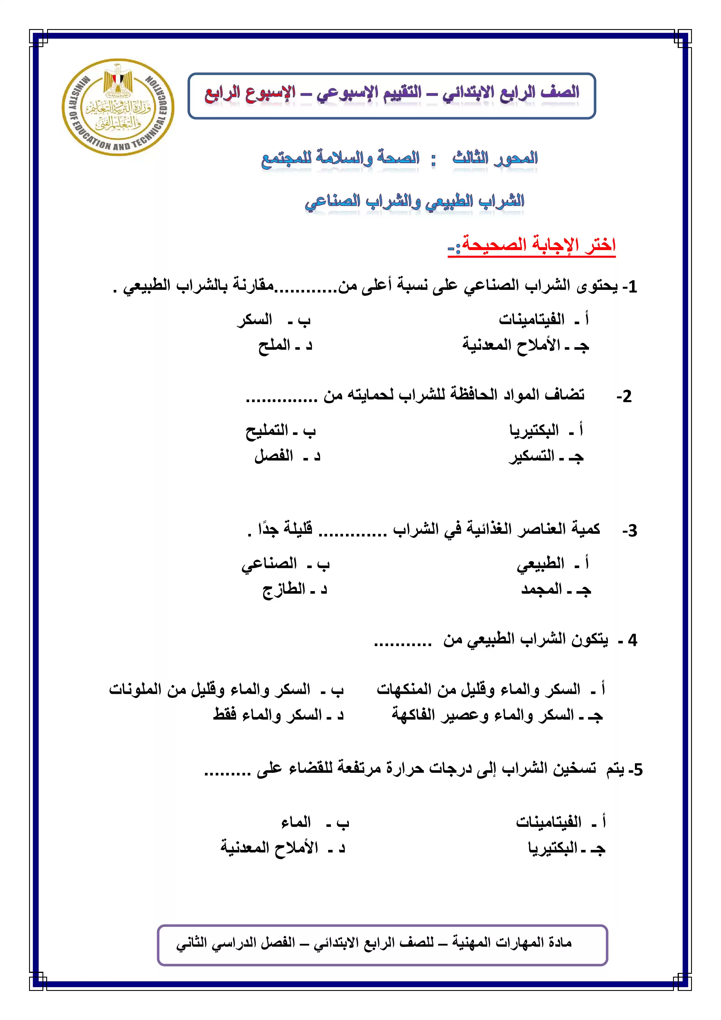 يحتوي الملف المرفق على التقييمات الخاصة بالأسبوع الرابع في مادة المهارات المهنية للصف الرابع الابتدائي الترم الثاني 2025، وهو بصيغة PDF وبجودة عالية متاح للتحميل والتصفح مجاناً من موقع نذاكر.