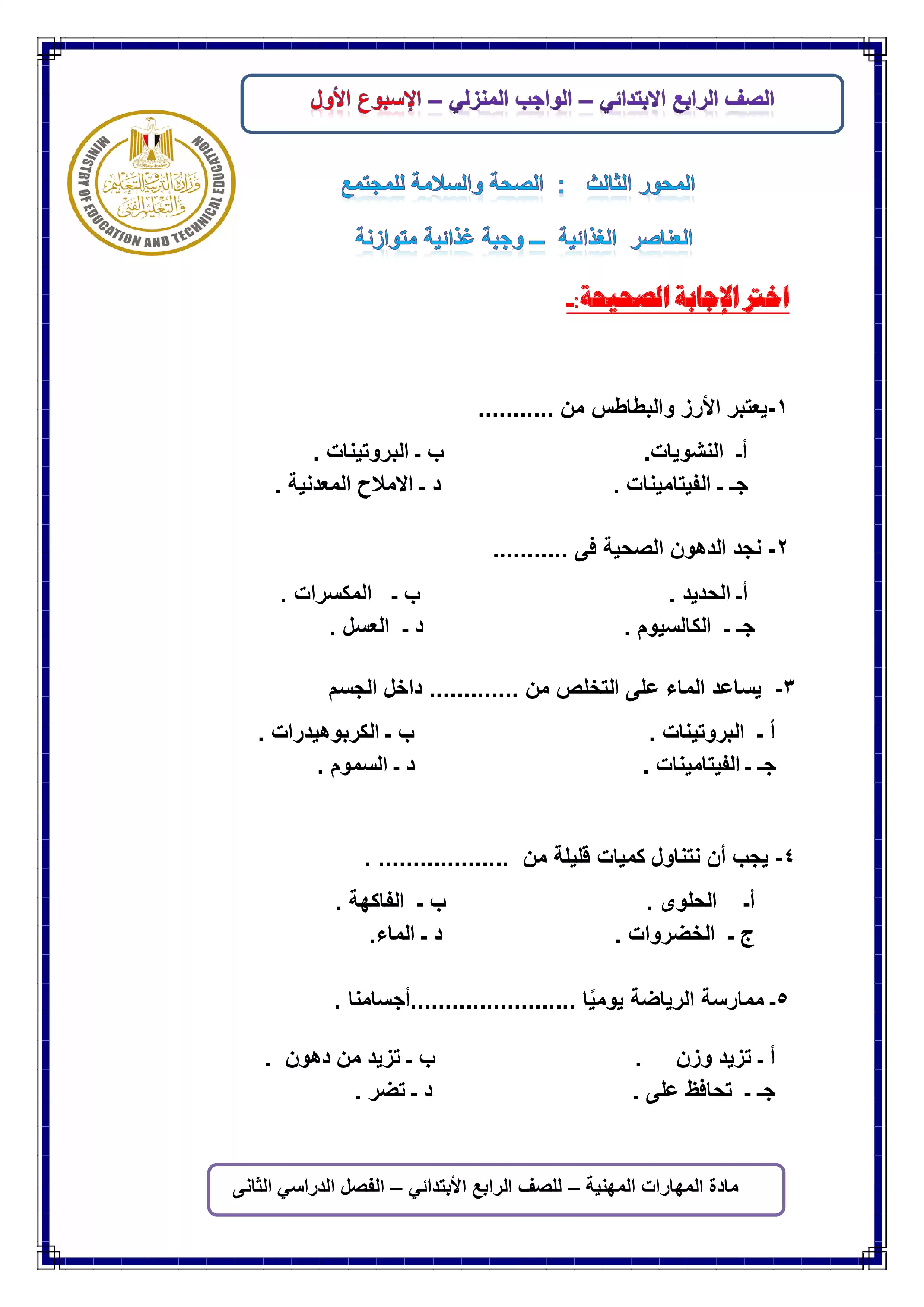 الآداء المنزلي في الأسبوع الاول مادة المهارات المهنية للصف الرابع الإبتدائي الترم الثاني 2025 بصيغة PDF
