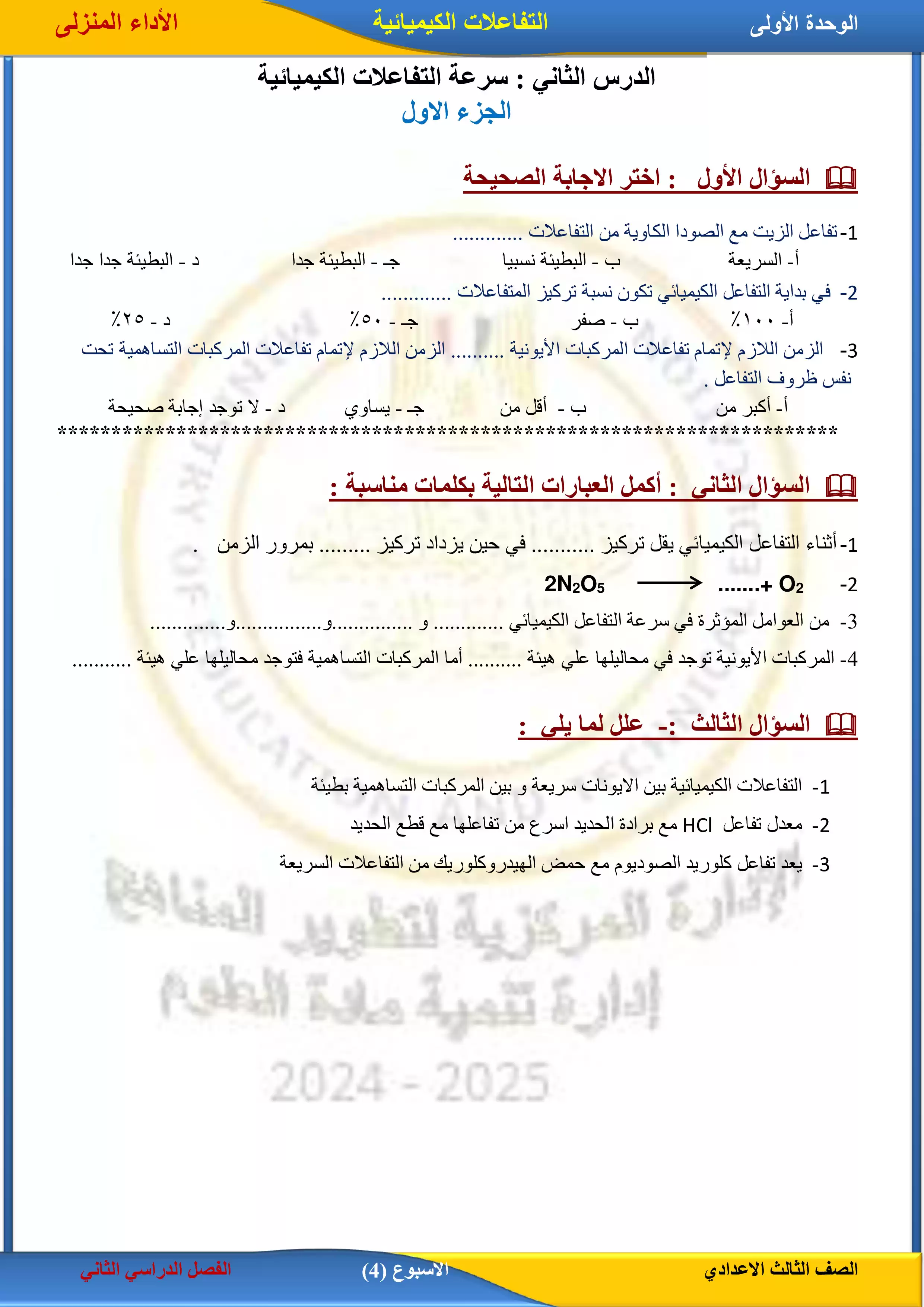 1. الأداء المنزلي في الأسبوع الاول مادة العلوم للصف الثالث الاعدادي الترم الثاني 2025 بصيغة PDF