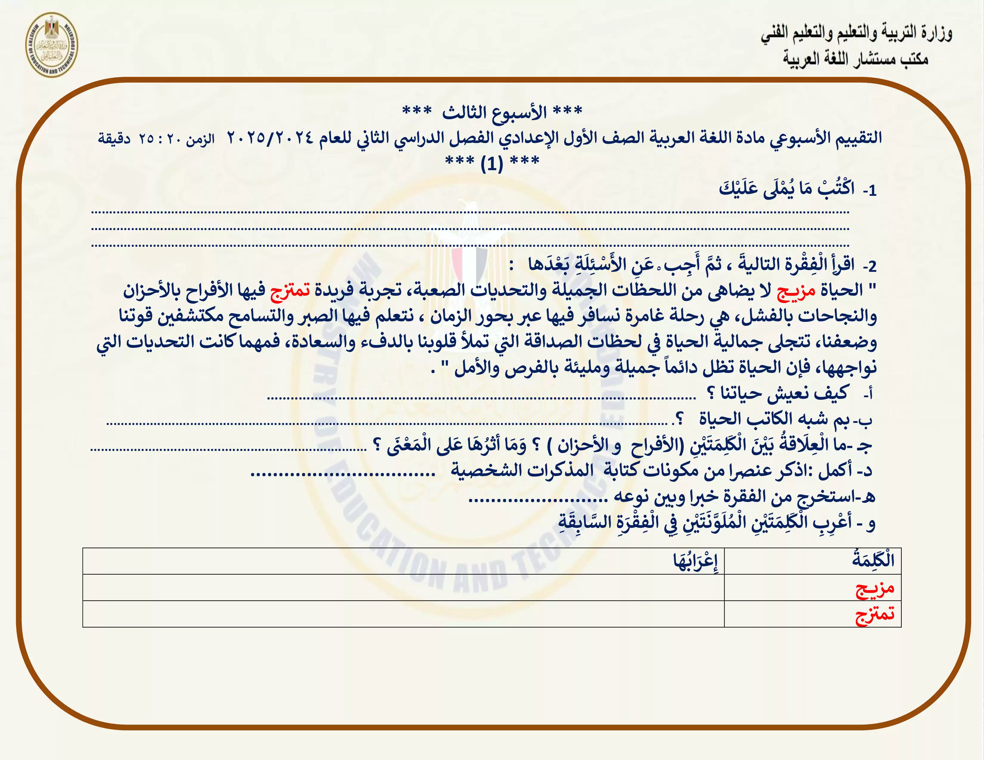 • التقييم الأسبوعي الثالث في مادة اللغة العربية للصف الأول الإعدادي الترم الثاني 2025