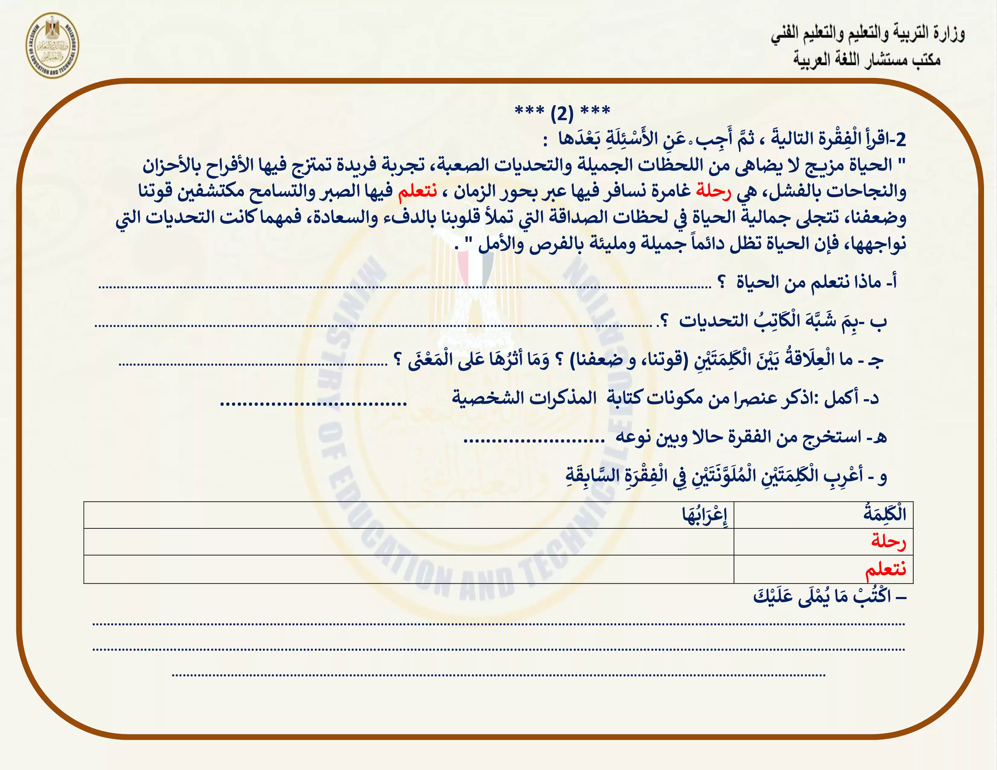 صفحة 2 من 5 صفحة من ملف: التقييمات الخاصة بالأسبوع الثالث في اللغة العربية للصف الاول الاعدادي الترم الثاني 2025 - Nezakr