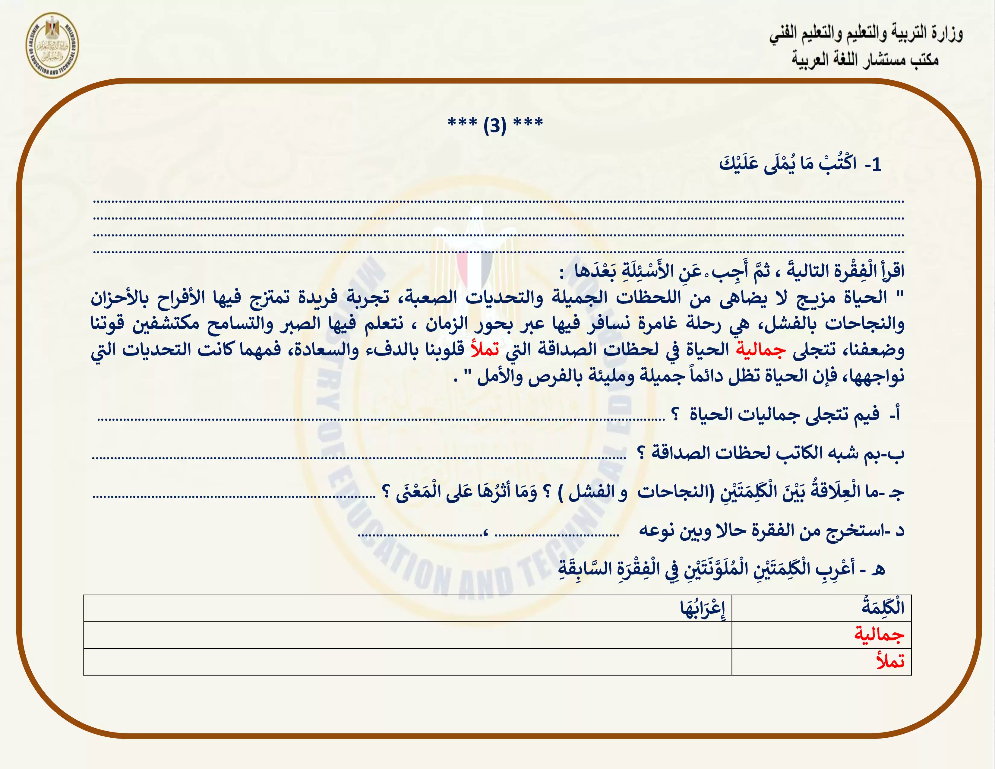 صفحة 3 من 5 صفحة من ملف: التقييمات الخاصة بالأسبوع الثالث في اللغة العربية للصف الاول الاعدادي الترم الثاني 2025 - Nezakr