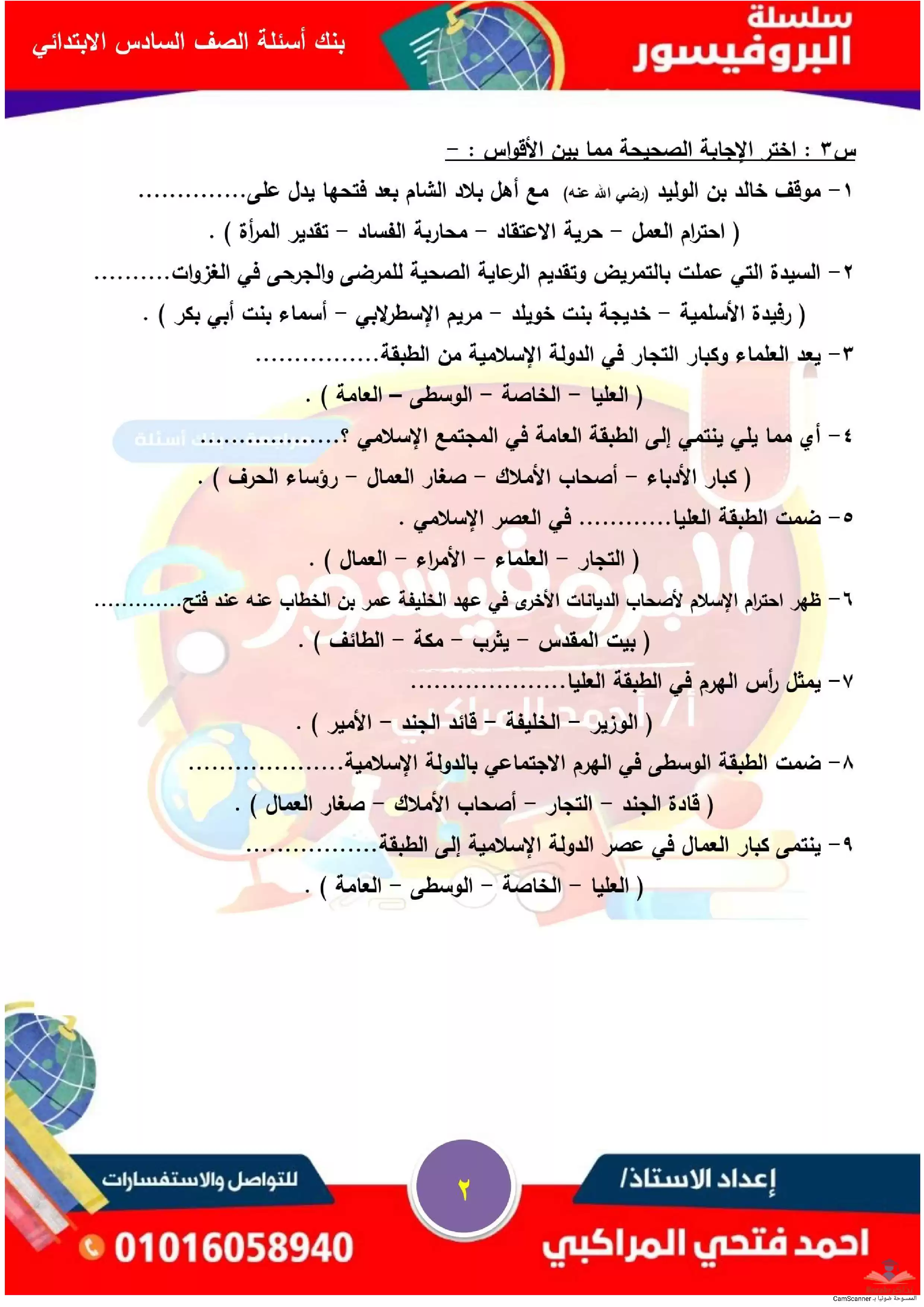 صفحة 2 من 6 صفحة من ملف: بنك اسئلة درس الحياة الاجتماعية في عصر الدولة الاسلامية مادة الدراسات الاجتماعية لساتة ابتدائي - Nezakr