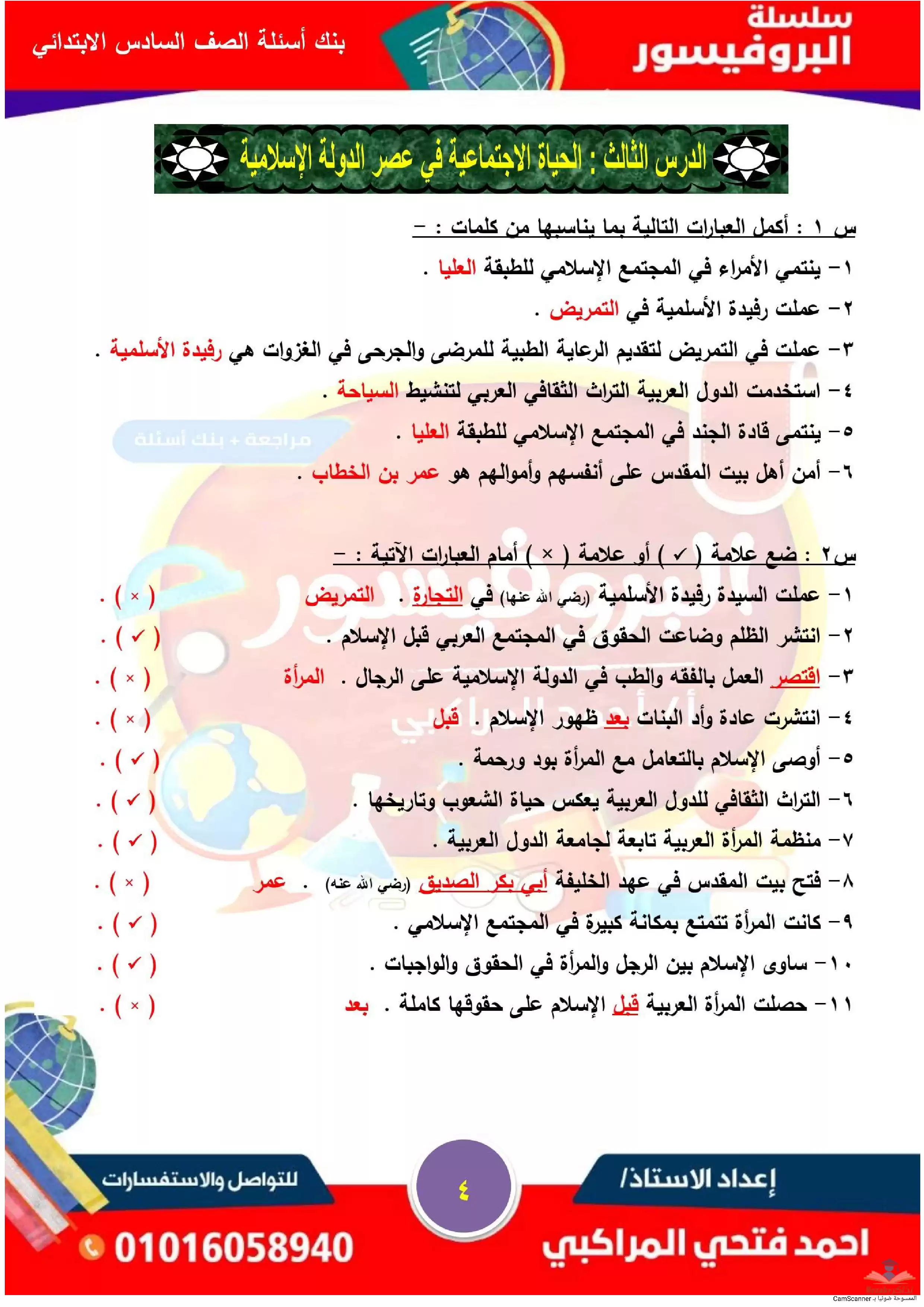 بيانات الملف: (بنك اسئلة درس الحياة الاجتماعية في عصر الدولة الاسلامية مادة الدراسات الاجتماعية لساتة ابتدائي - Nezakr)