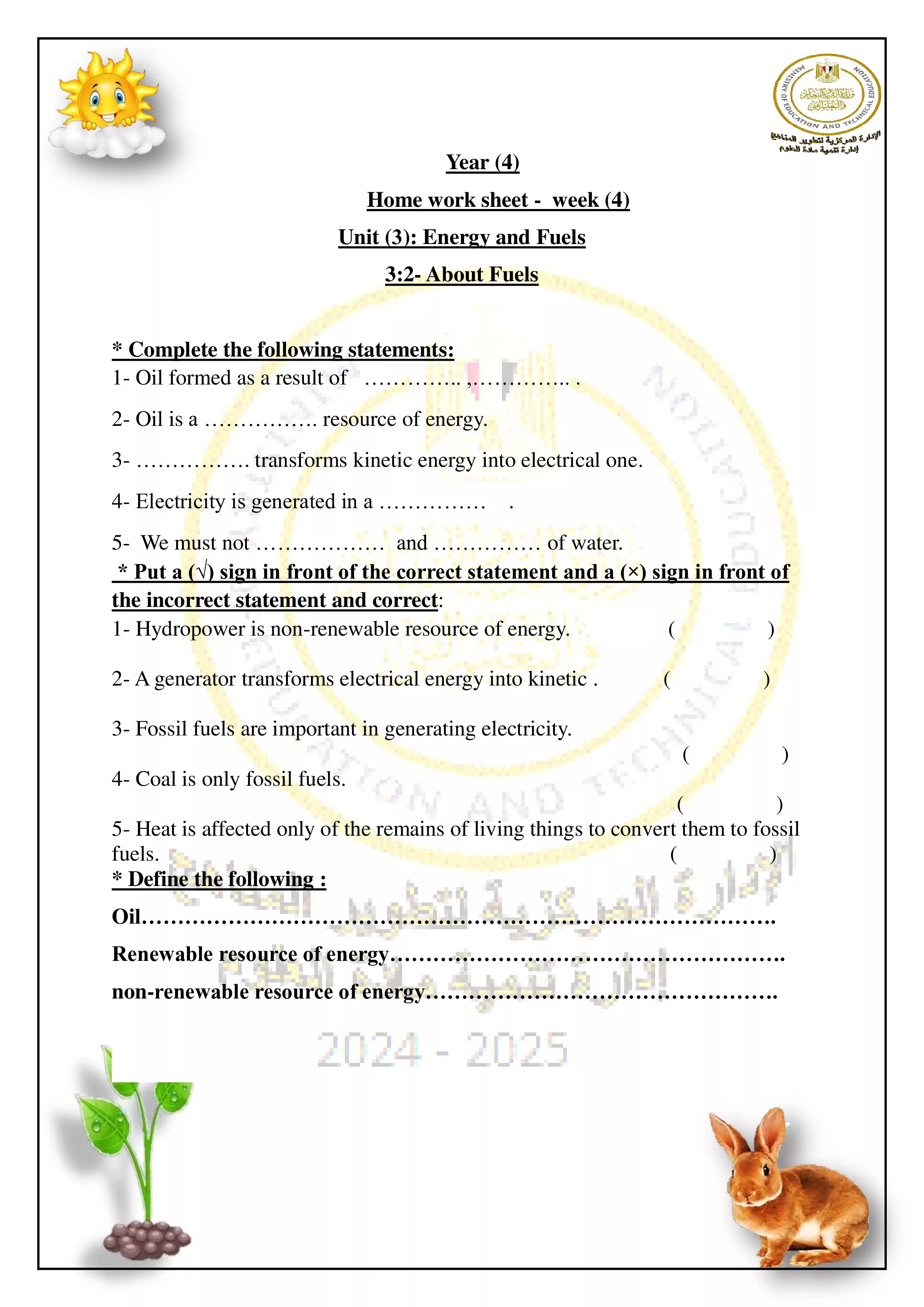 الواجب والآداء المنزلي للصف الرابع الابتدائي في الترم الثاني 2025