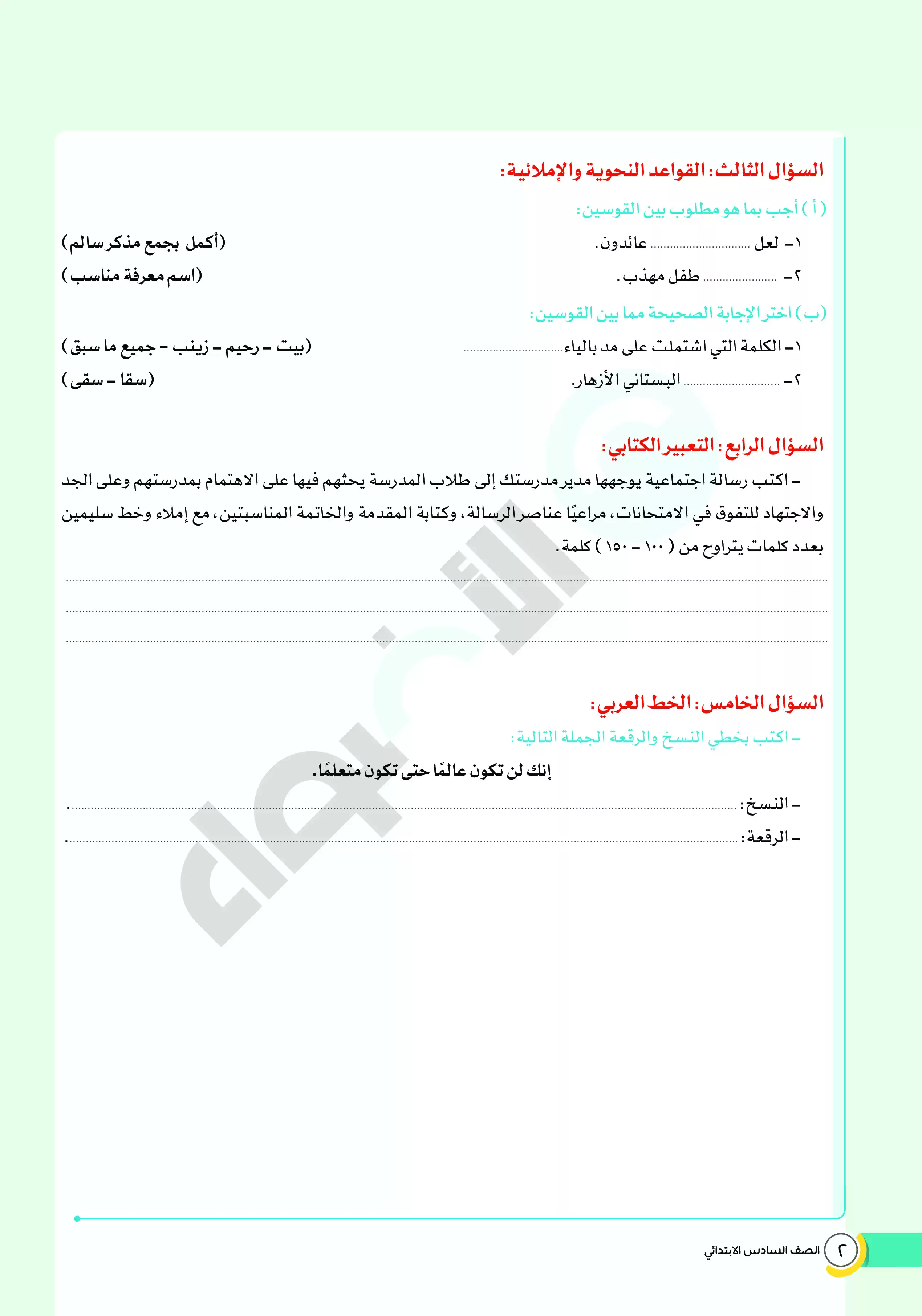 الصف السادس الإبتدائي > اللغة العربية > امتحانات الأضواء الاسترشادية في اللغة العربية لسادسه ابتدائي على مقرر شهر فبراير 2025 بصيغة PDF