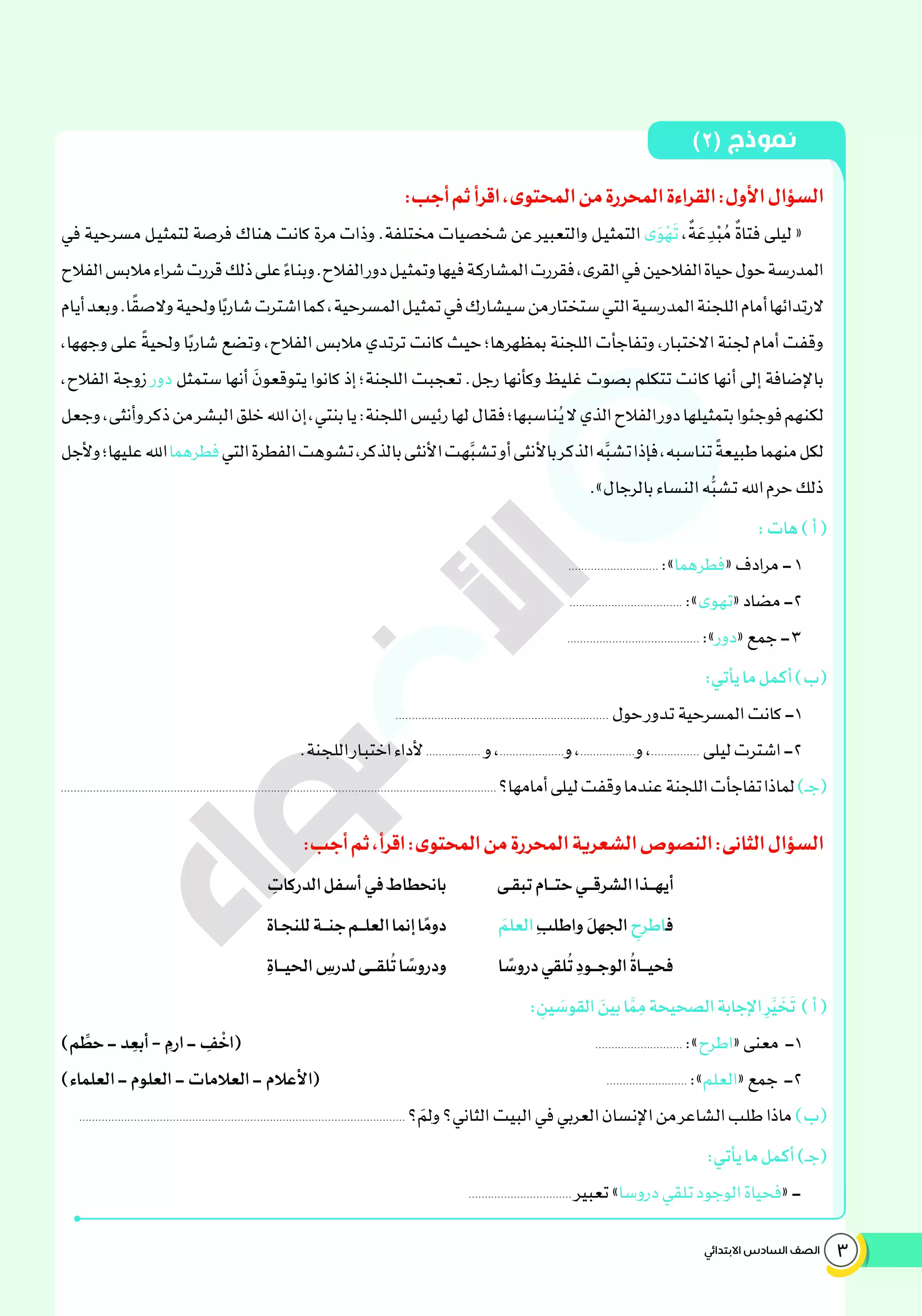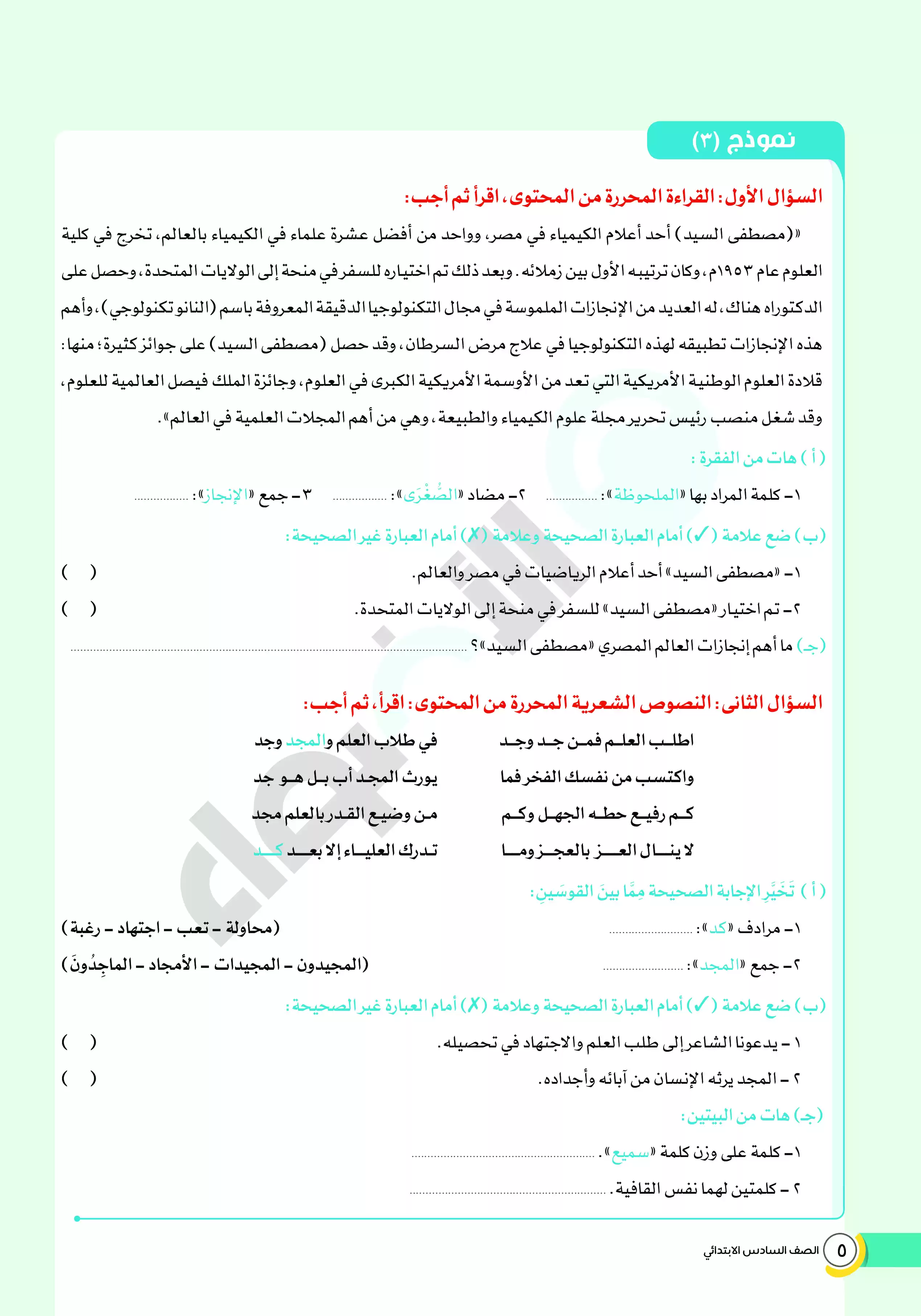 صفحة 3 من 14 صفحة من ملف: امتحانات الأضواء الاسترشادية في العربي للصف السادس الابتدائي مقرر فبراير 2025 بالاجابات - Nezakr