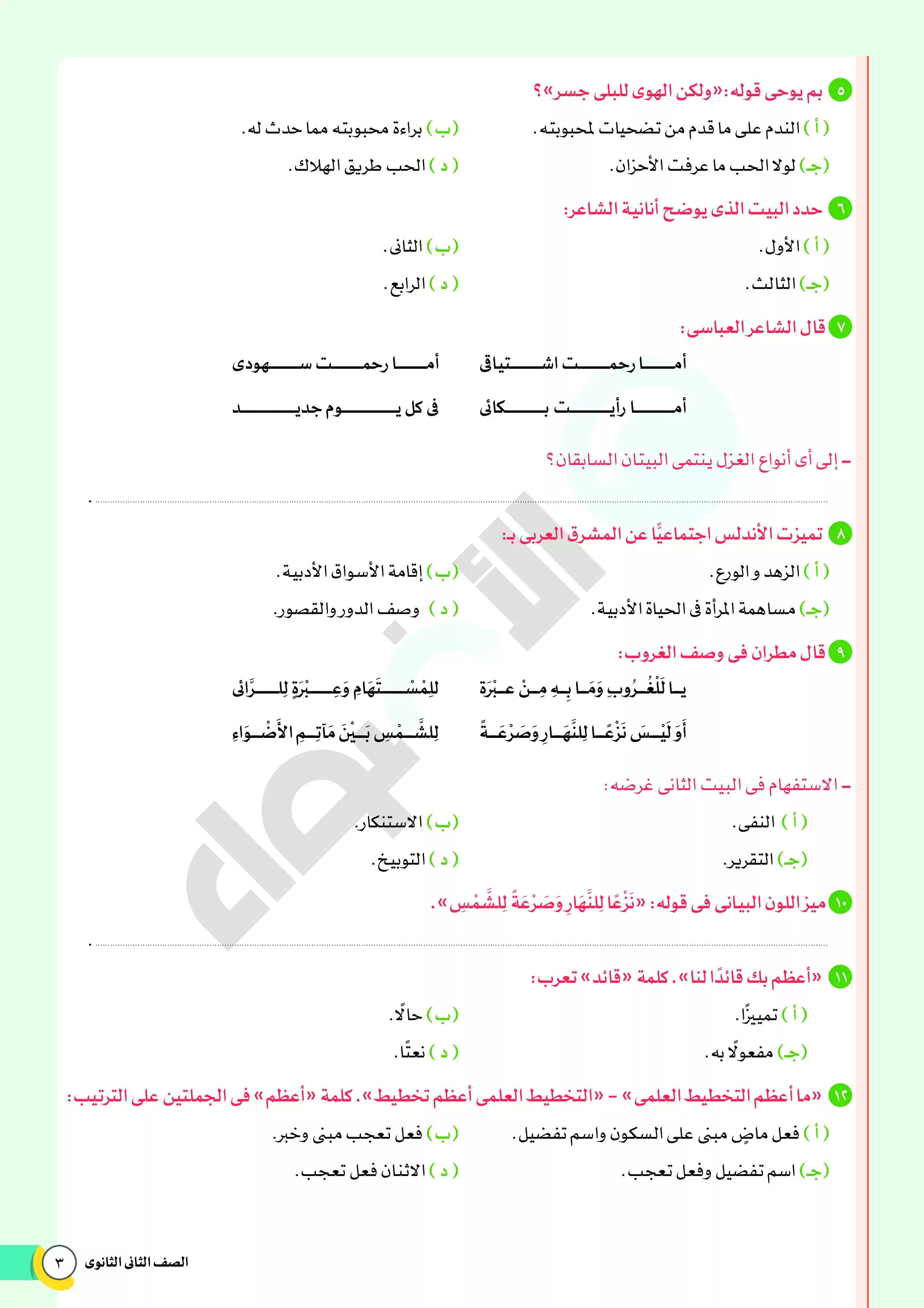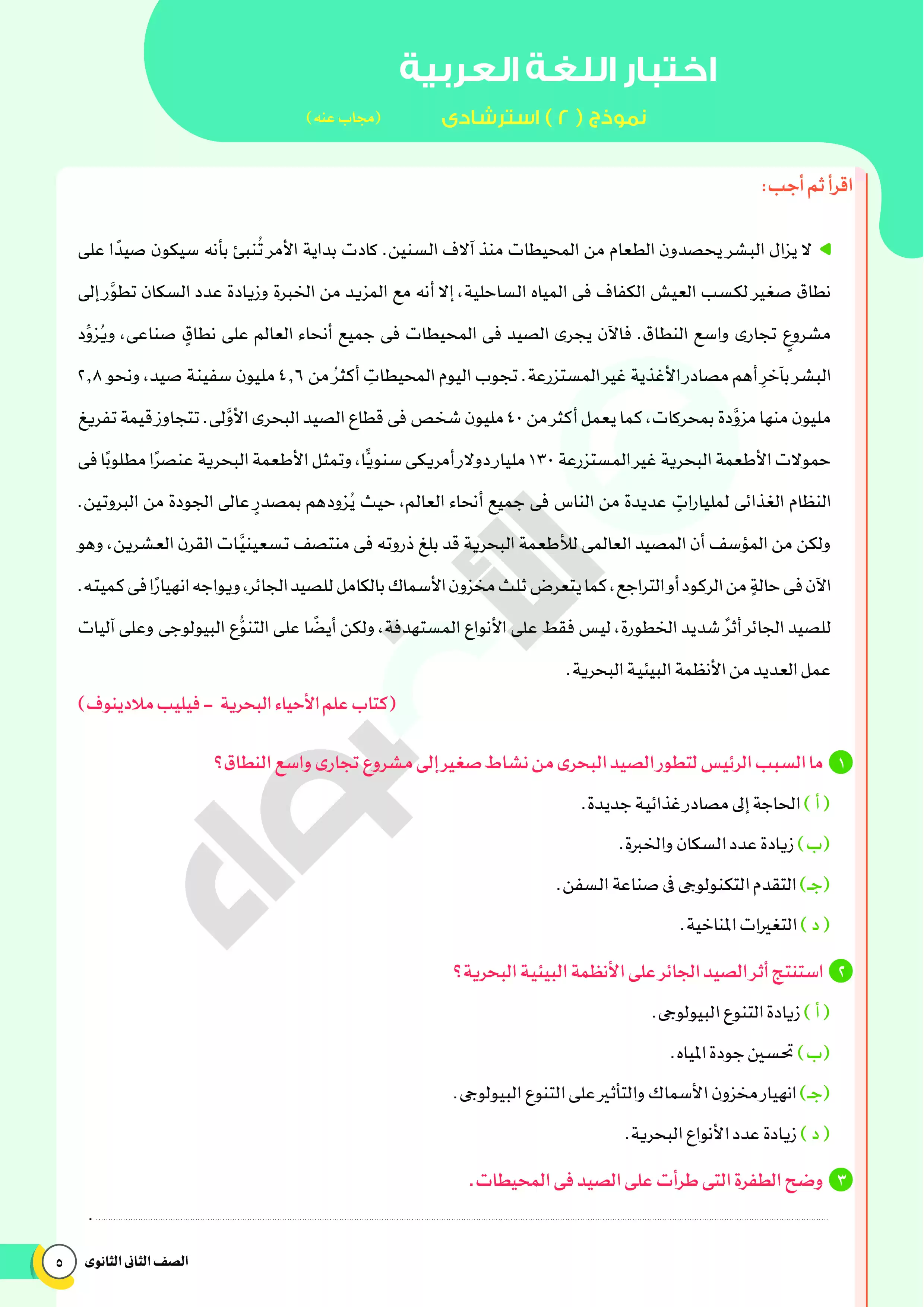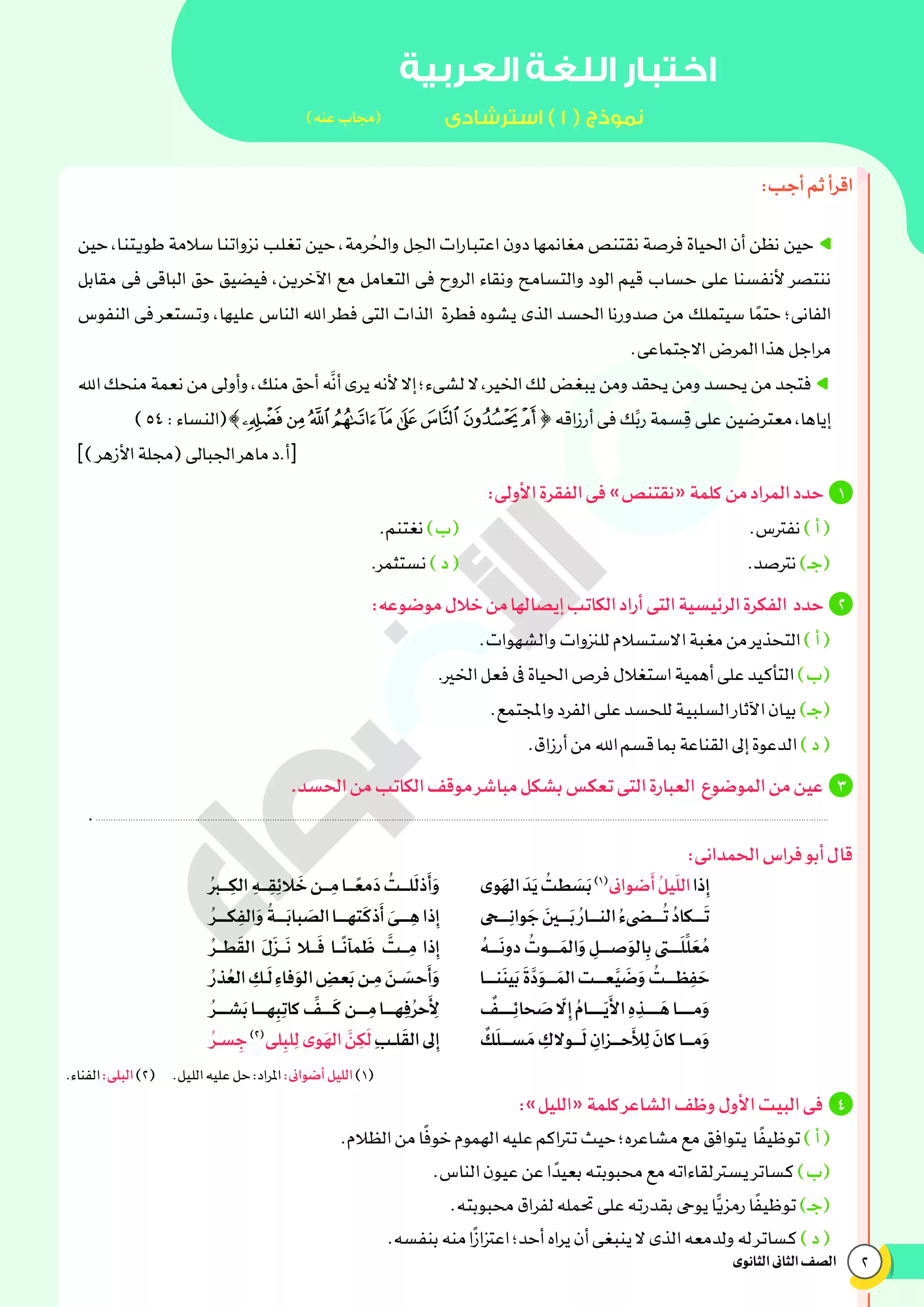 يحتوي الملف المرفق، والصادر من مؤسسة الأضواء، على نماذج امتحانات استرشادية على منهج ومقرر اللغة العربية خلال شهر فبراير لطلاب الصف الثاني الثانوي، كما يتضمن الملف نموذج إجابة للأسئلة الموجودة فيه ليتدرب الطالب وولي الأمر عليها، والملف متاح بصيغة PDF وبجودة مميزة متاحة للتحميل والتصفح مجاناً.