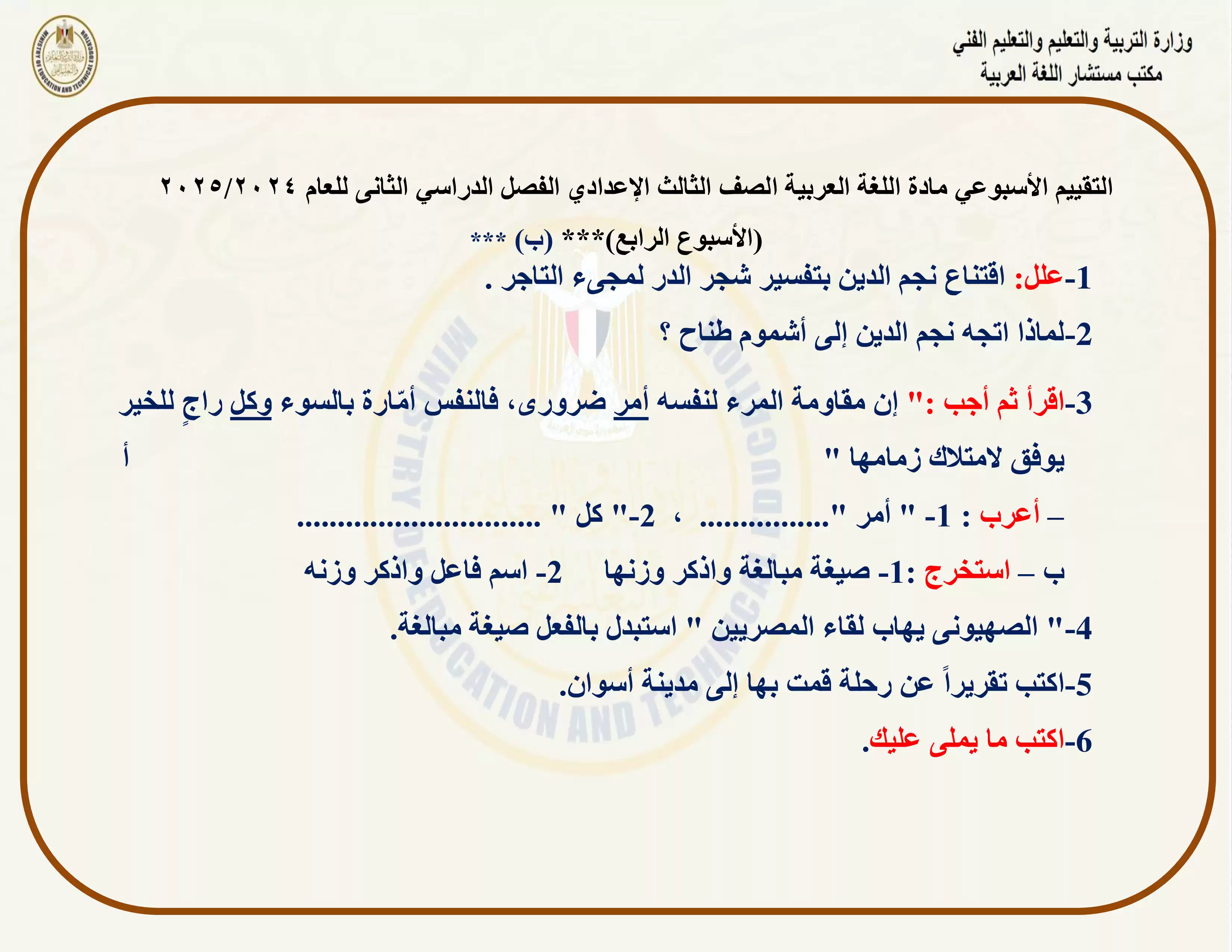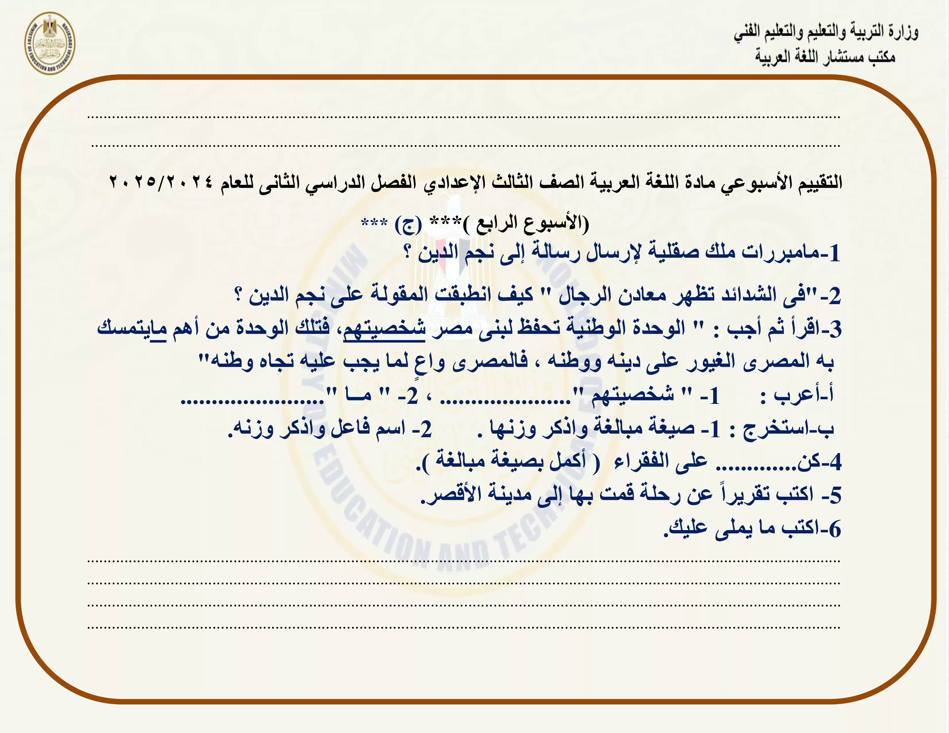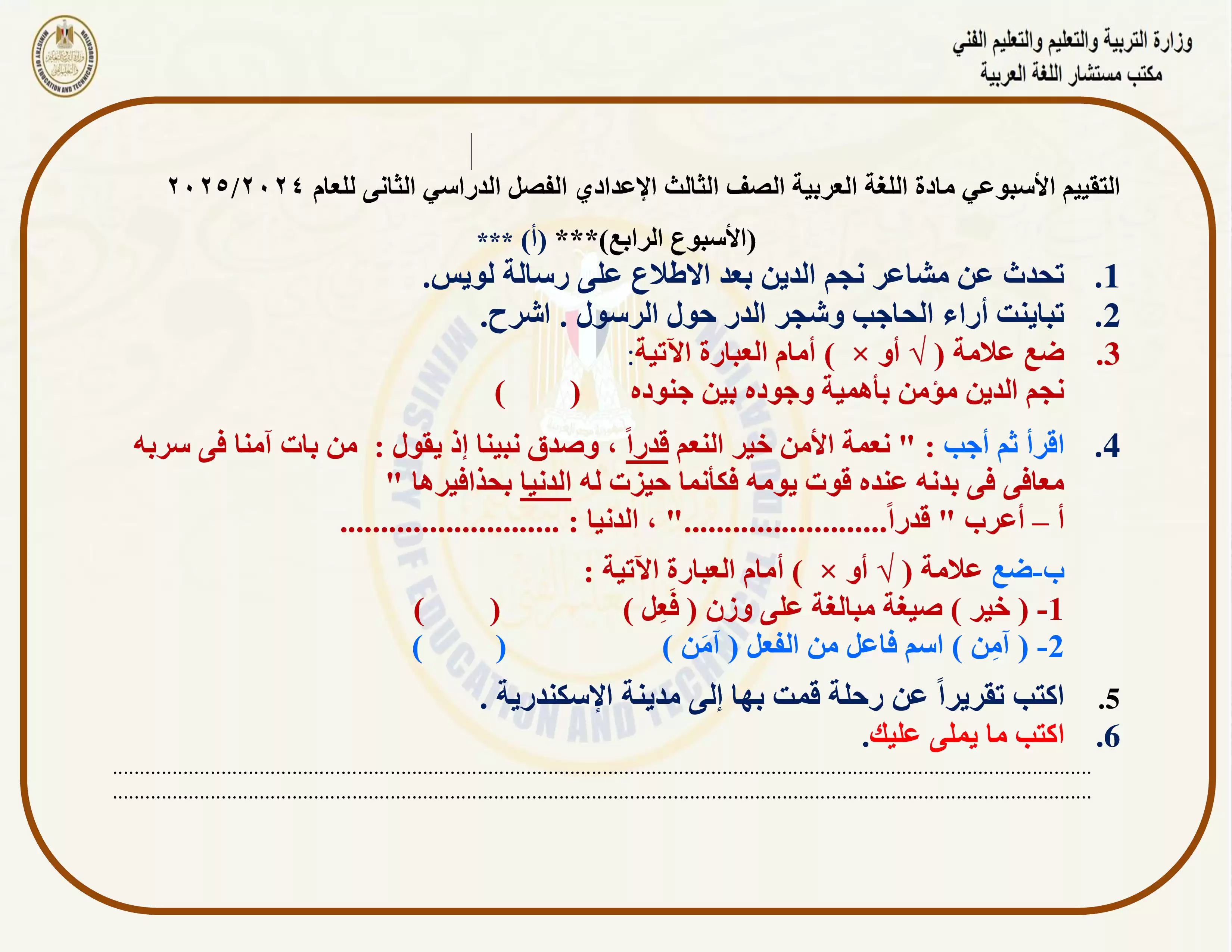 • التقييم الأسبوعي الرابع في مادة اللغة العربية للصف الثالث الإعدادي الترم الثاني 2025