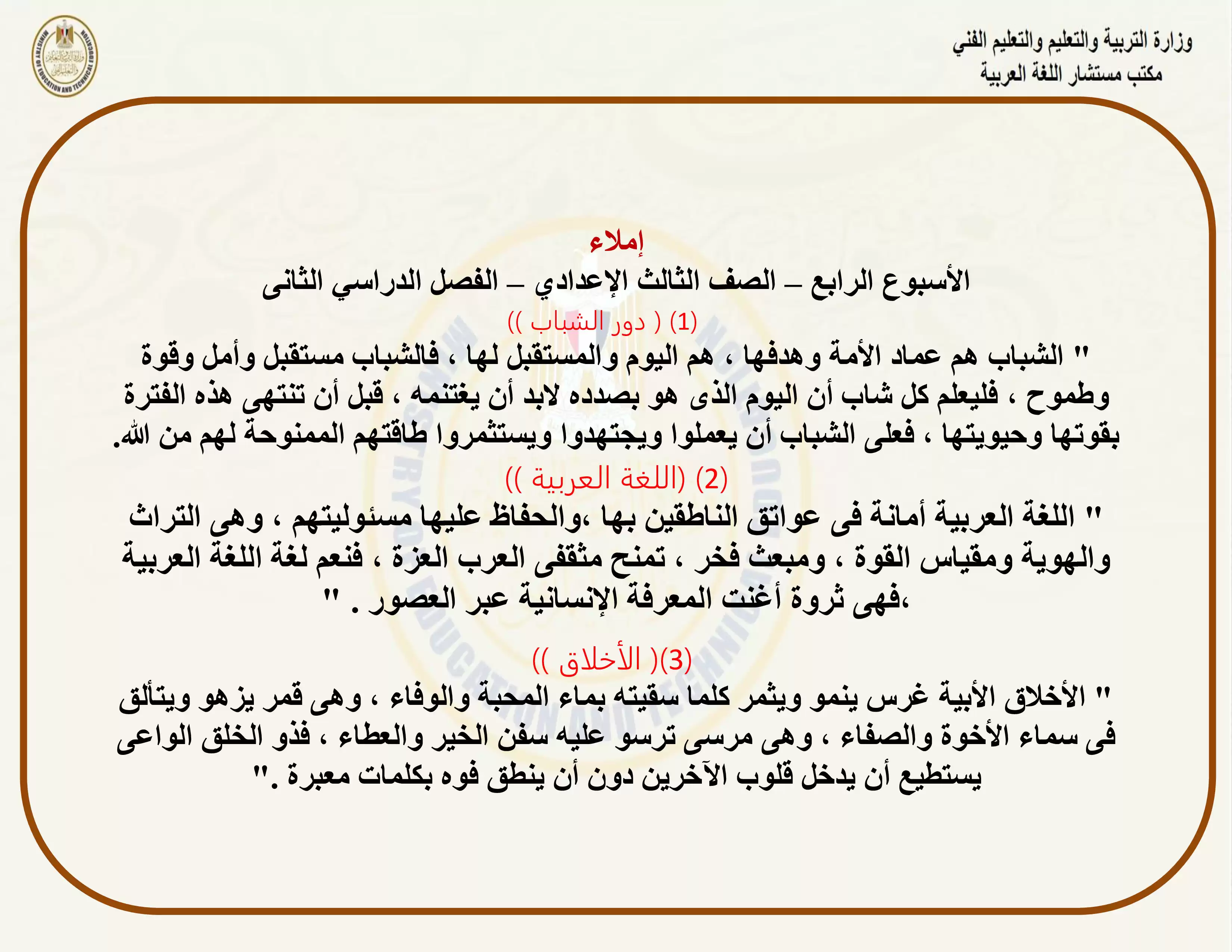 صفحة 3 من 5 صفحة من ملف: التقييمات الخاصة بالأسبوع الرابع في اللغة العربية للصف الثالث الاعدادي الترم الثاني 2025 - Nezakr