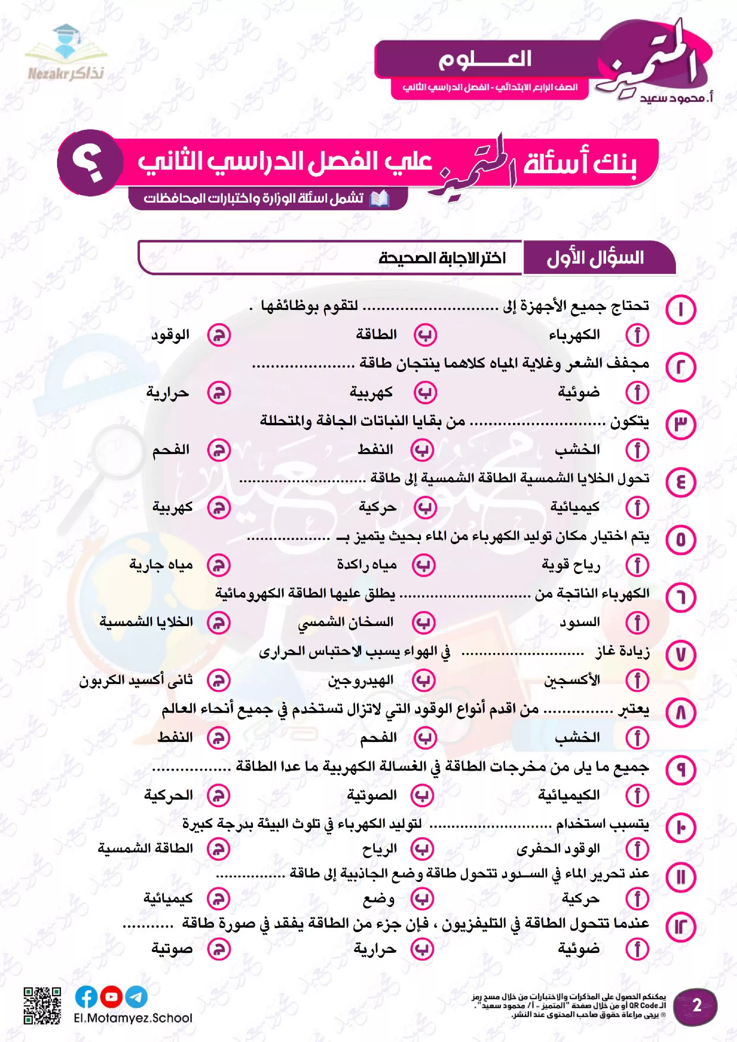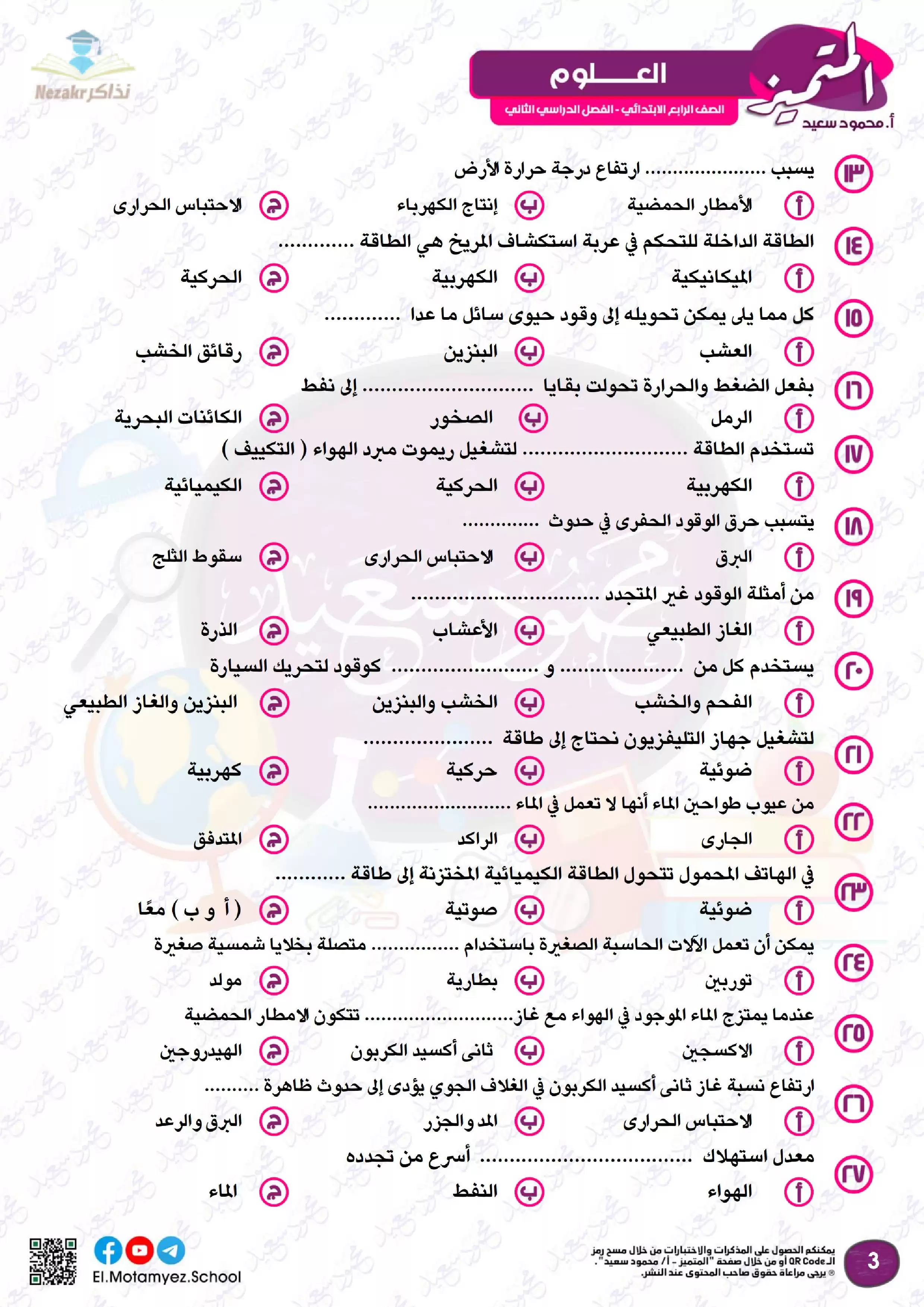ملف المراجعة النهائية وبنك الأسئلة لمادة العلوم للصف الرابع الابتدائي من المتميز من إعداد: أ. منى عزام و أ. ميلاد بخيت و أ. ماريو صلاح و أ. زينب عبدالعزيز