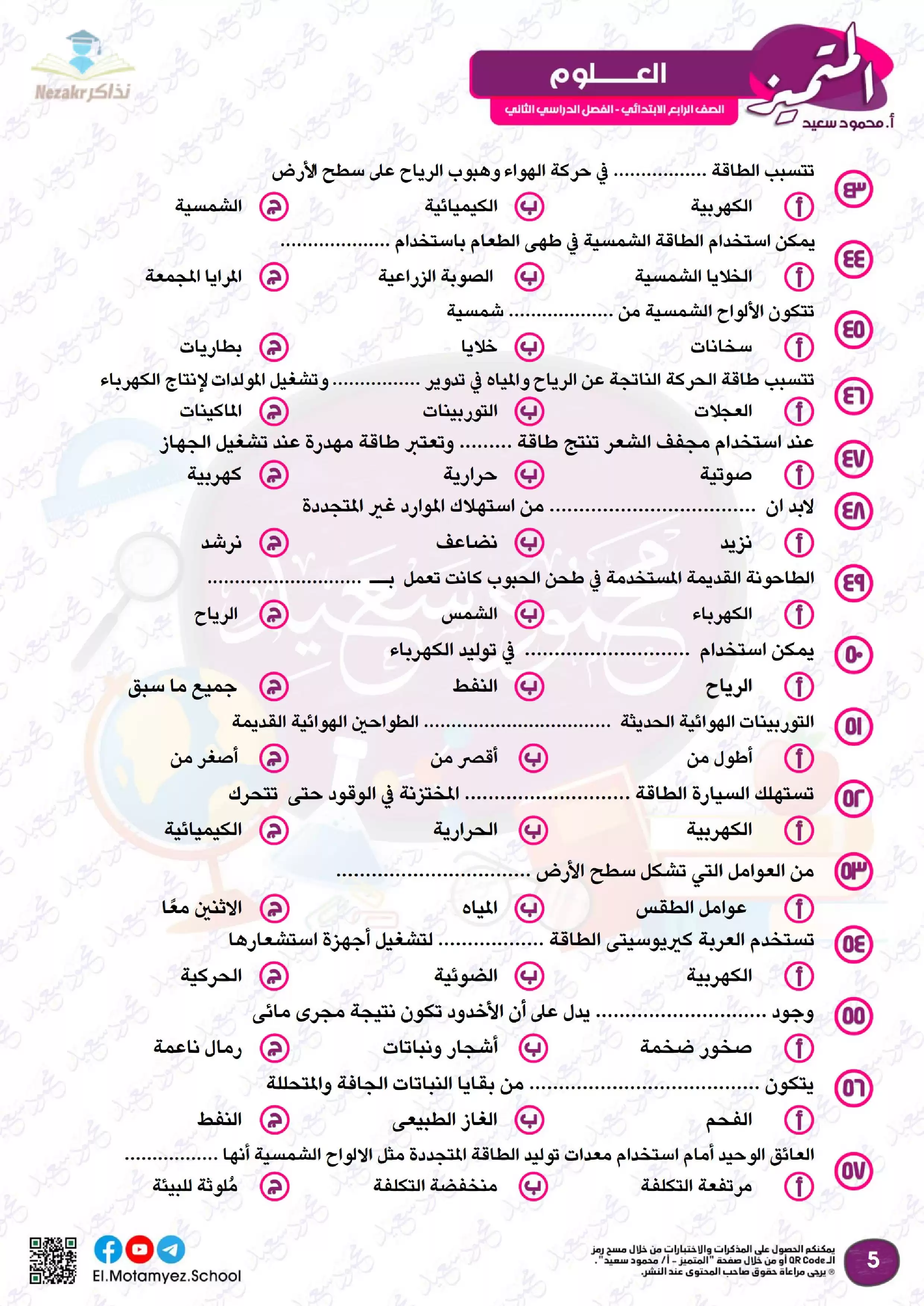 بيانات الملف: (مراجعة المتميز النهائية في مادة العلوم للصف الرابع الابتدائي الترم الثاني - Nezakr)