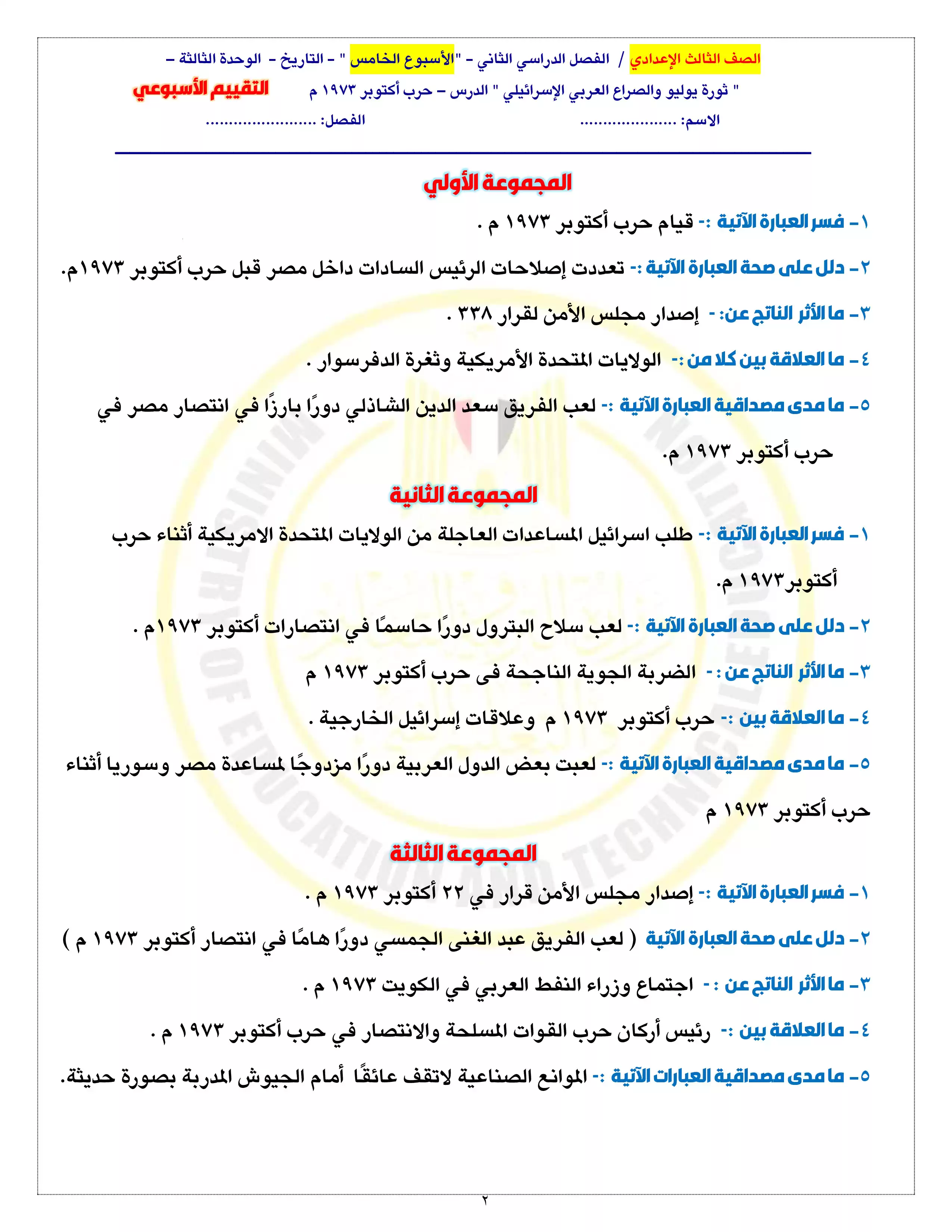 صفحة 2 من 3 صفحة من ملف: التقييمات والآداءات الصفية والمنزلية الخاصة بالأسبوع الخامس في الدراسات الاجتماعية للصف الثالث الاعدادي الترم الثاني 2025 - Nezakr