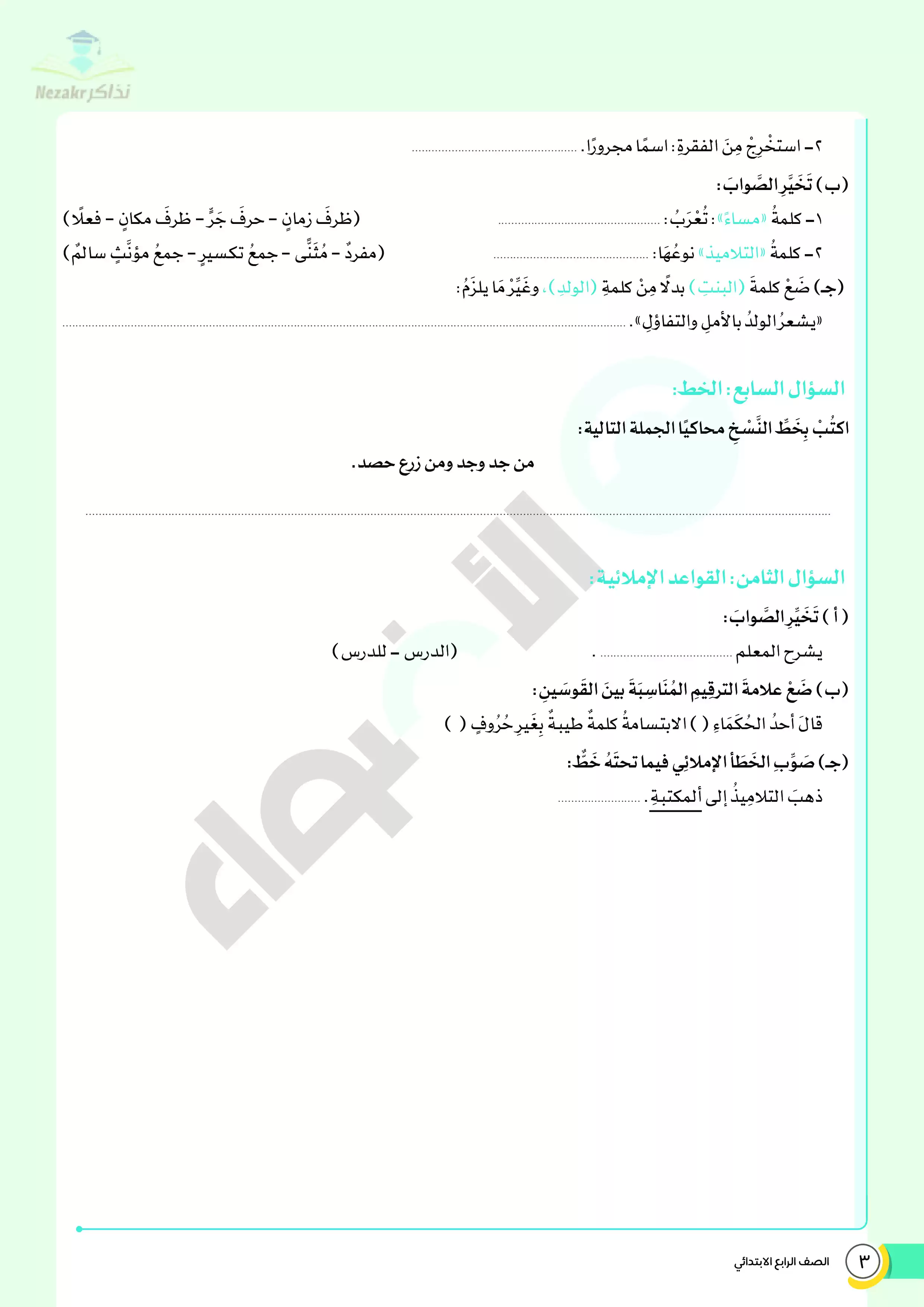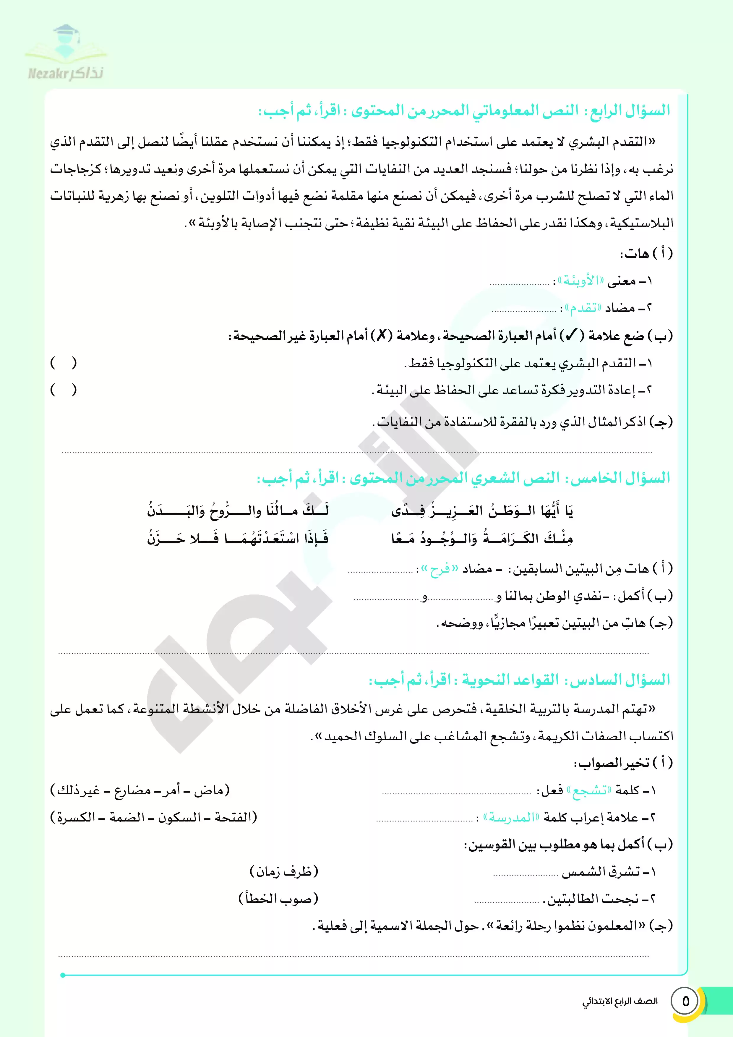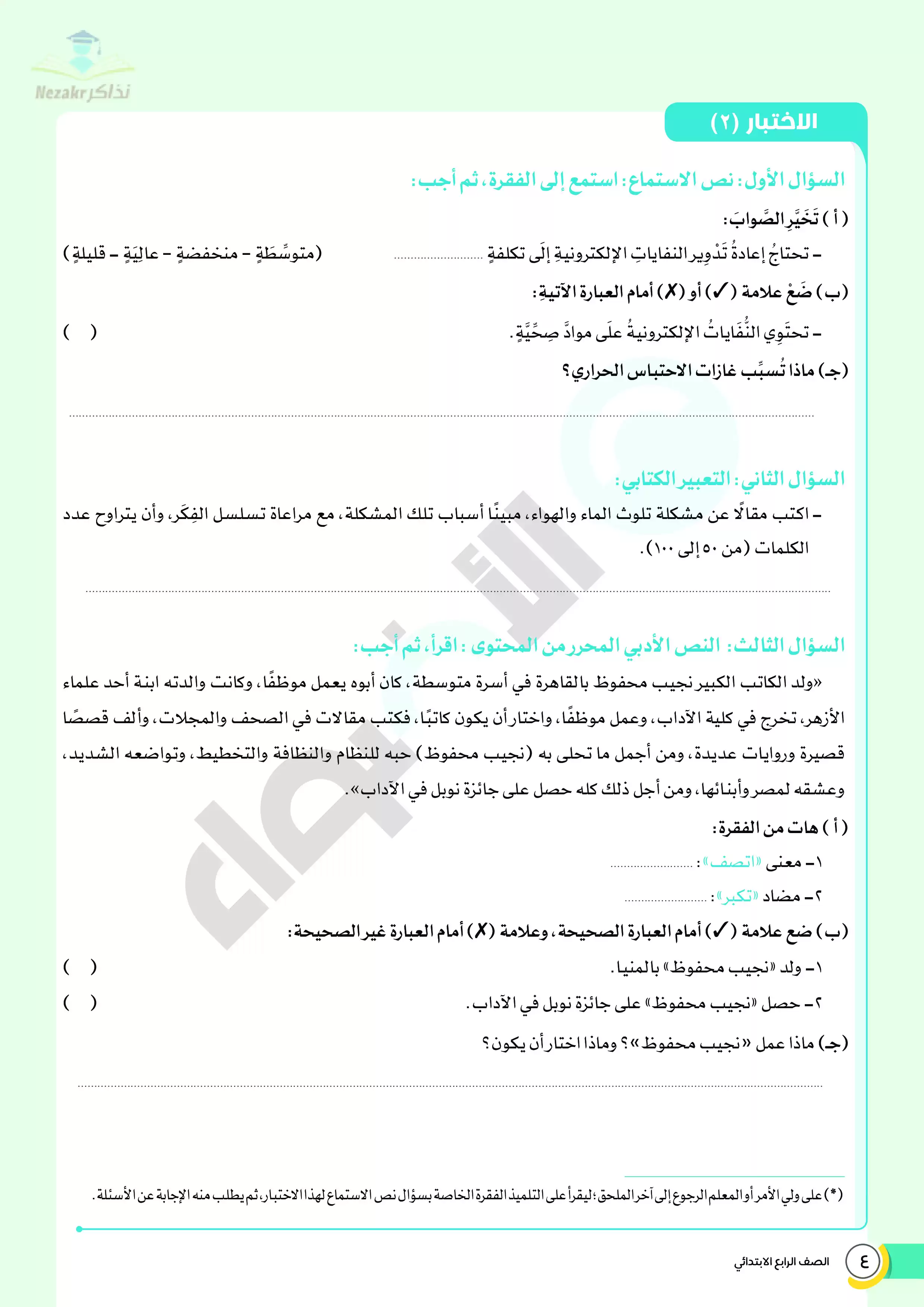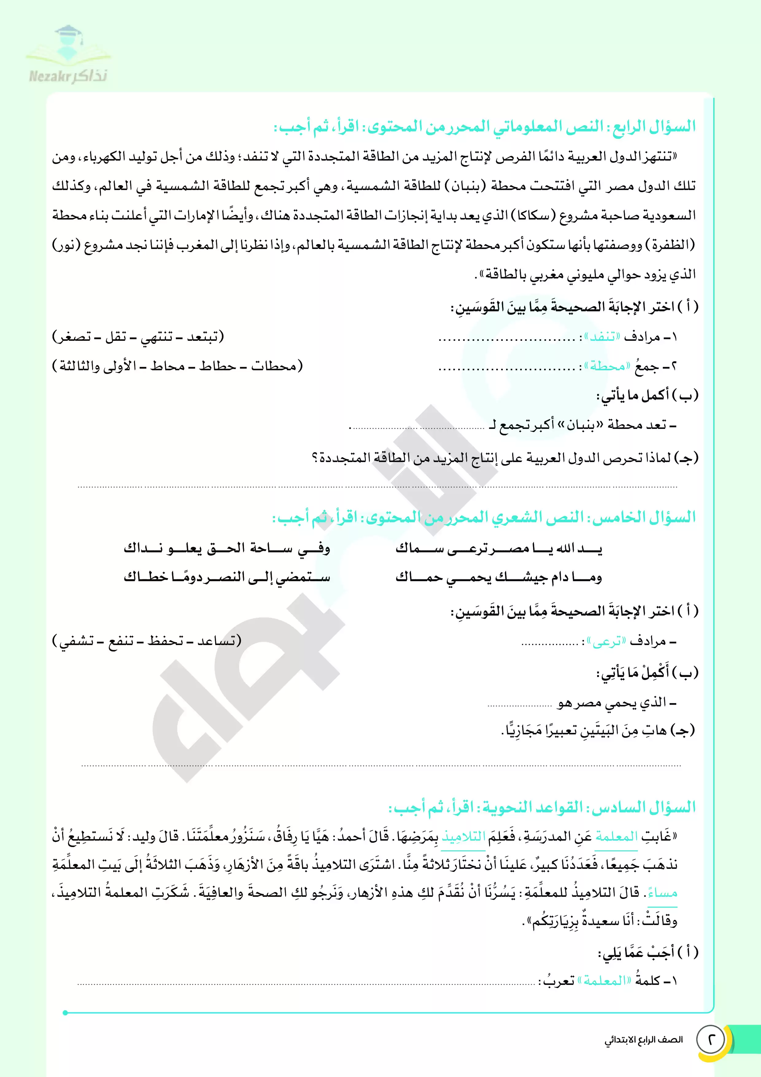 | بيانات الملف: (نماذج اختبارات ومراجعة الأضواء النهائية في مادة اللغة العربية للصف الرابع الابتدائي الترم الثاني - Nezakr) | |