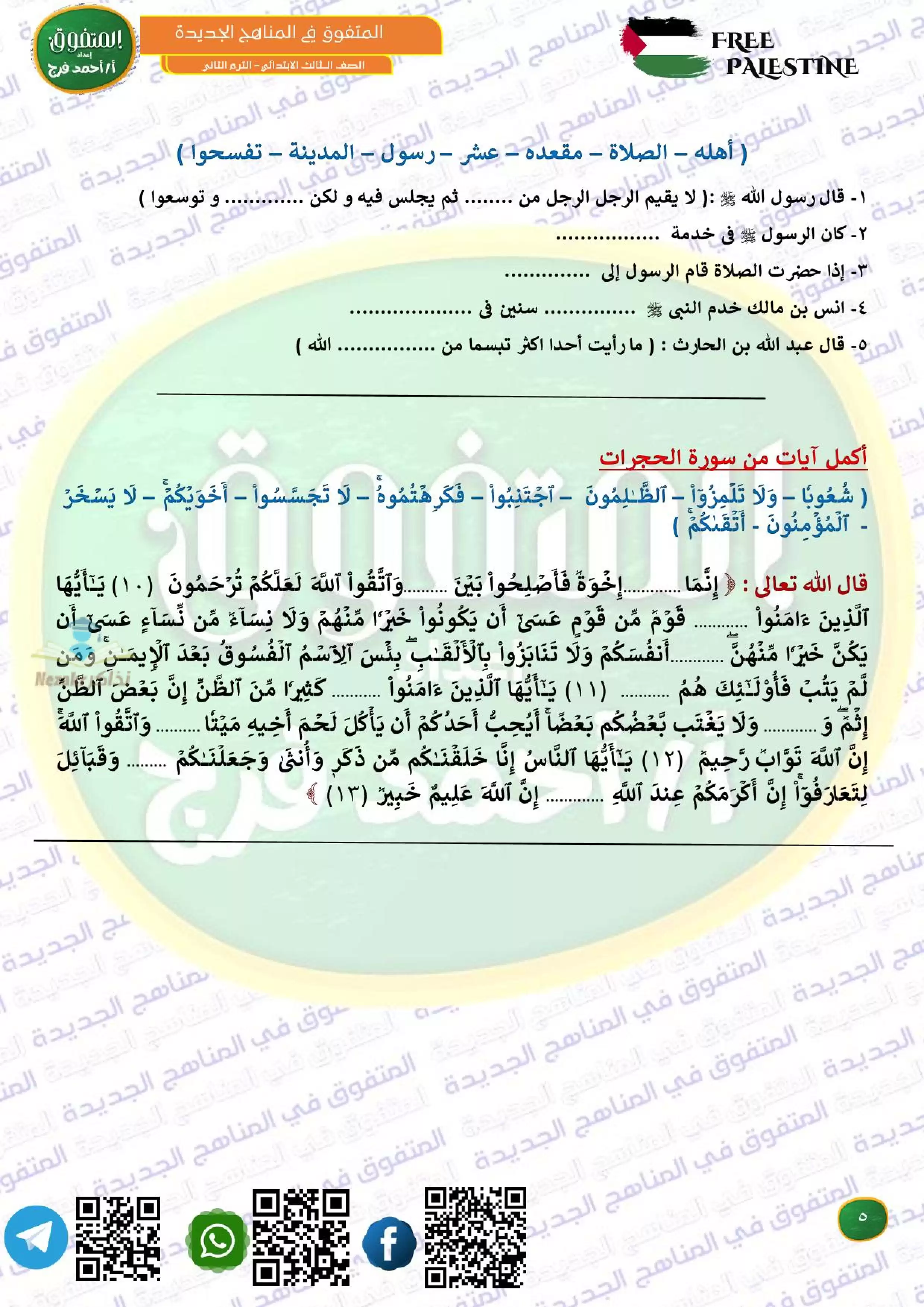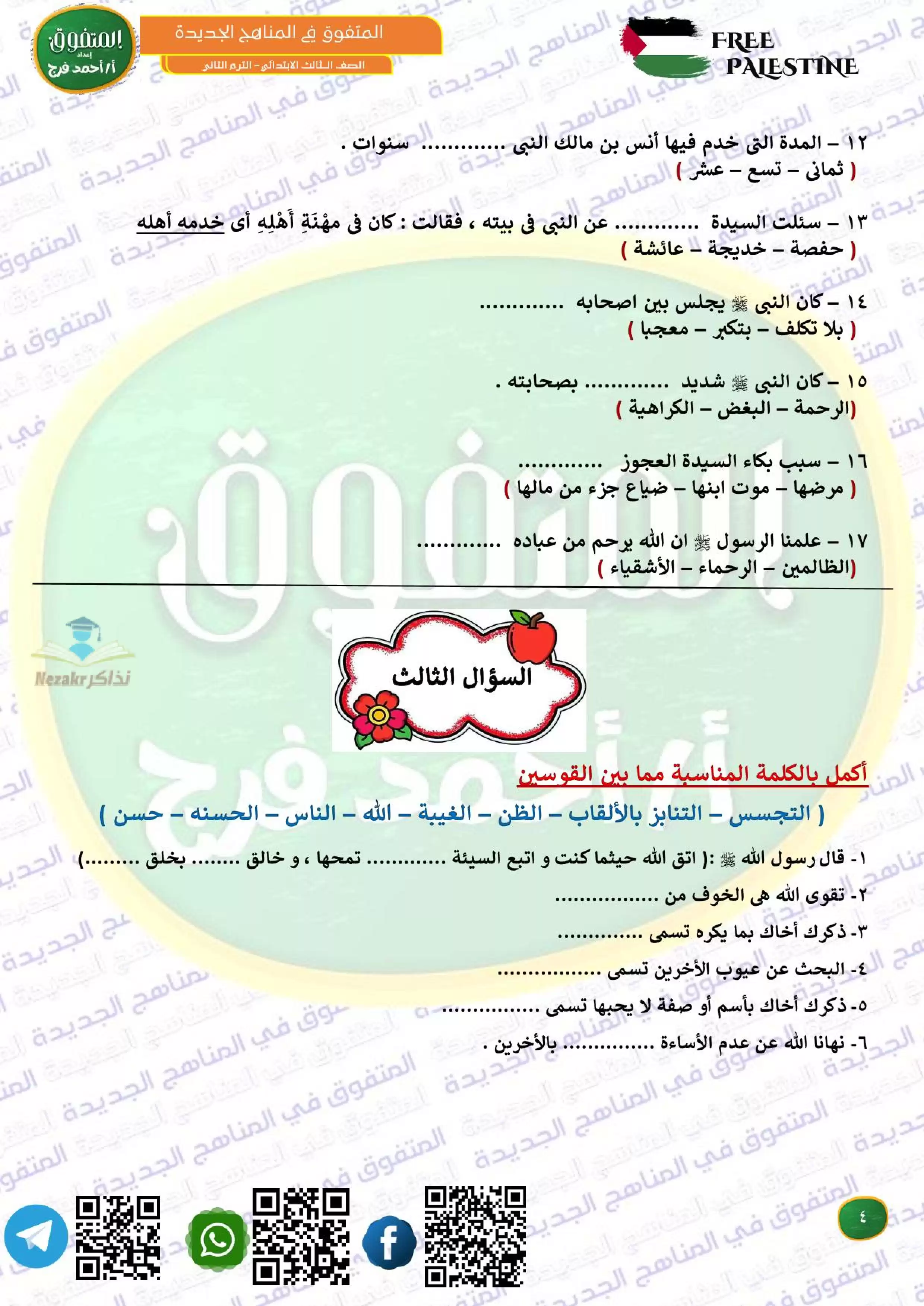 ملف المراجعة النهائية في التربيه الدينيه للصف الثالث الابتدائي ترم 2 مقرر فبراير من المتفوق من إعداد: مستر أحمد فرج.