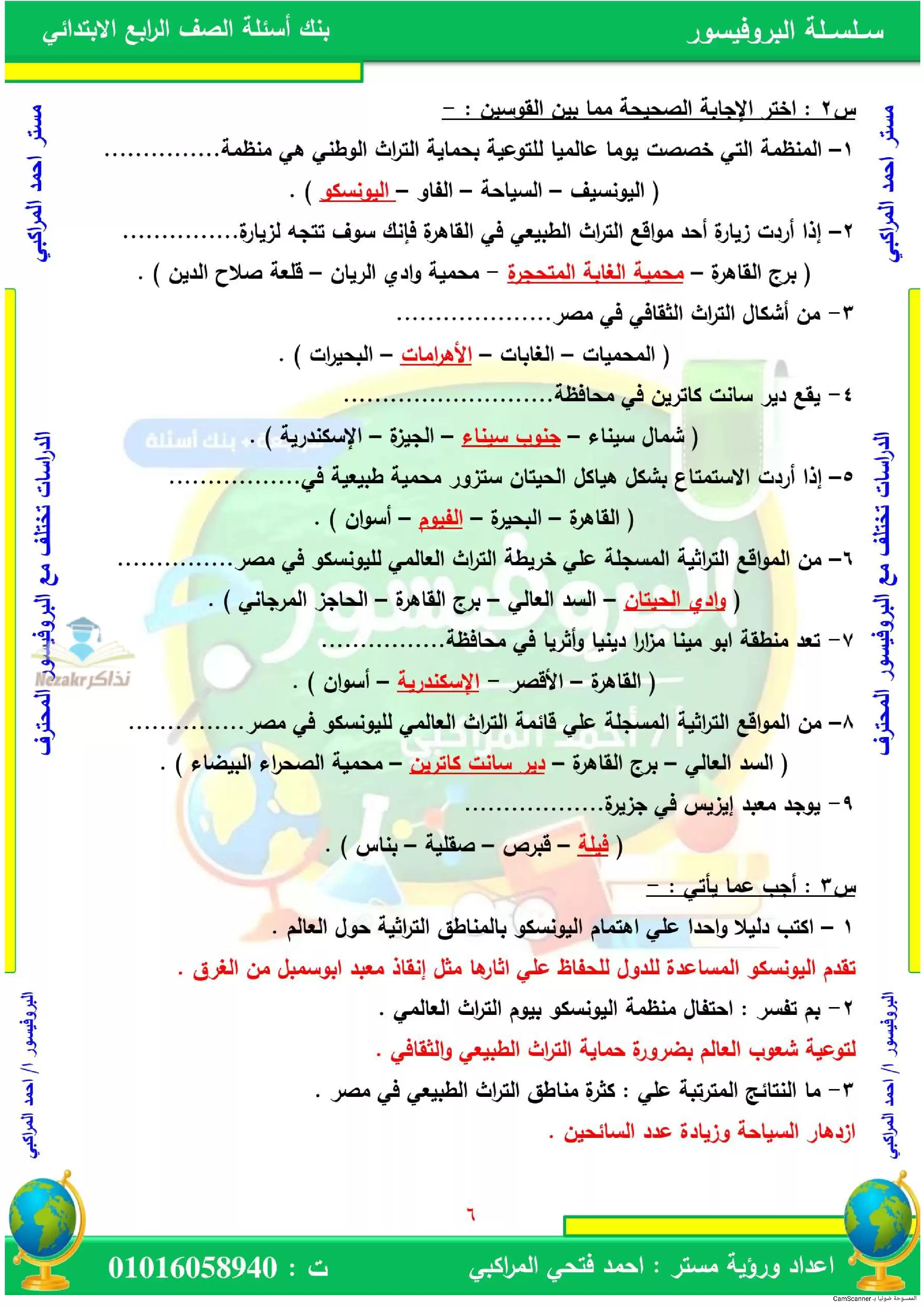 بيانات الملف: (بنك أسئلة على درس المواقع التراثية في بلدنا لرابعة ابتدائي - Nezakr)