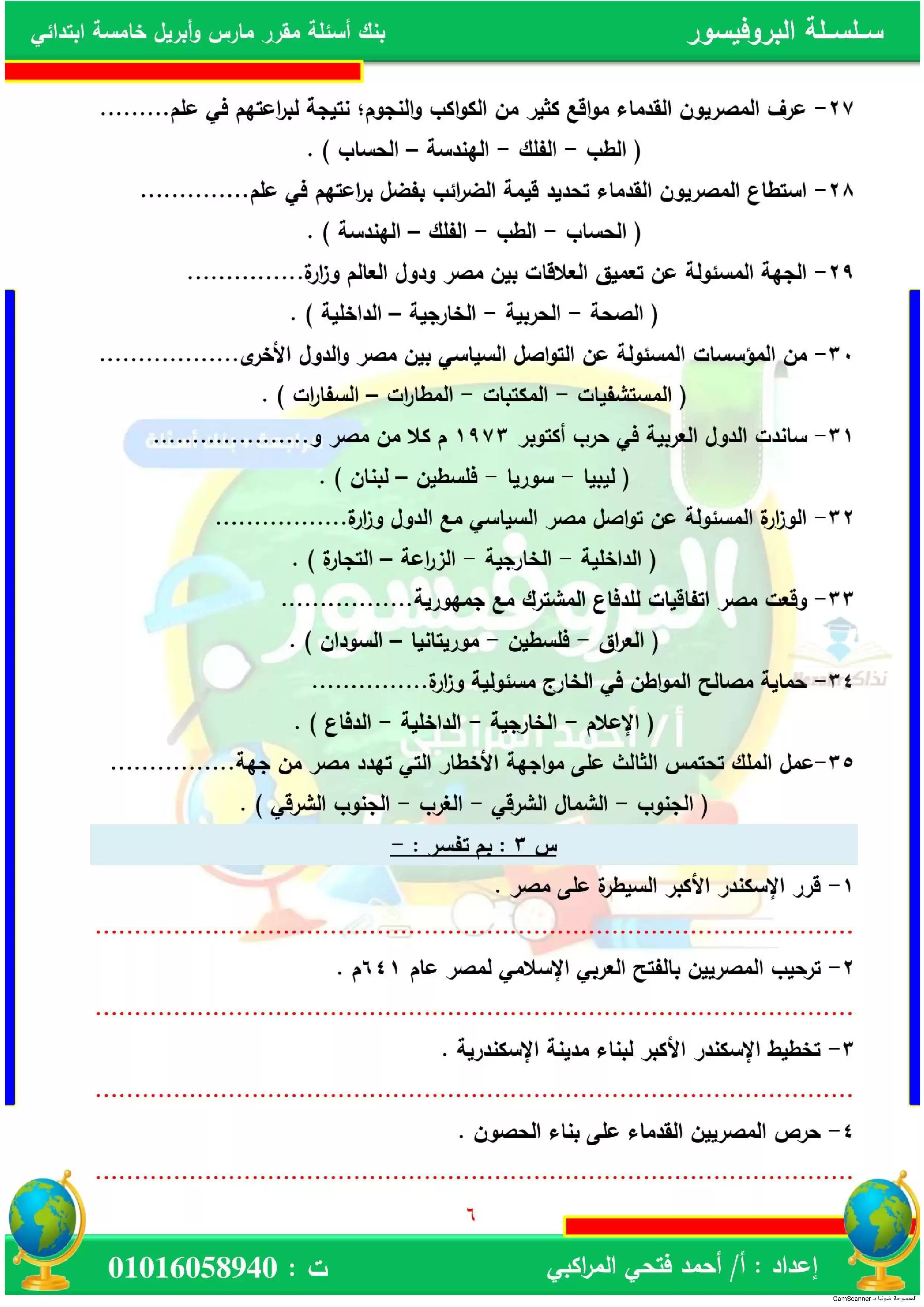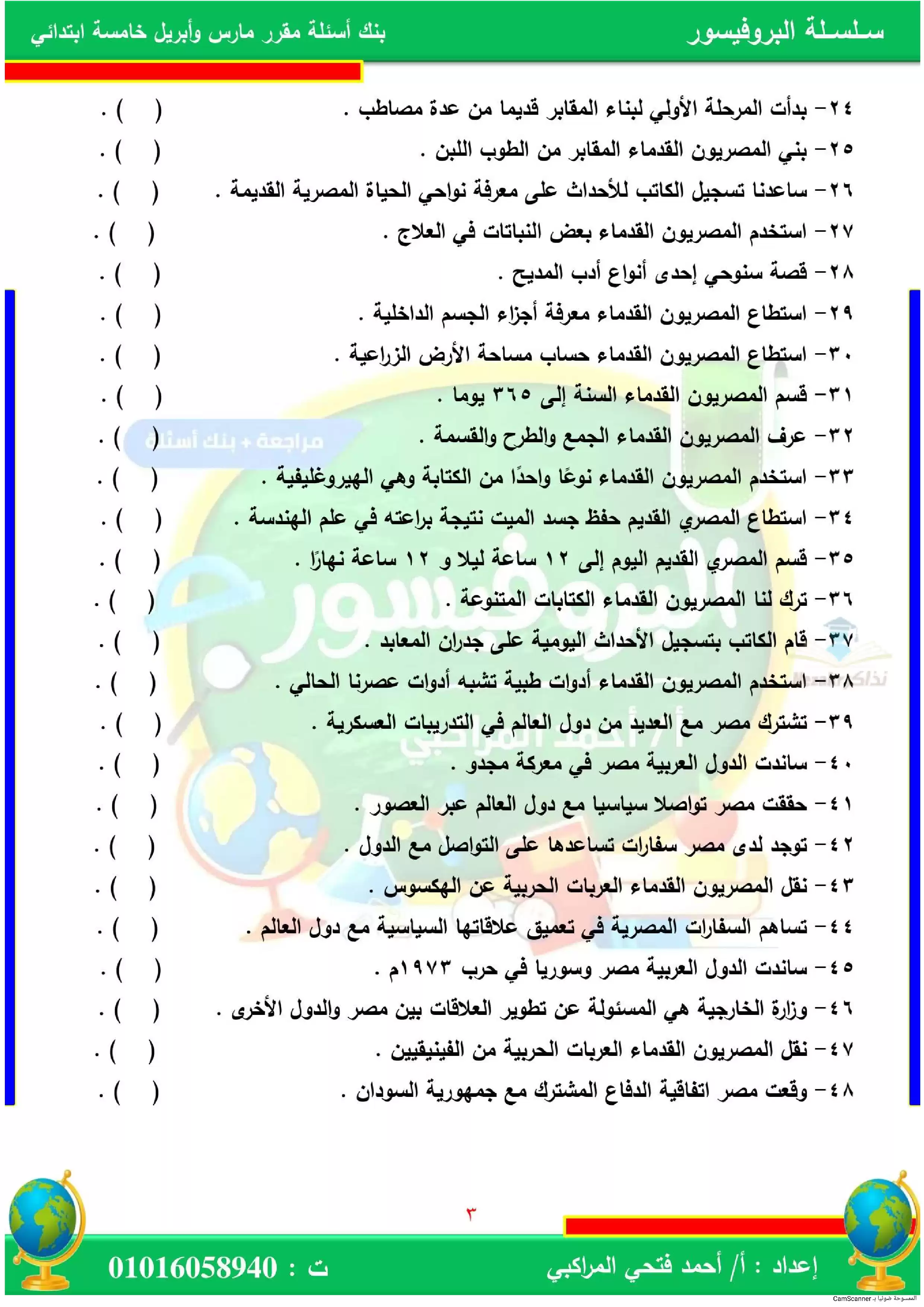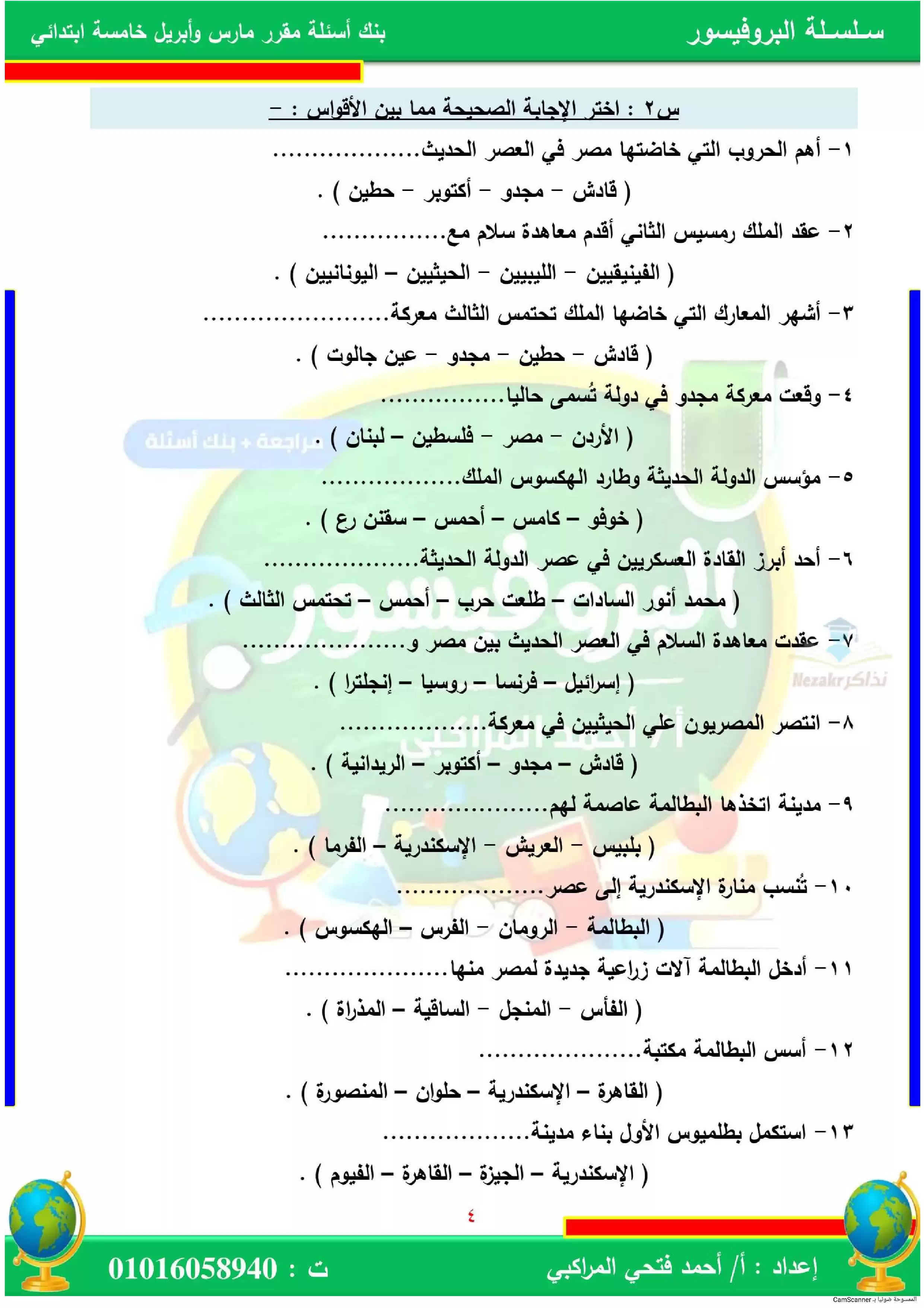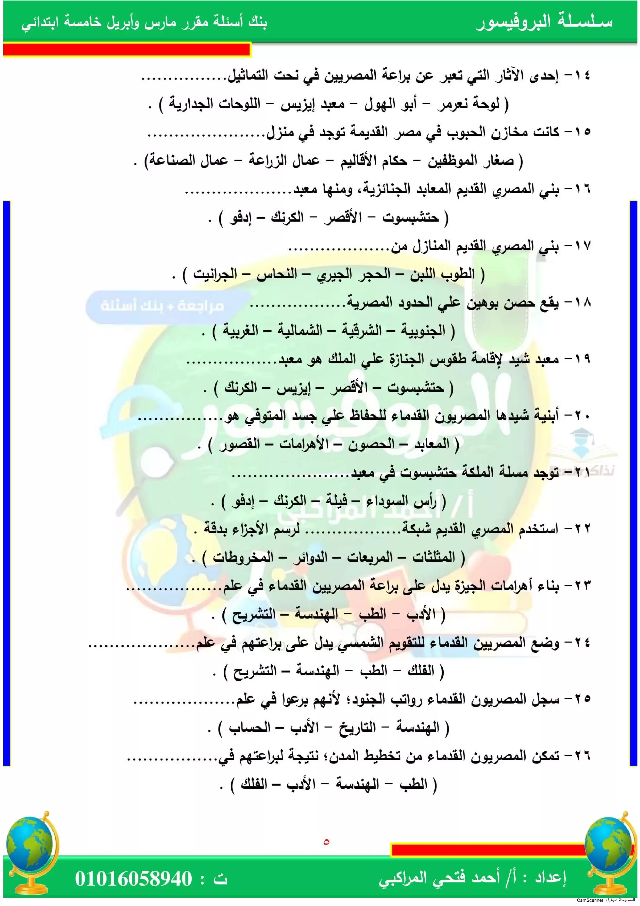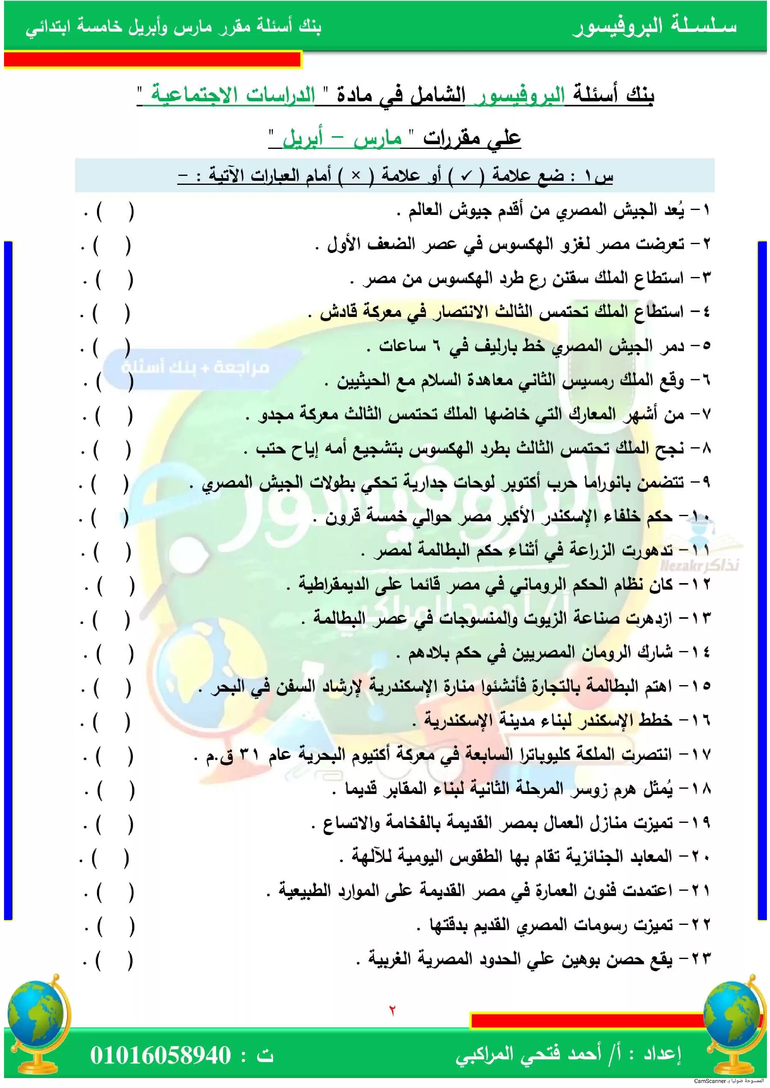 | بيانات الملف: (بنك أسئلة على مقرر مارس وأبريل في الدراسات الاجتماعية للصف الخامس الابتدائي (البروفيسور) - Nezakr) | |