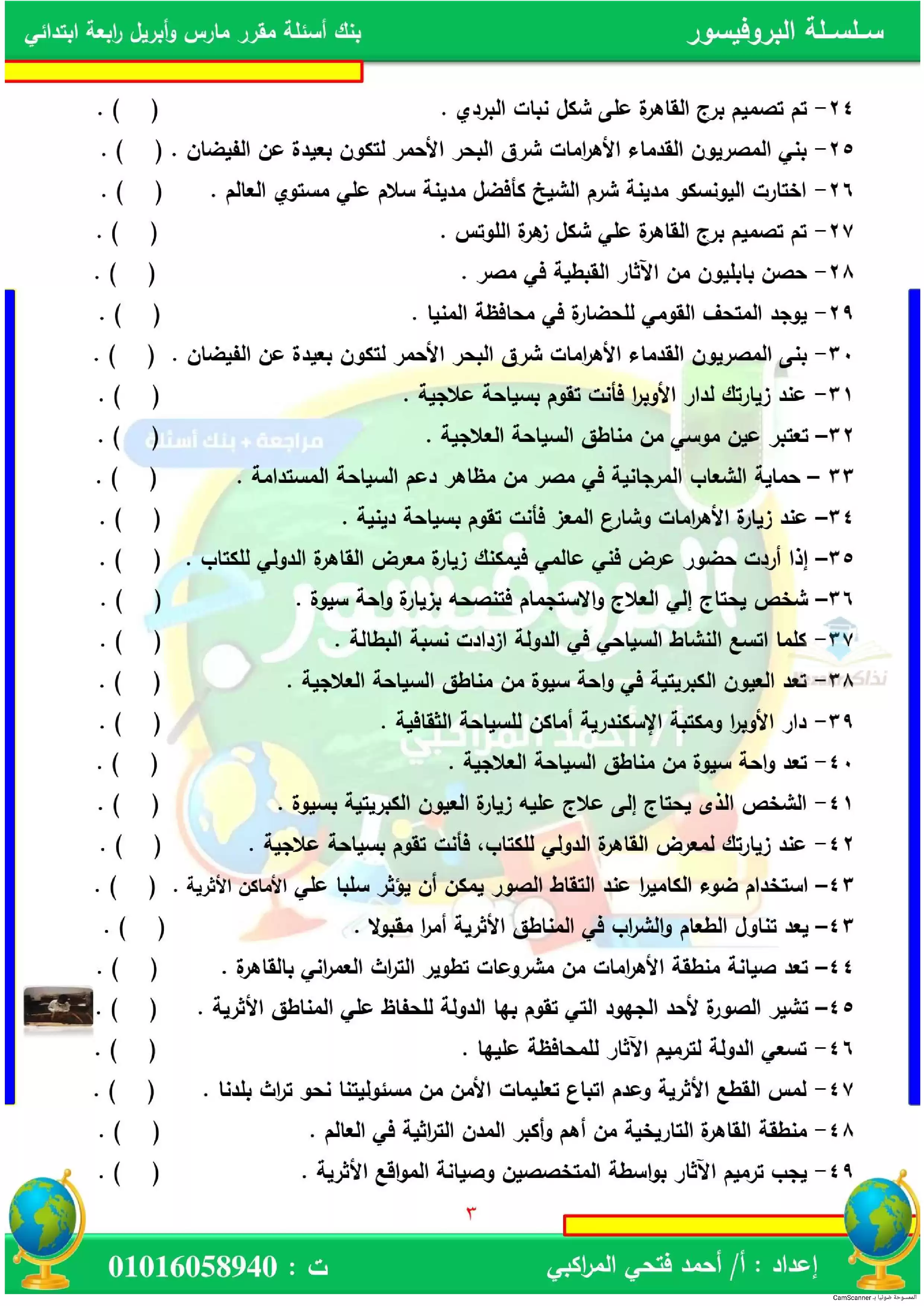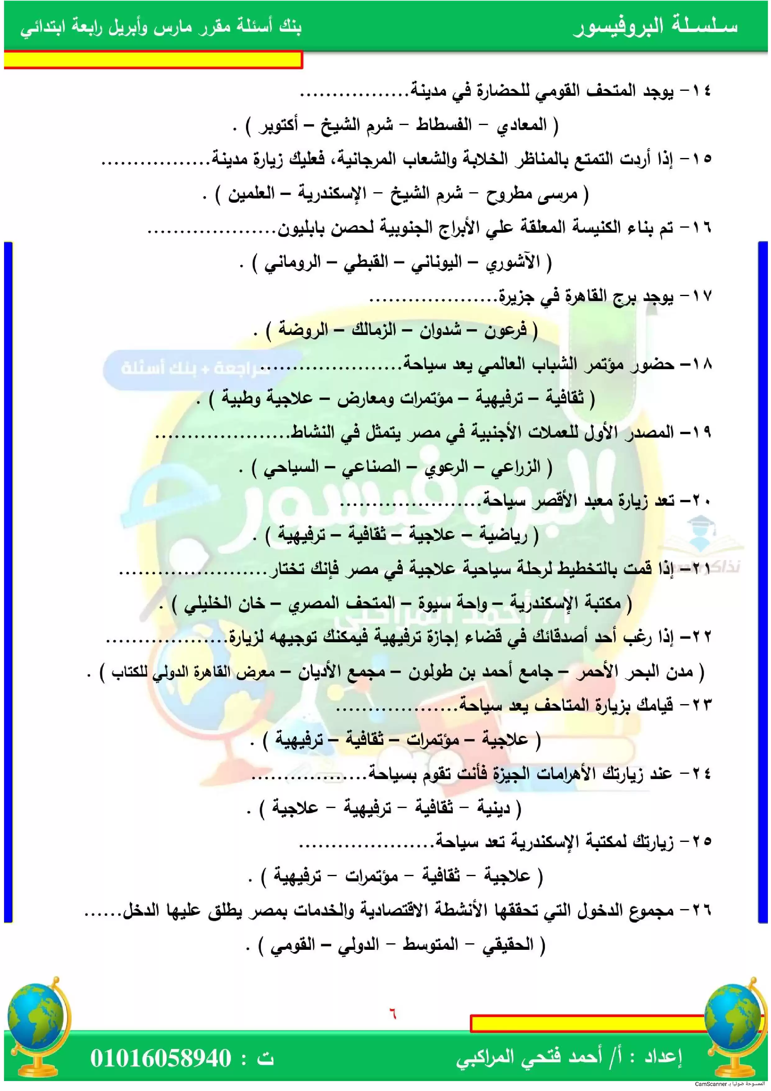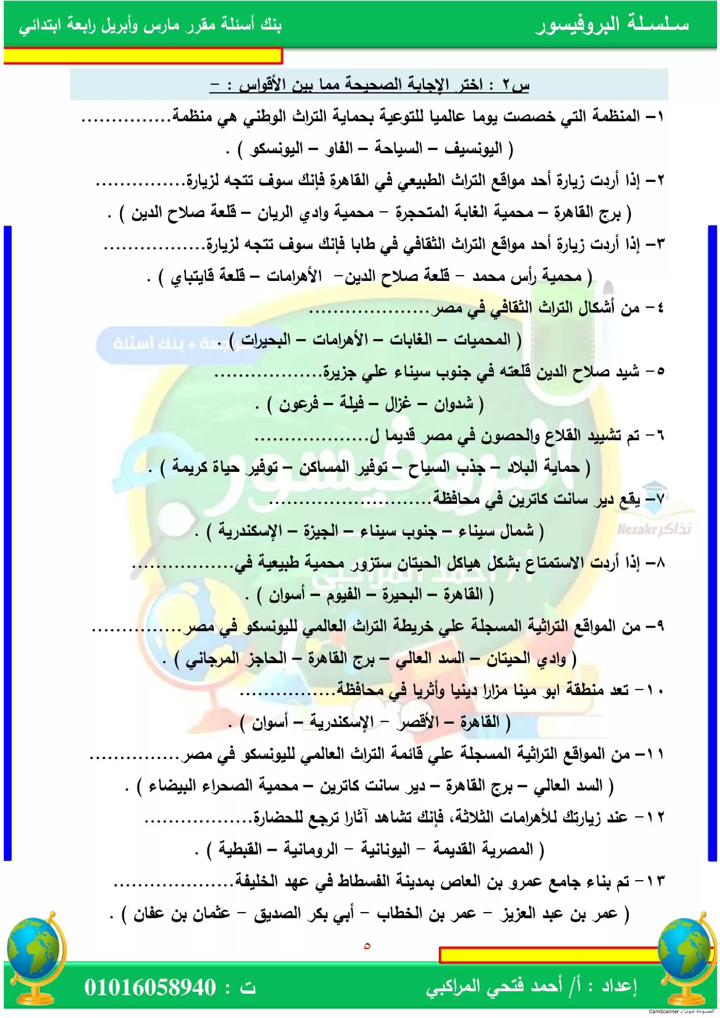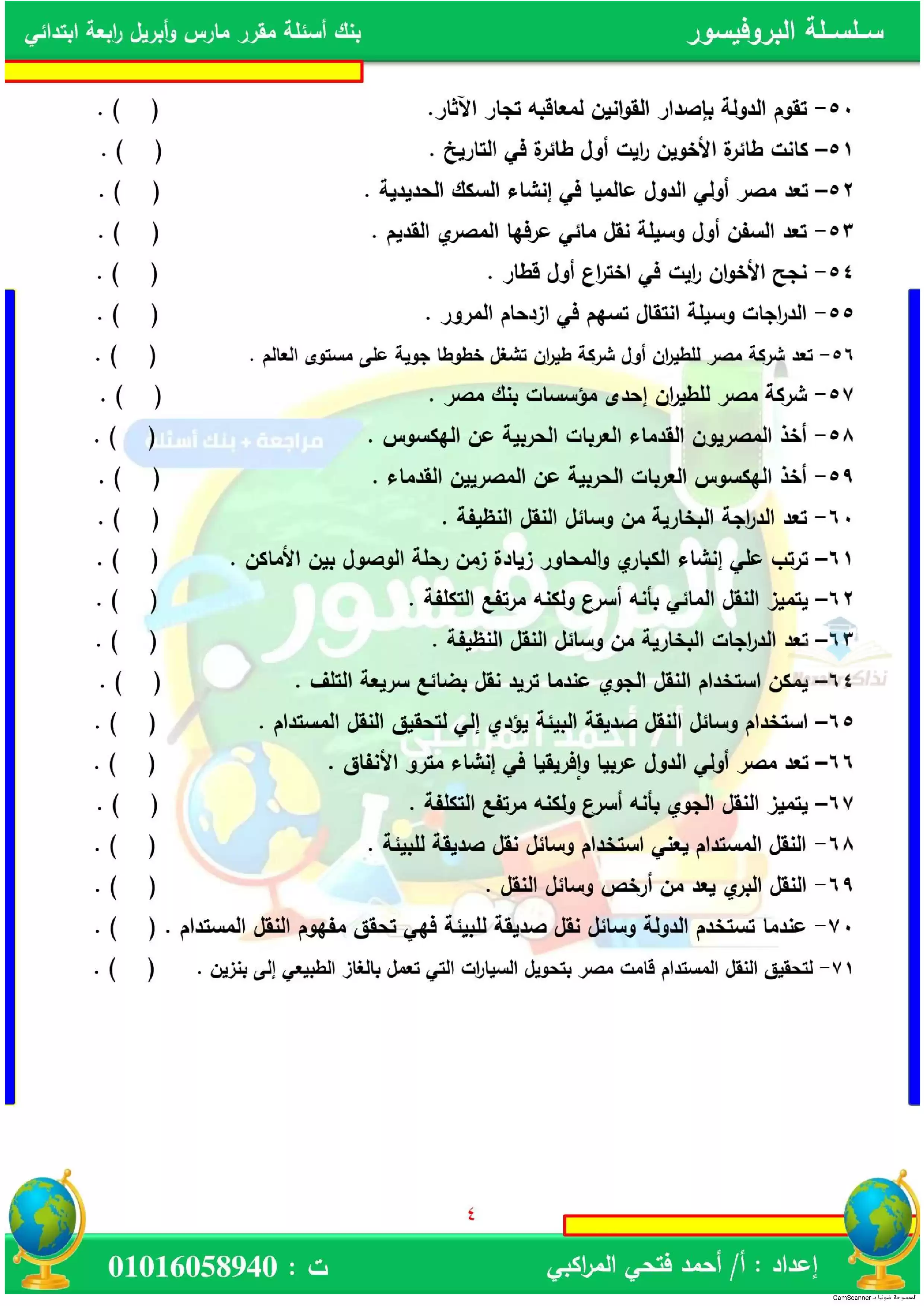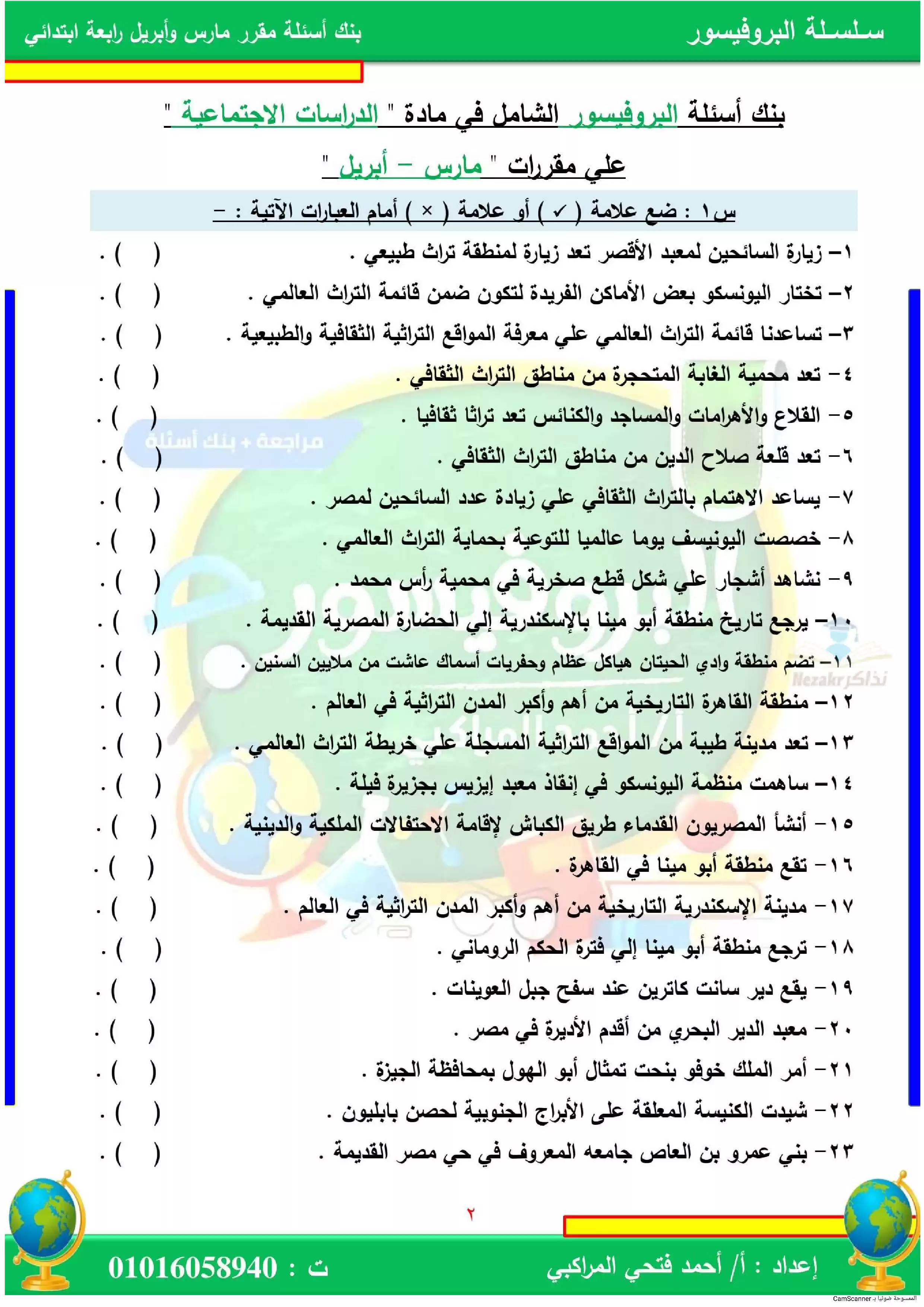 بيانات الملف: (بنك أسئلة على مقرر مارس وأبريل في الدراسات الاجتماعية للصف الرابع الابتدائي (البروفيسور) - Nezakr)