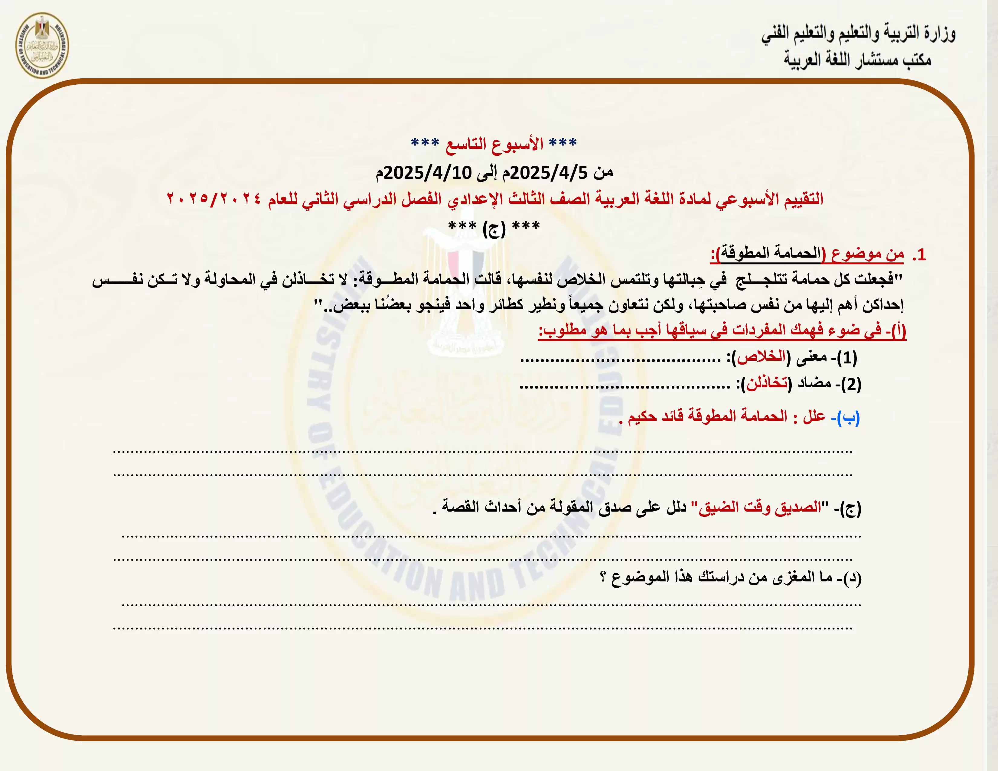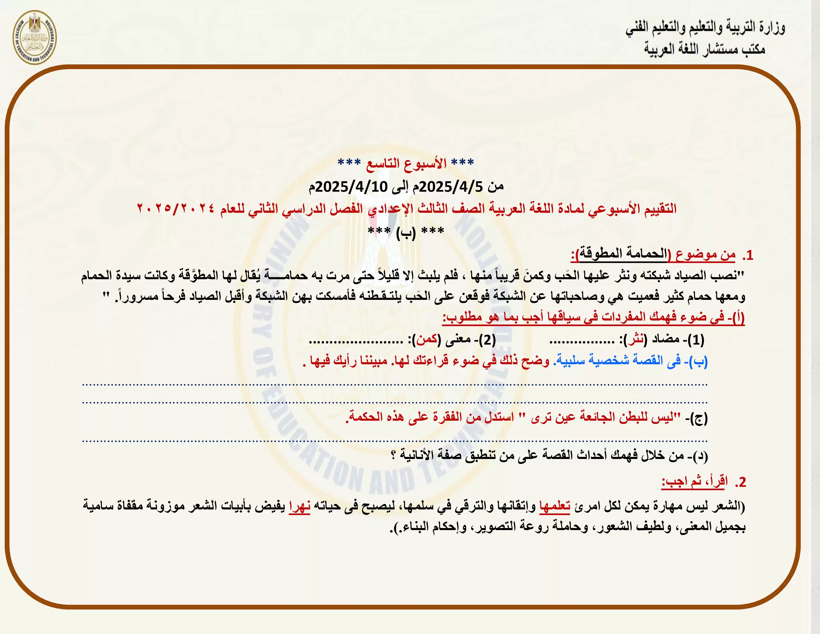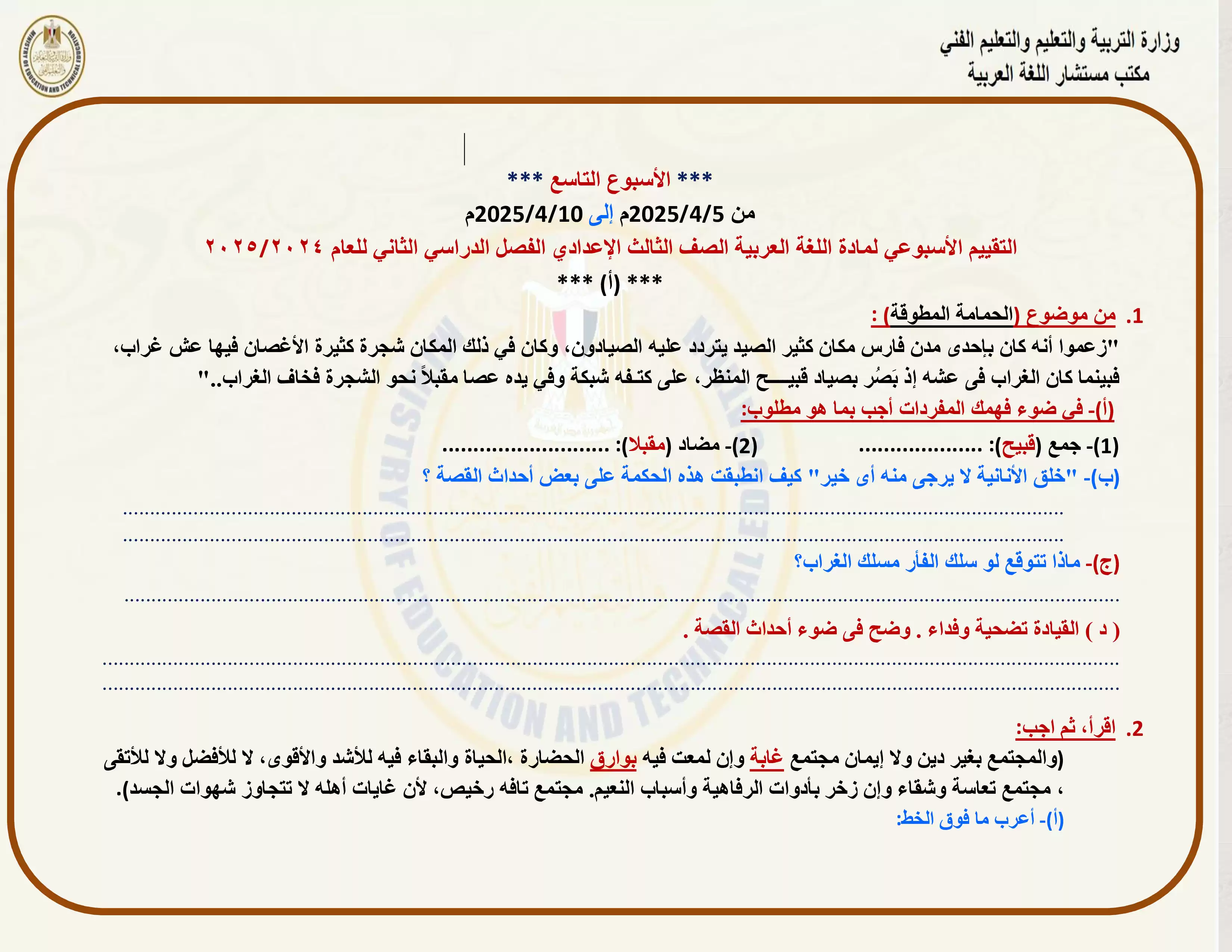 | بيانات الملف: (التقييمات الخاصة بالأسبوع التاسع في اللغة العربية للصف الثالث الاعدادي الترم الثاني 2025 - Nezakr) | |