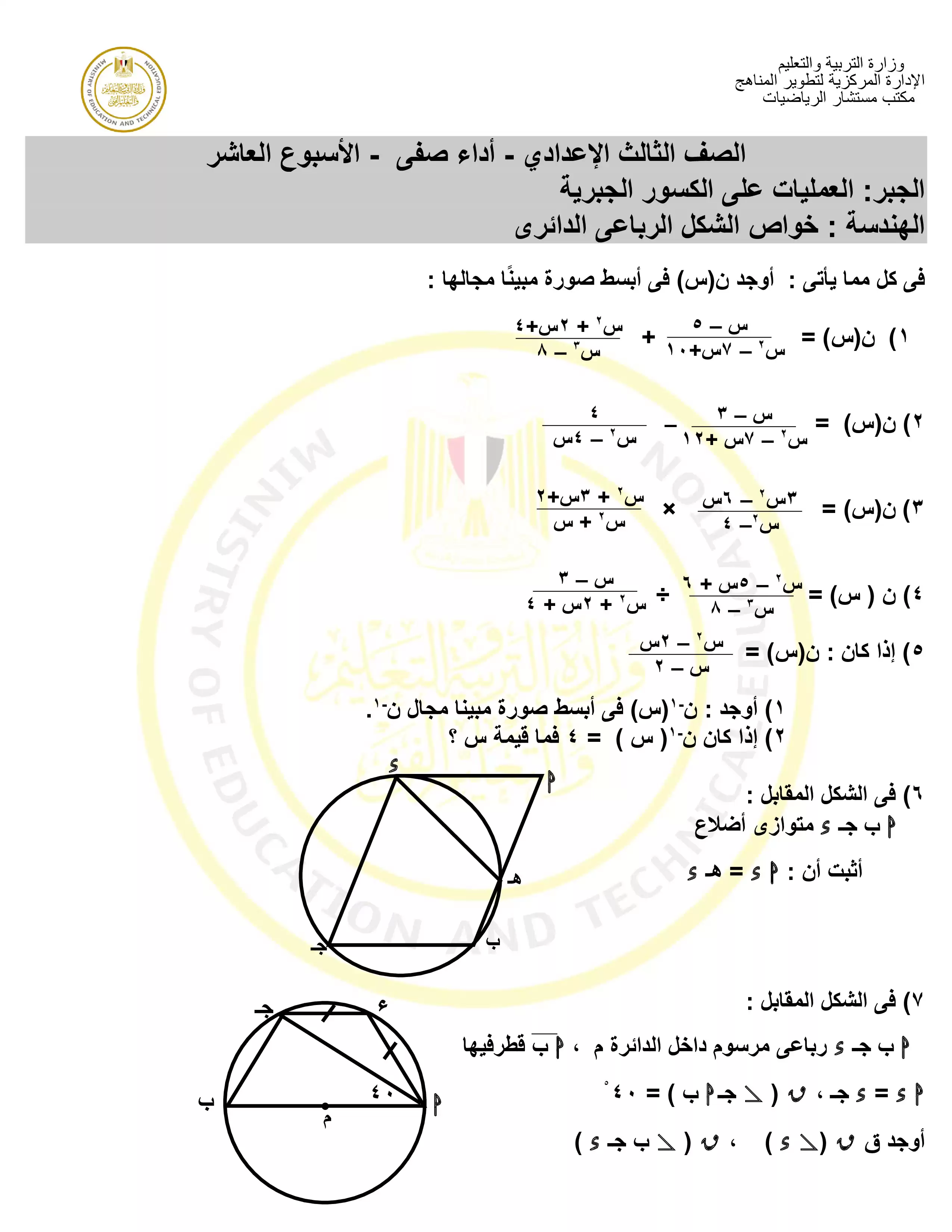 بيانات الملف: (الآداءات الصفية للأسبوع العاشر في الرياضيات للصف الثالث الإعدادي الترم الثاني 2025 - Nezakr)
