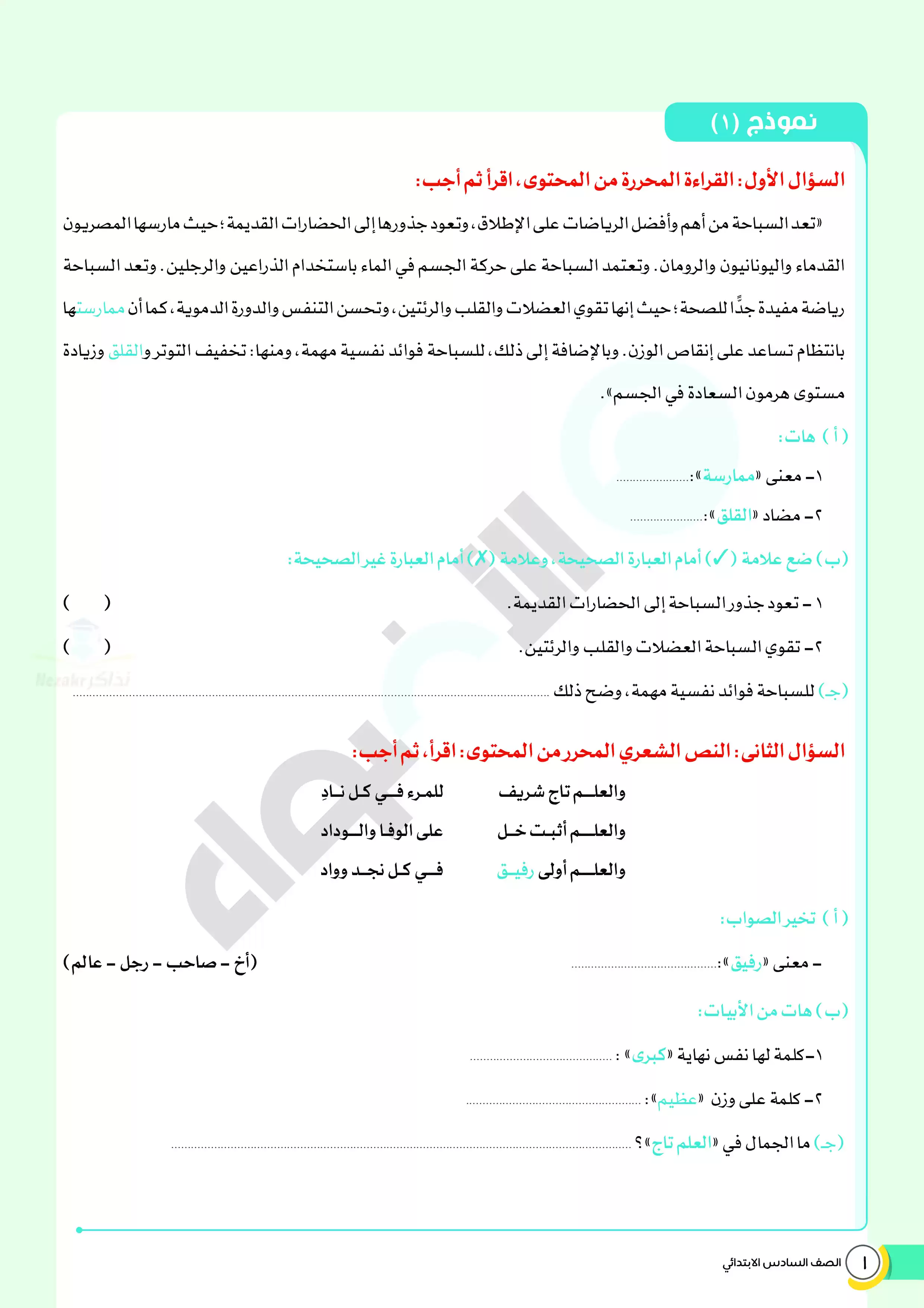 1. نماذج امتحانات استرشادية من كتاب الأضواء على منهج العربي المقرر في شهر ابريل للصف السادس الابتدائي.
