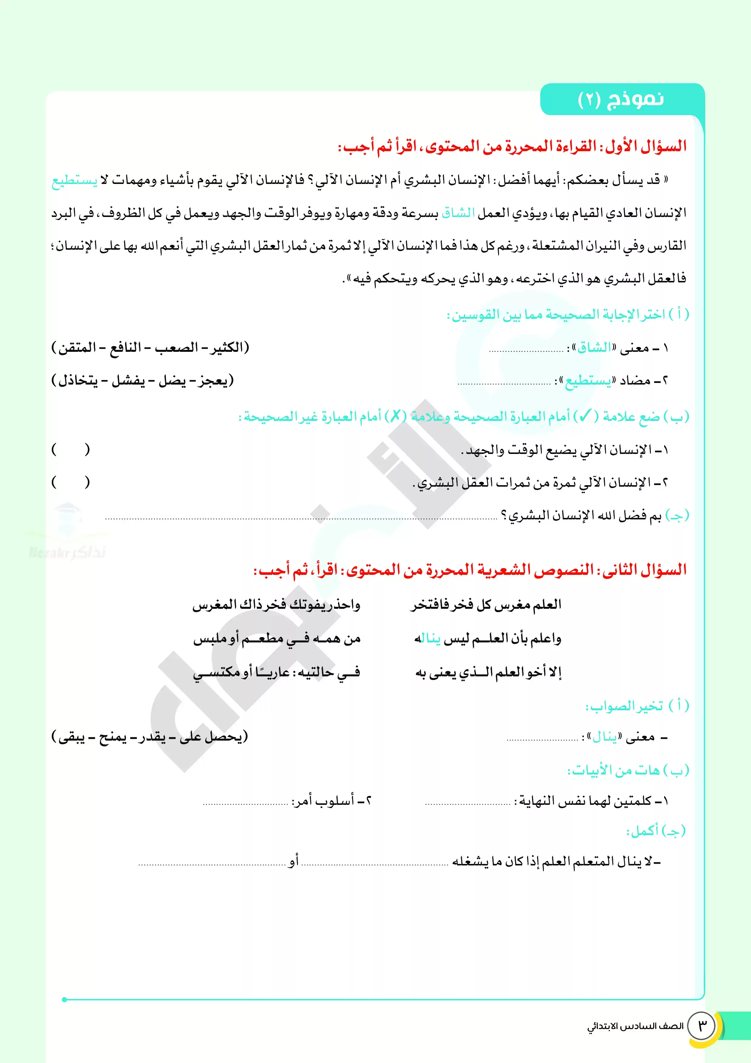صفحة 3 من 16 صفحة من ملف: اختبارات الأضواء الاسترشادية في العربي للصف السادس الابتدائي مقرر أبريل 2025 بالاجابات - Nezakr