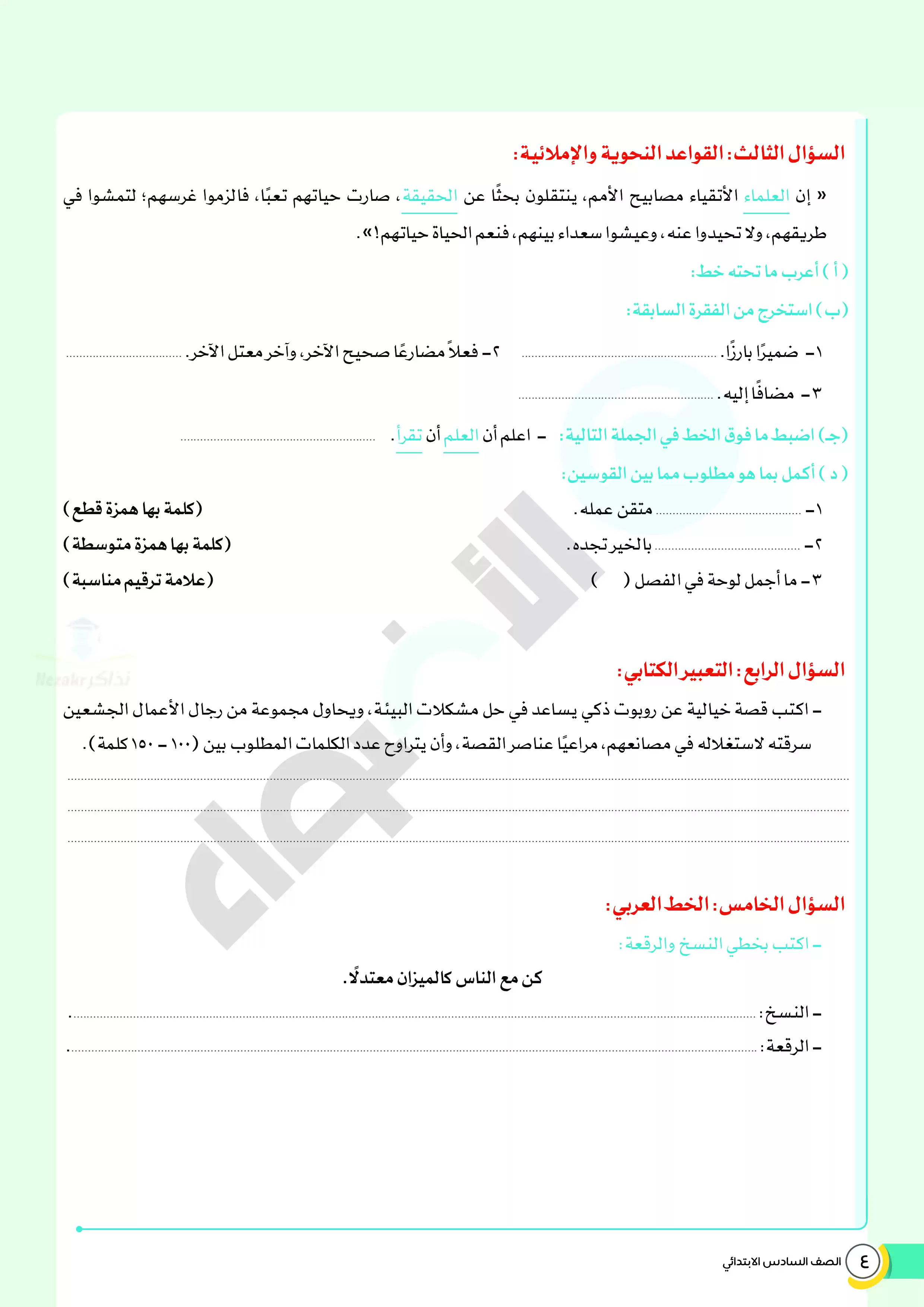 صفحة 4 من 16 صفحة من ملف: اختبارات الأضواء الاسترشادية في العربي للصف السادس الابتدائي مقرر أبريل 2025 بالاجابات - Nezakr