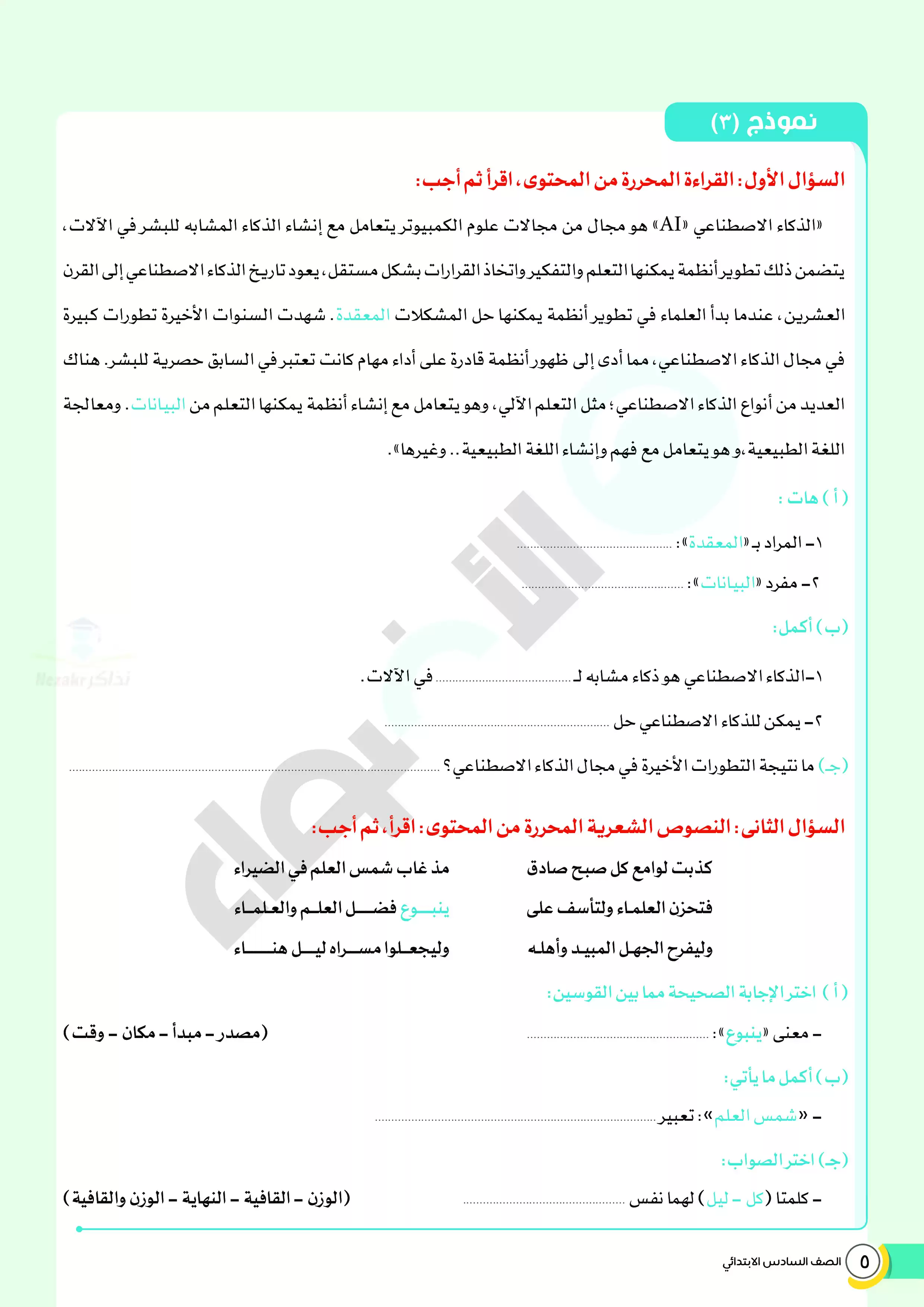 الصف السادس الإبتدائي > اللغة العربية > اختبارات الأضواء الاسترشادية في العربي لسادسه ابتدائي على مقرر شهر أبريل 2025 بصيغة PDF
