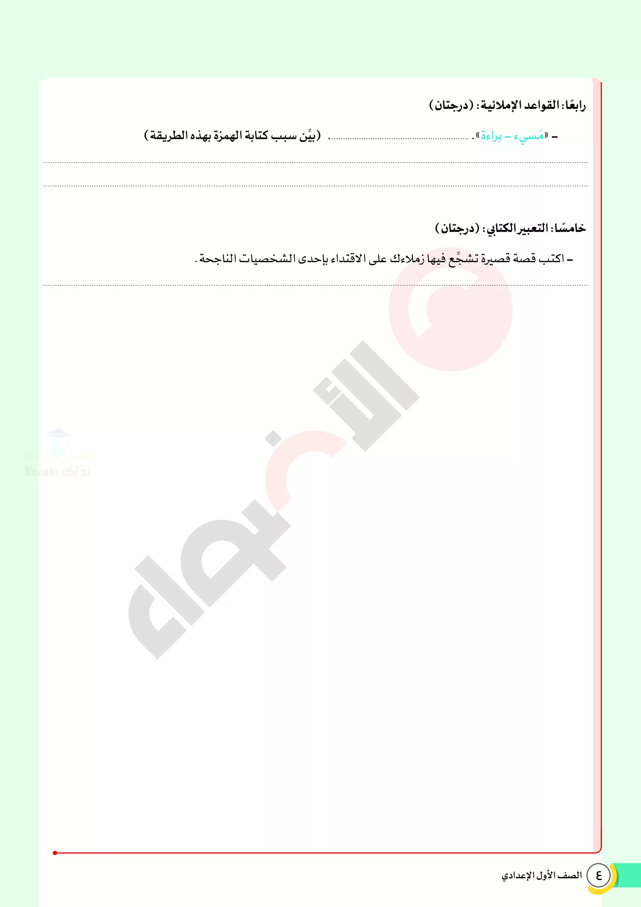 1. نماذج امتحانات استرشادية من كتاب الأضواء على منهج العربي المقرر في شهر ابريل للصف الأول الإعدادي.