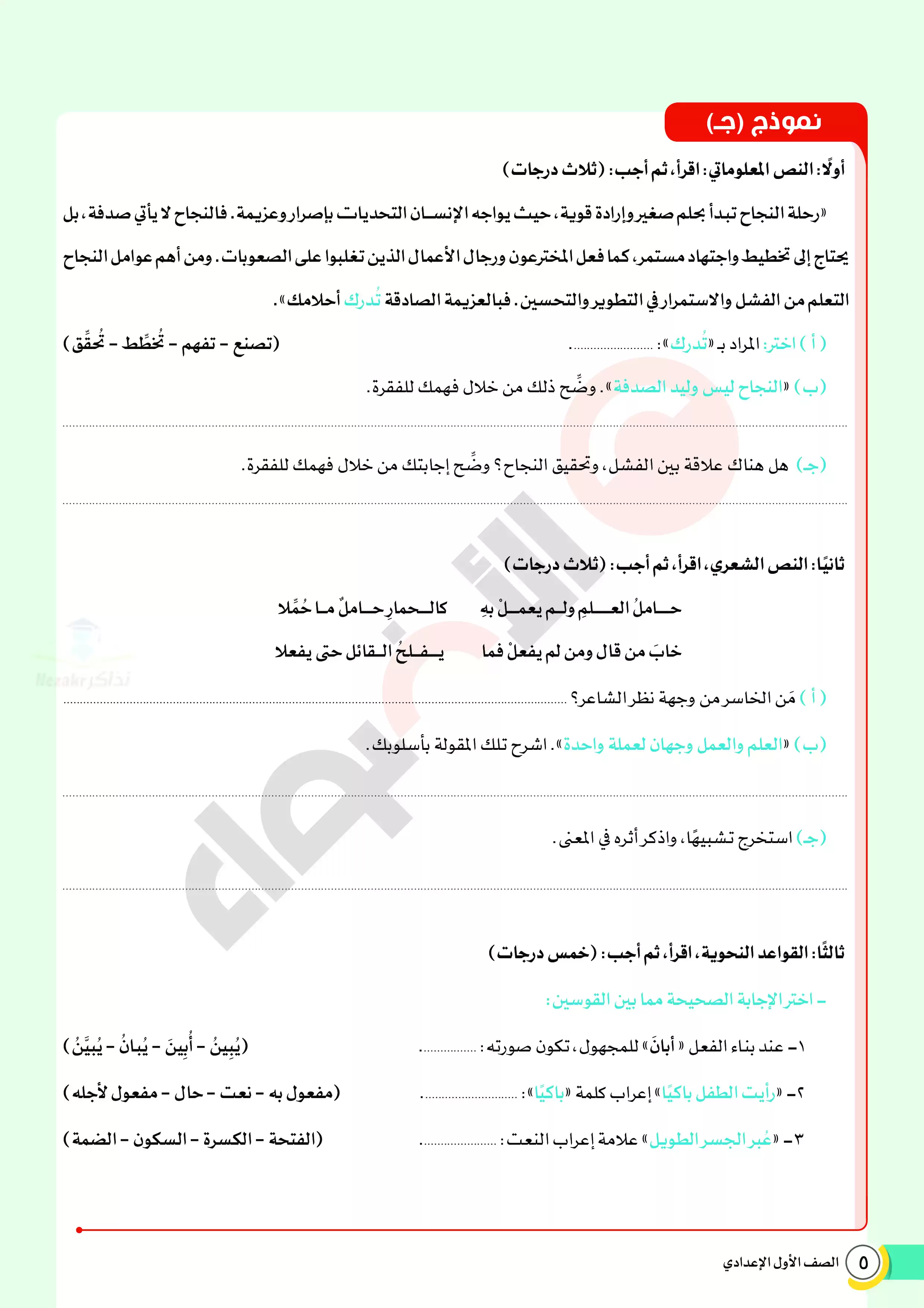 بيانات الملف: (اختبارات الأضواء الاسترشادية في العربي للصف الاول الاعدادي مقرر أبريل 2025 بالاجابات - Nezakr)