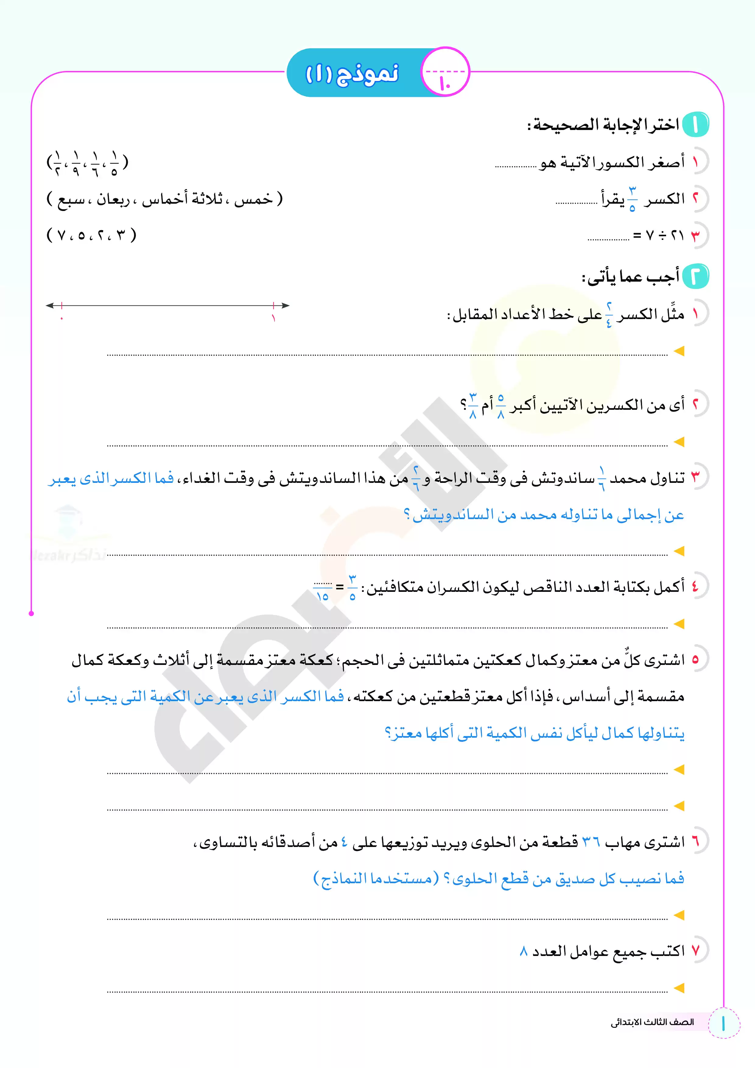 1. نماذج امتحانات استرشادية من كتاب الأضواء على منهج الرياضيات المقرر في شهر ابريل للصف الثالث الابتدائي.