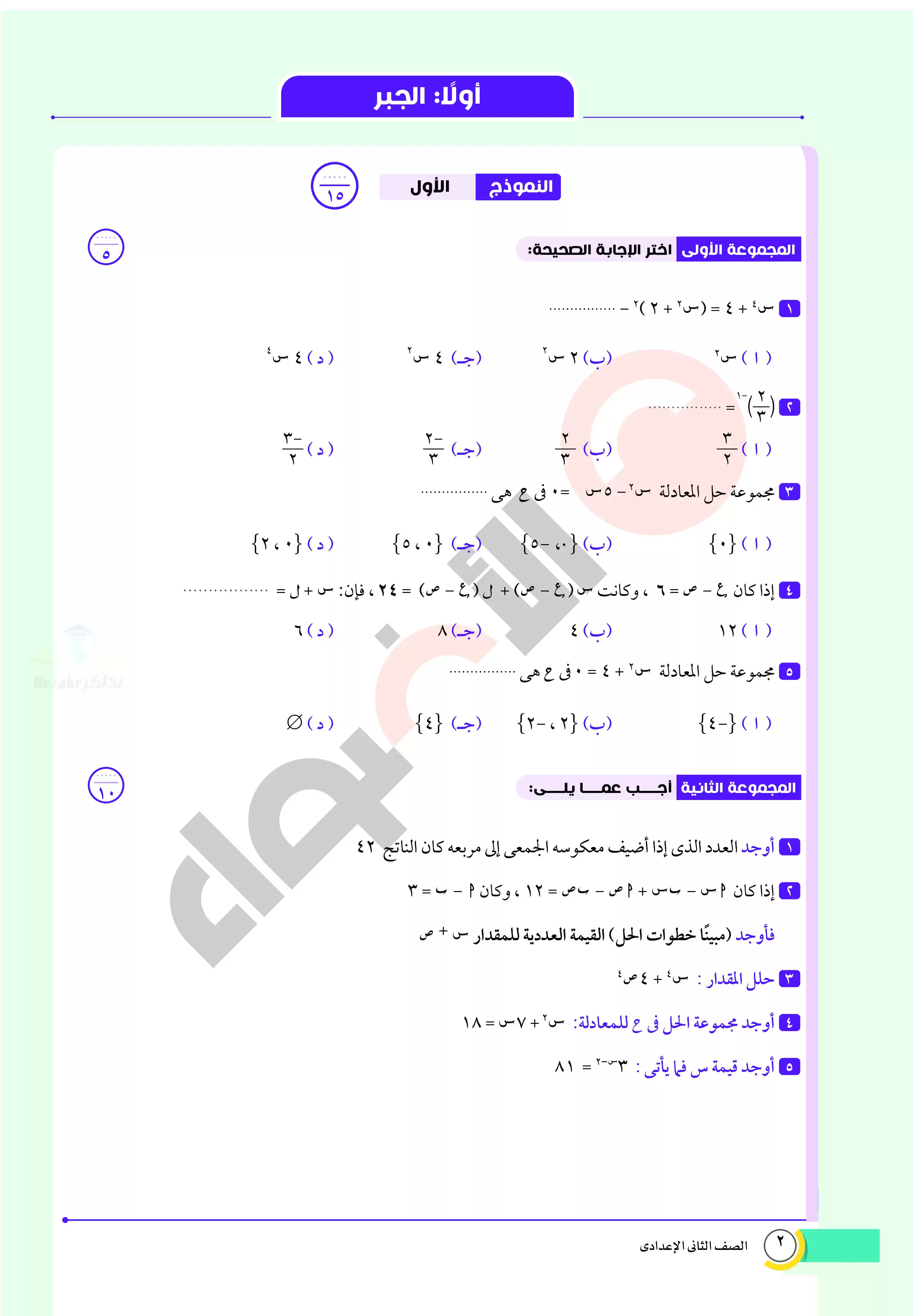 صفحة 2 من 32 صفحة من ملف: اختبارات الأضواء الاسترشادية في الرياضيات للصف الثاني الاعدادي مقرر أبريل 2025 بالاجابات - Nezakr