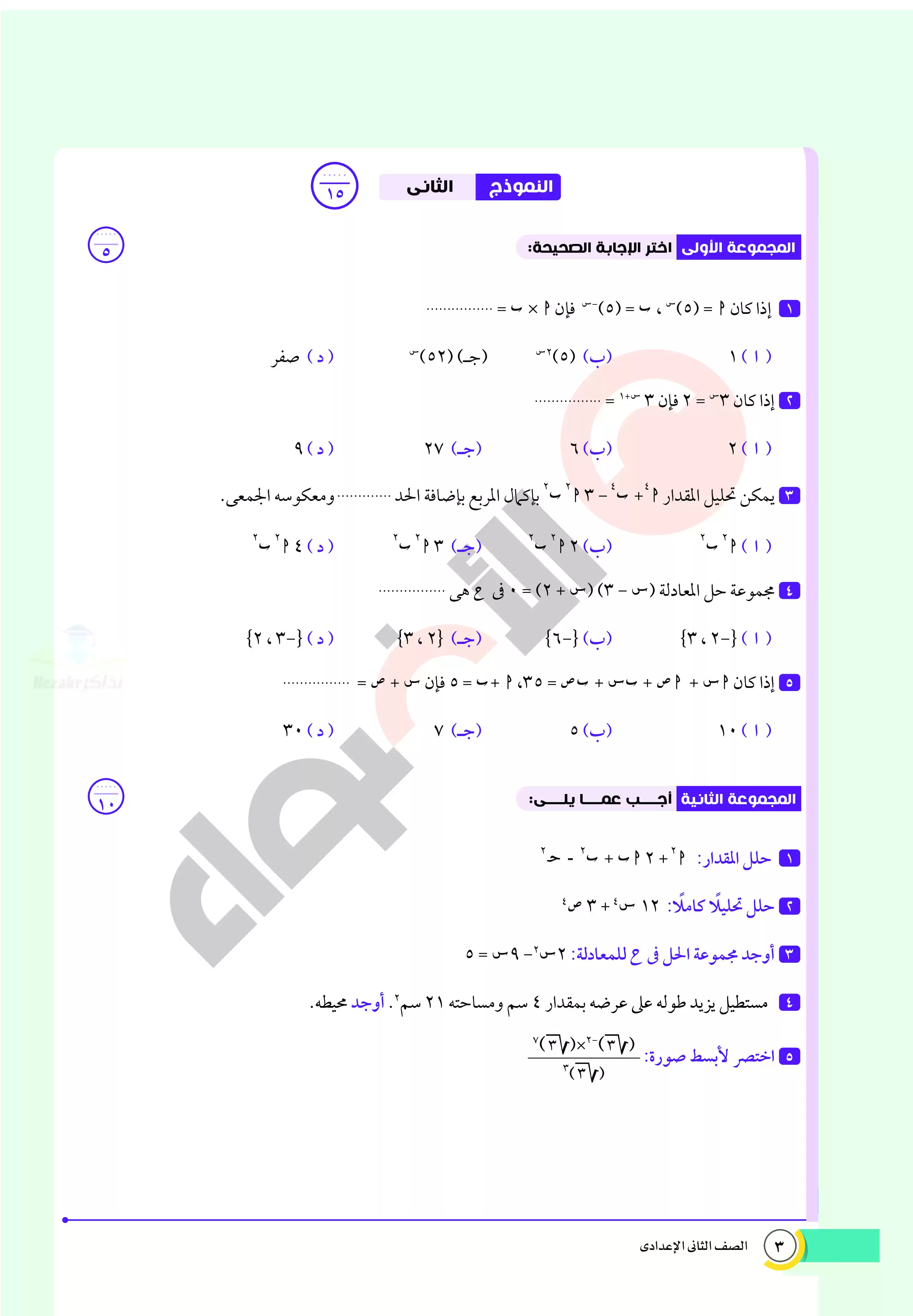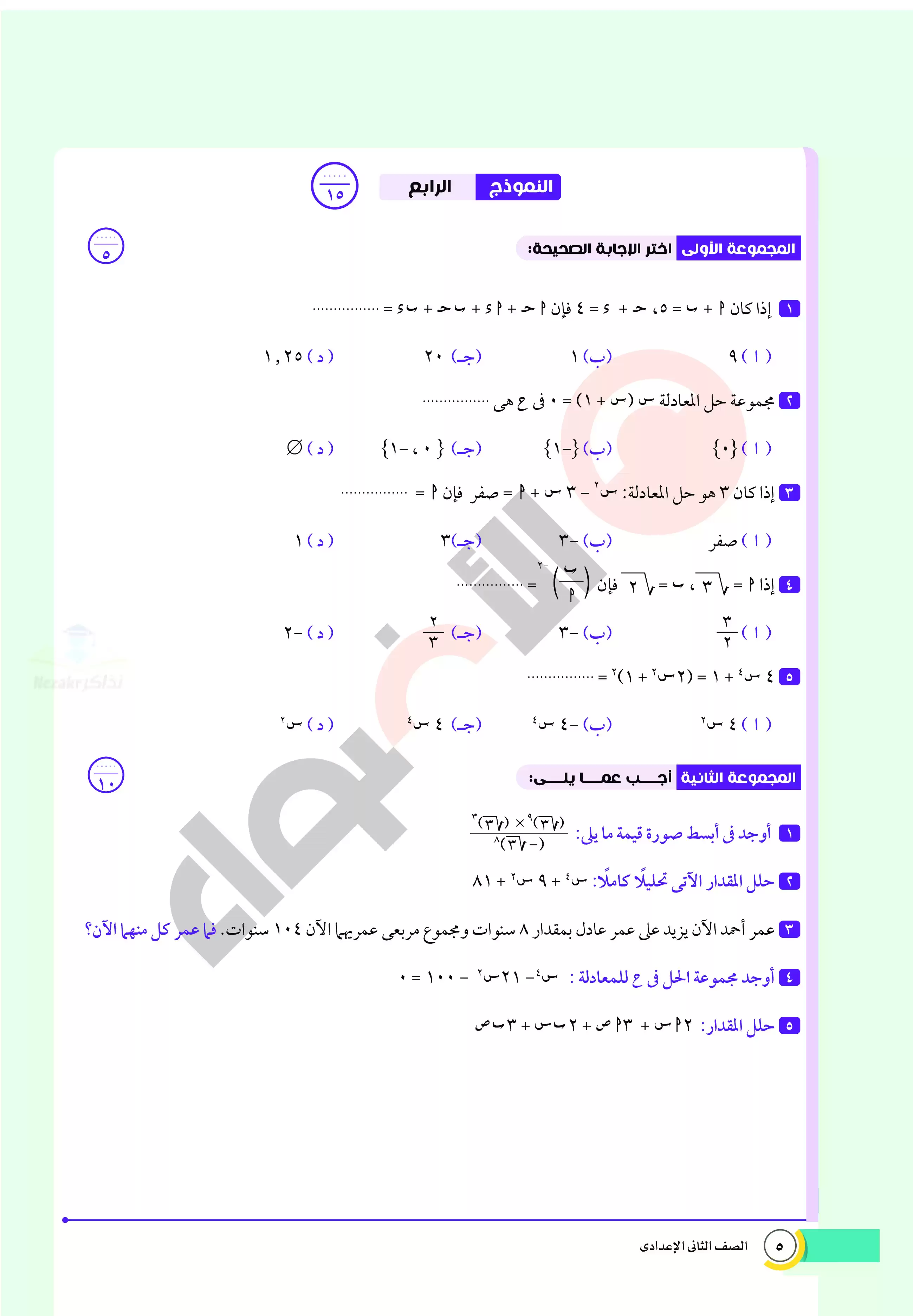 صفحة 5 من 32 صفحة من ملف: اختبارات الأضواء الاسترشادية في الرياضيات للصف الثاني الاعدادي مقرر أبريل 2025 بالاجابات - Nezakr