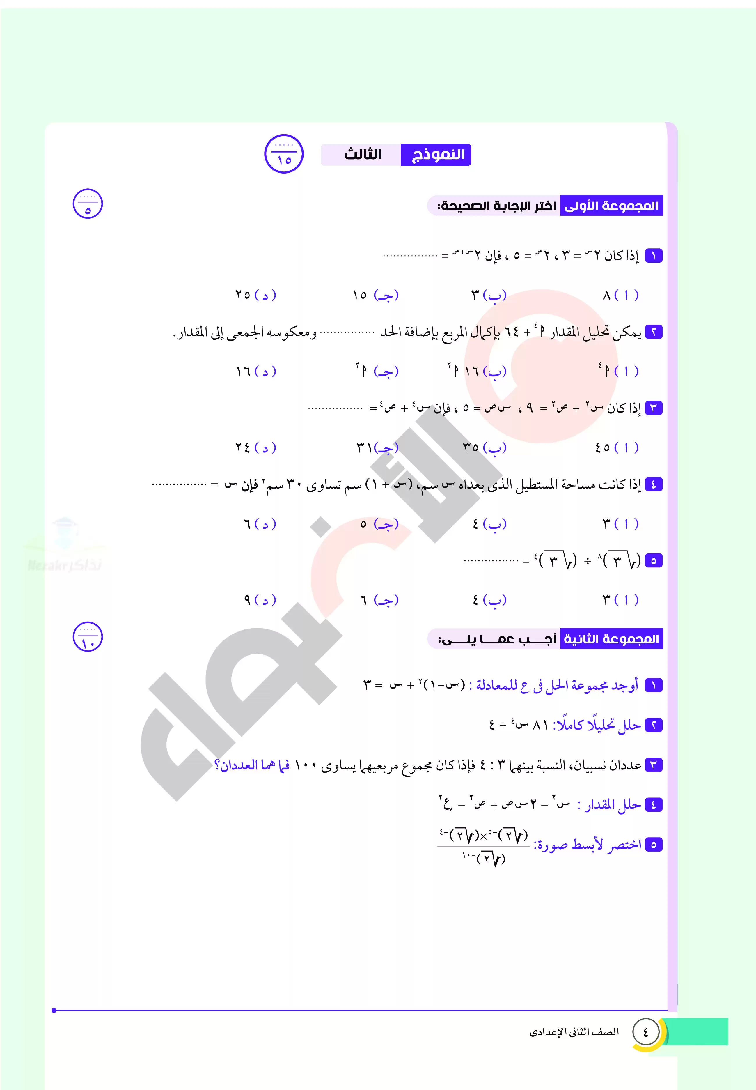 صفحة 4 من 32 صفحة من ملف: اختبارات الأضواء الاسترشادية في الرياضيات للصف الثاني الاعدادي مقرر أبريل 2025 بالاجابات - Nezakr