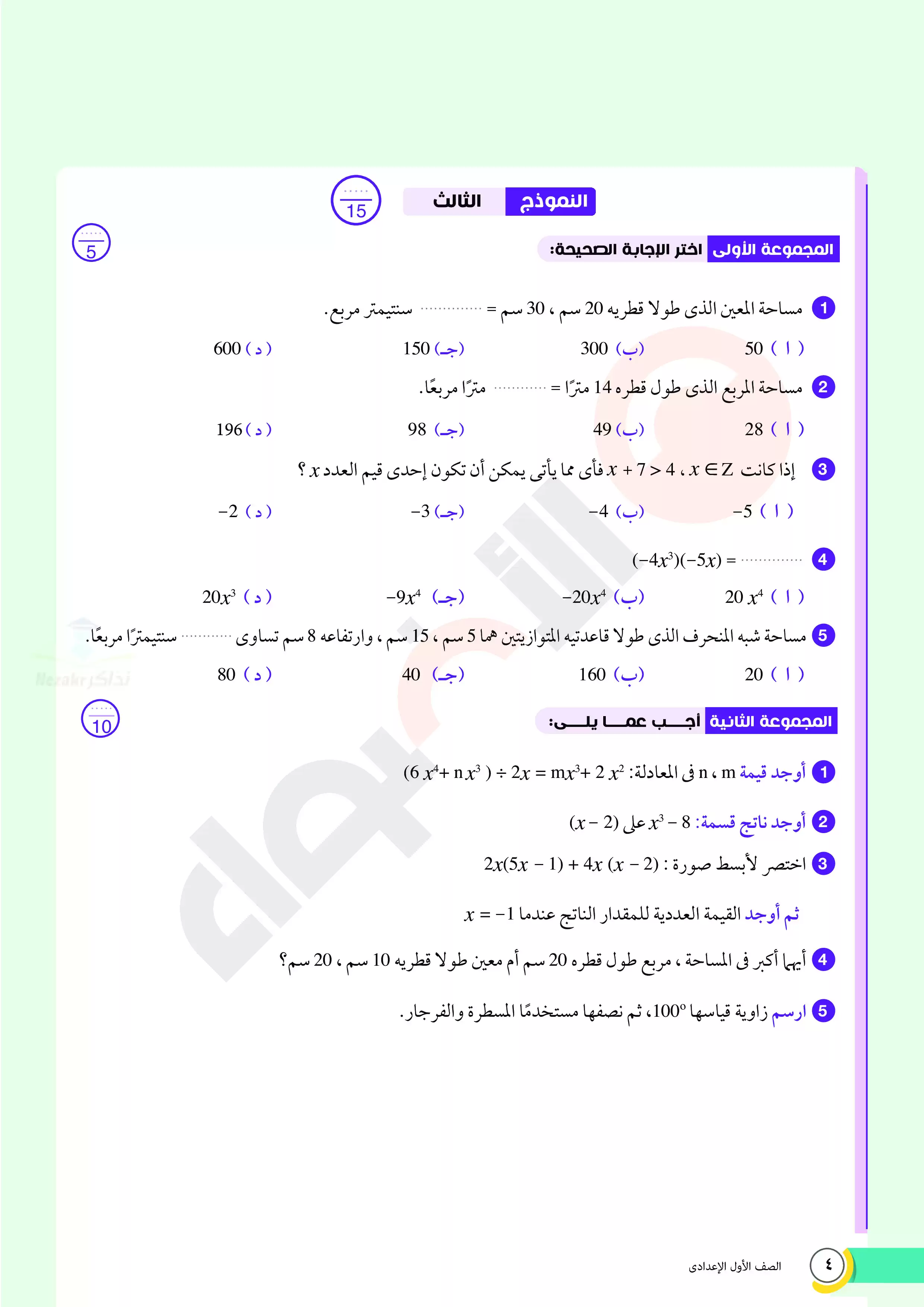صفحة 4 من 16 صفحة من ملف: اختبارات الأضواء الاسترشادية في الرياضيات للصف الأول الاعدادي مقرر أبريل 2025 بالاجابات - Nezakr