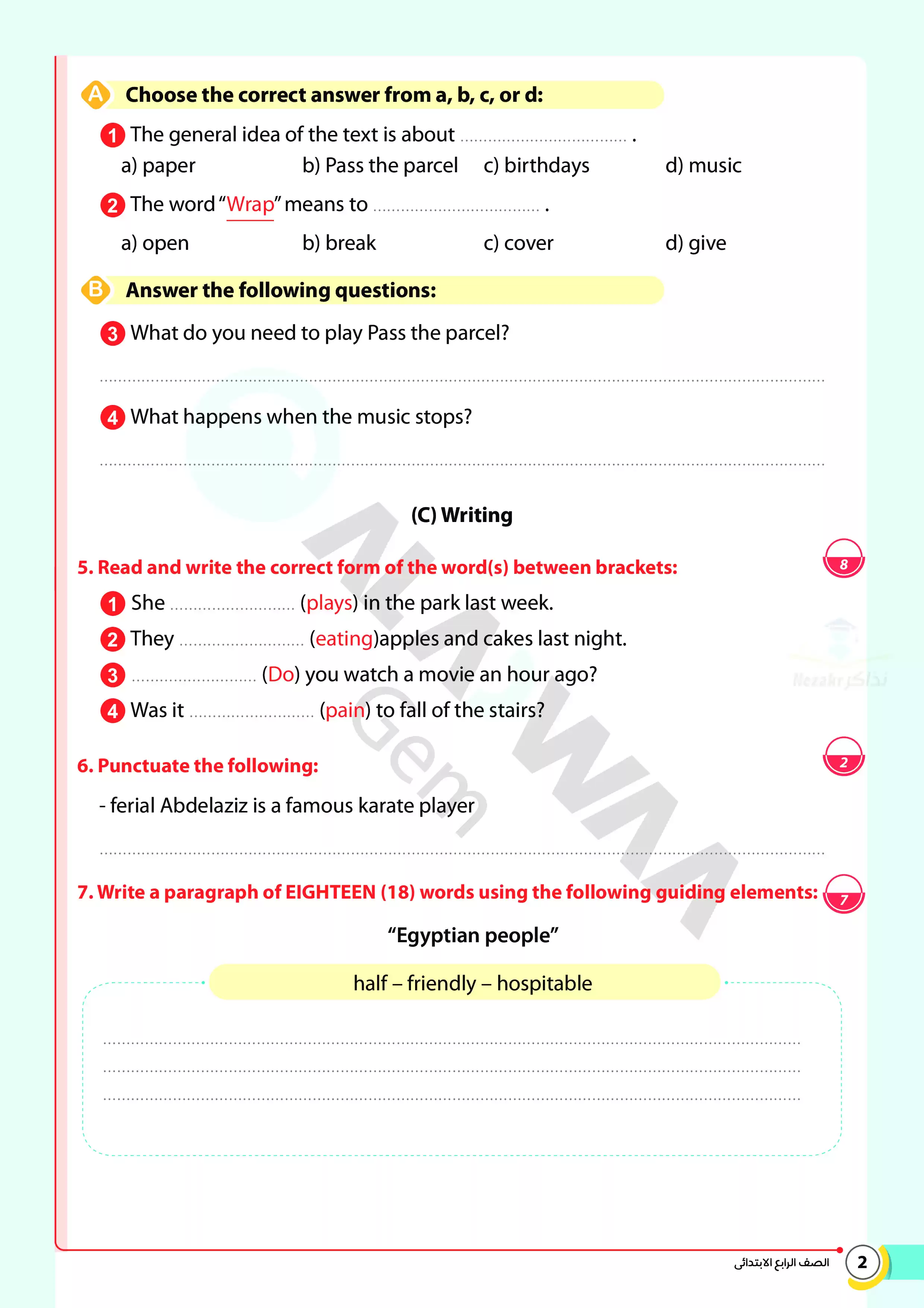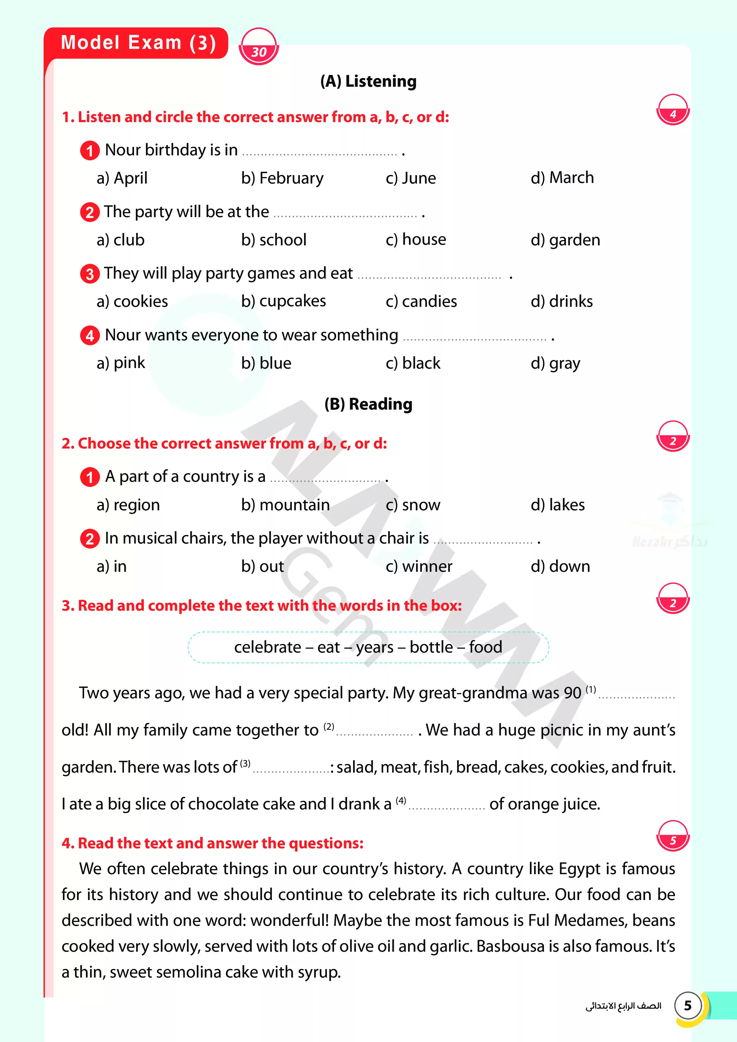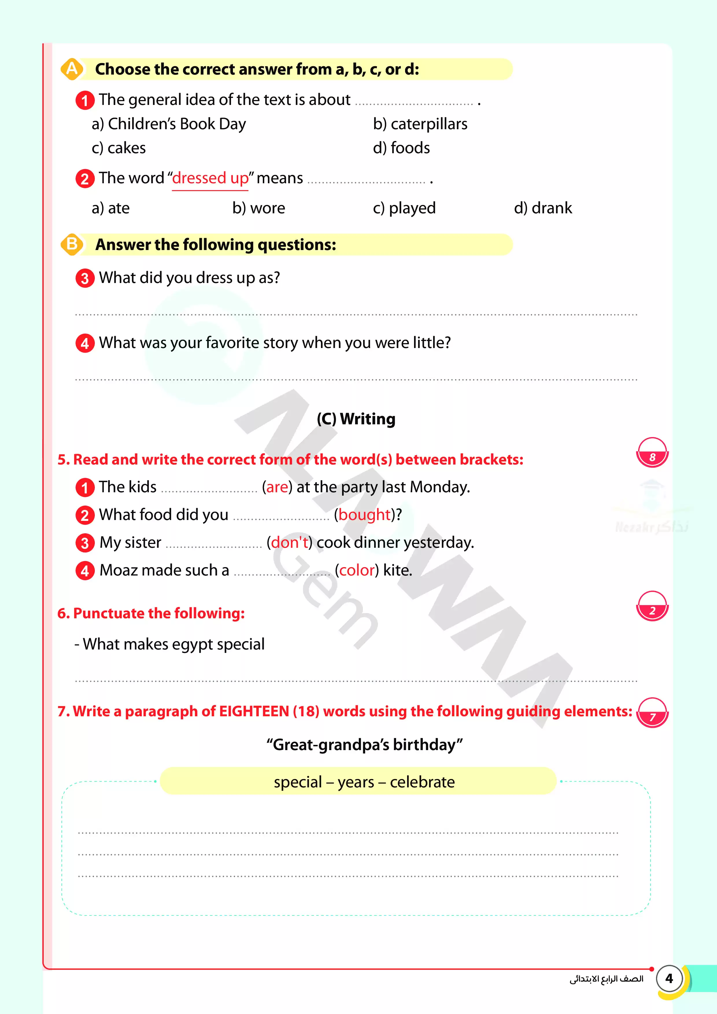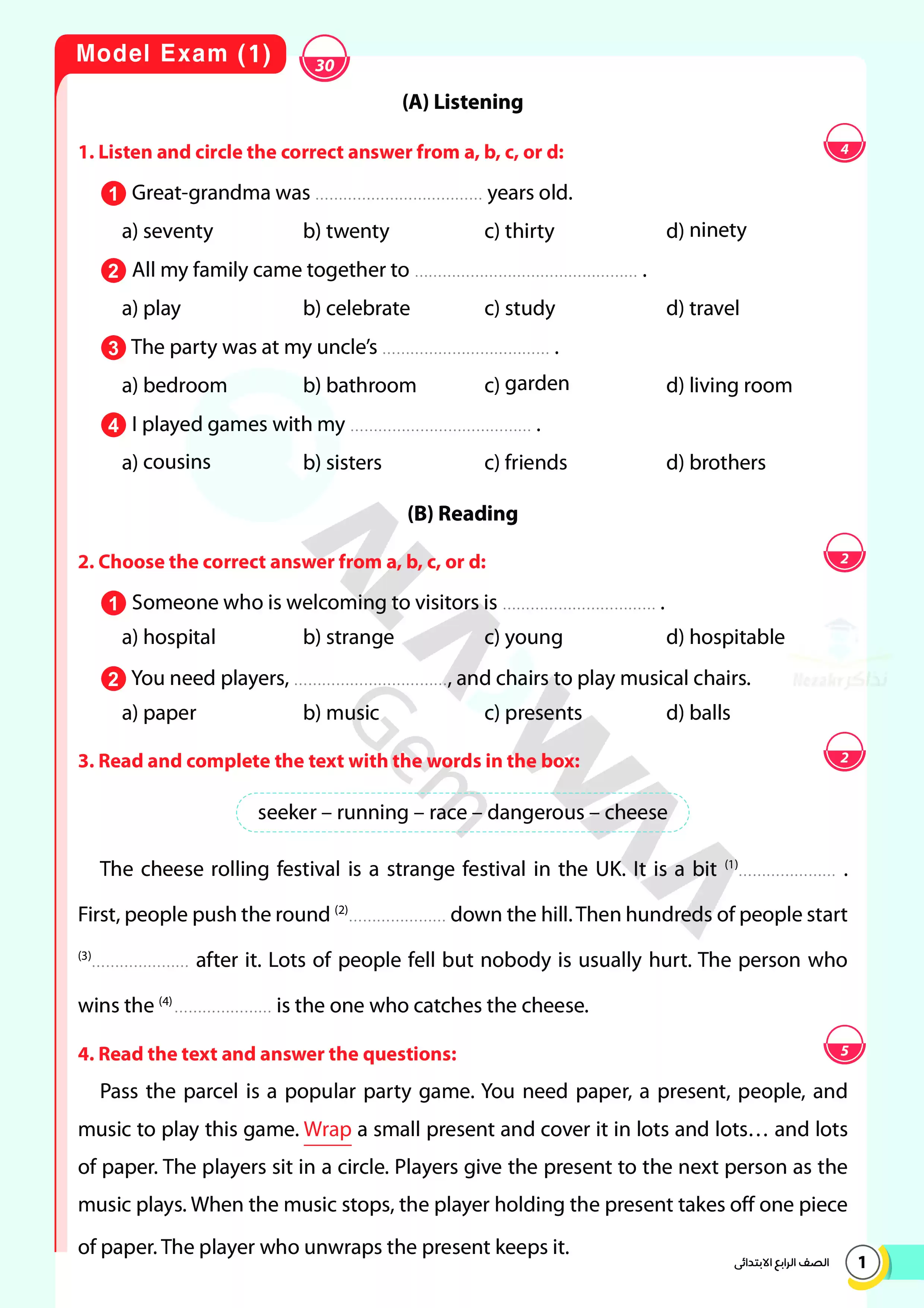 1. نماذج امتحانات استرشادية من كتاب الأضواء GEM على منهج اللغة الإنجليزية المقرر في شهر ابريل للصف الرابع الابتدائي.
