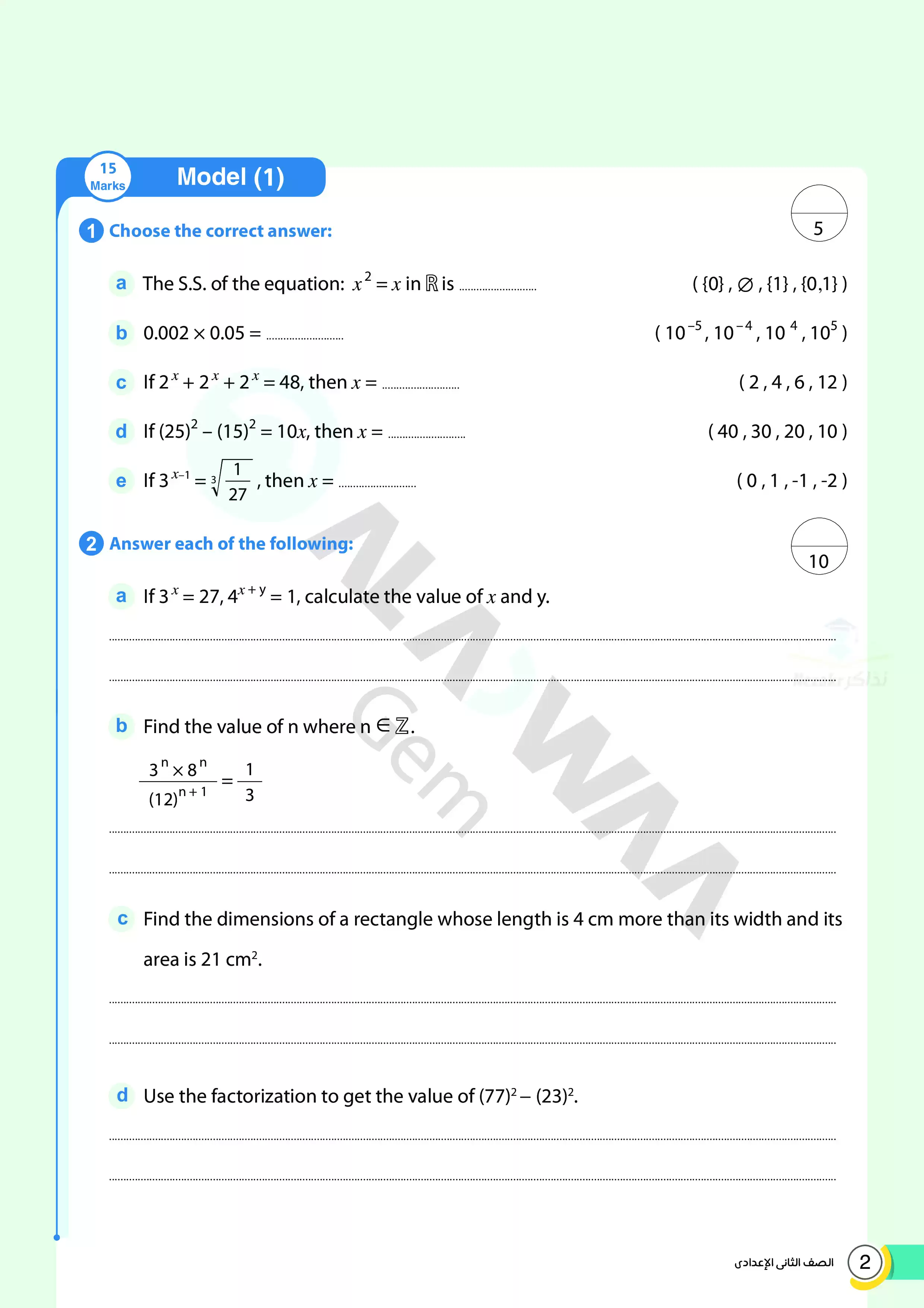 يحتوي الملف المرفق، والصادر من مؤسسة الأضواء، على نماذج امتحانات استرشادية على منهج ومقرر الجبر باللغة الإنجليزية Algebra خلال شهر أبريل لطلاب الصف الثاني الاعدادي، كما يتضمن الملف نموذج إجابة للأسئلة الموجودة فيه ليتدرب الطالب وولي الأمر عليها، والملف متاح بصيغة PDF وبجودة مميزة متاحة للتحميل والتصفح مجاناً.