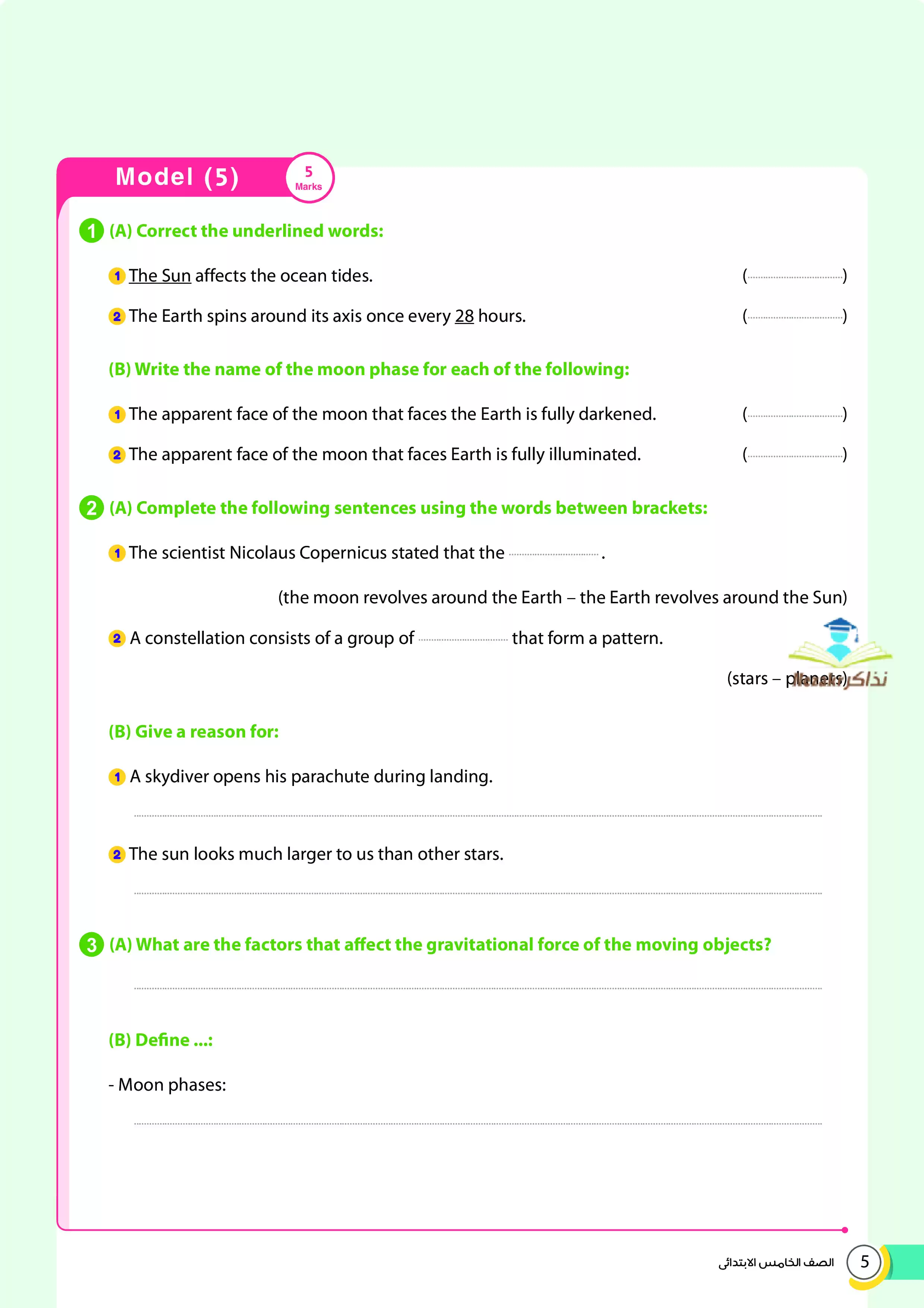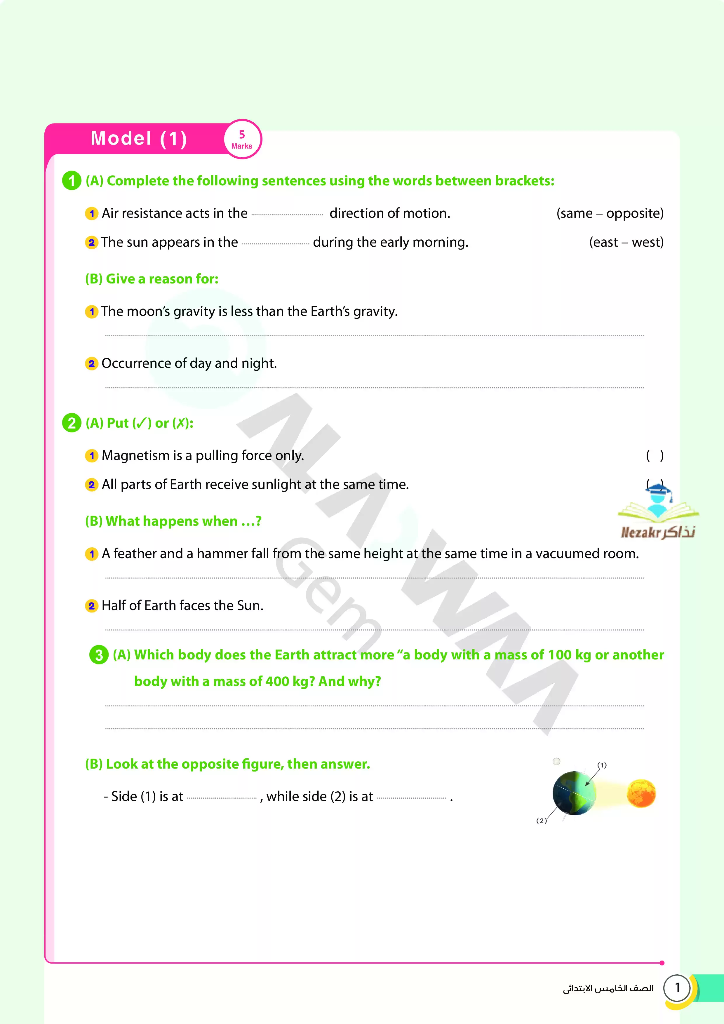 1. نماذج امتحانات استرشادية من كتاب الأضواء GEM على منهج العلوم للغات Science المقرر في شهر ابريل للصف الخامس الابتدائي.