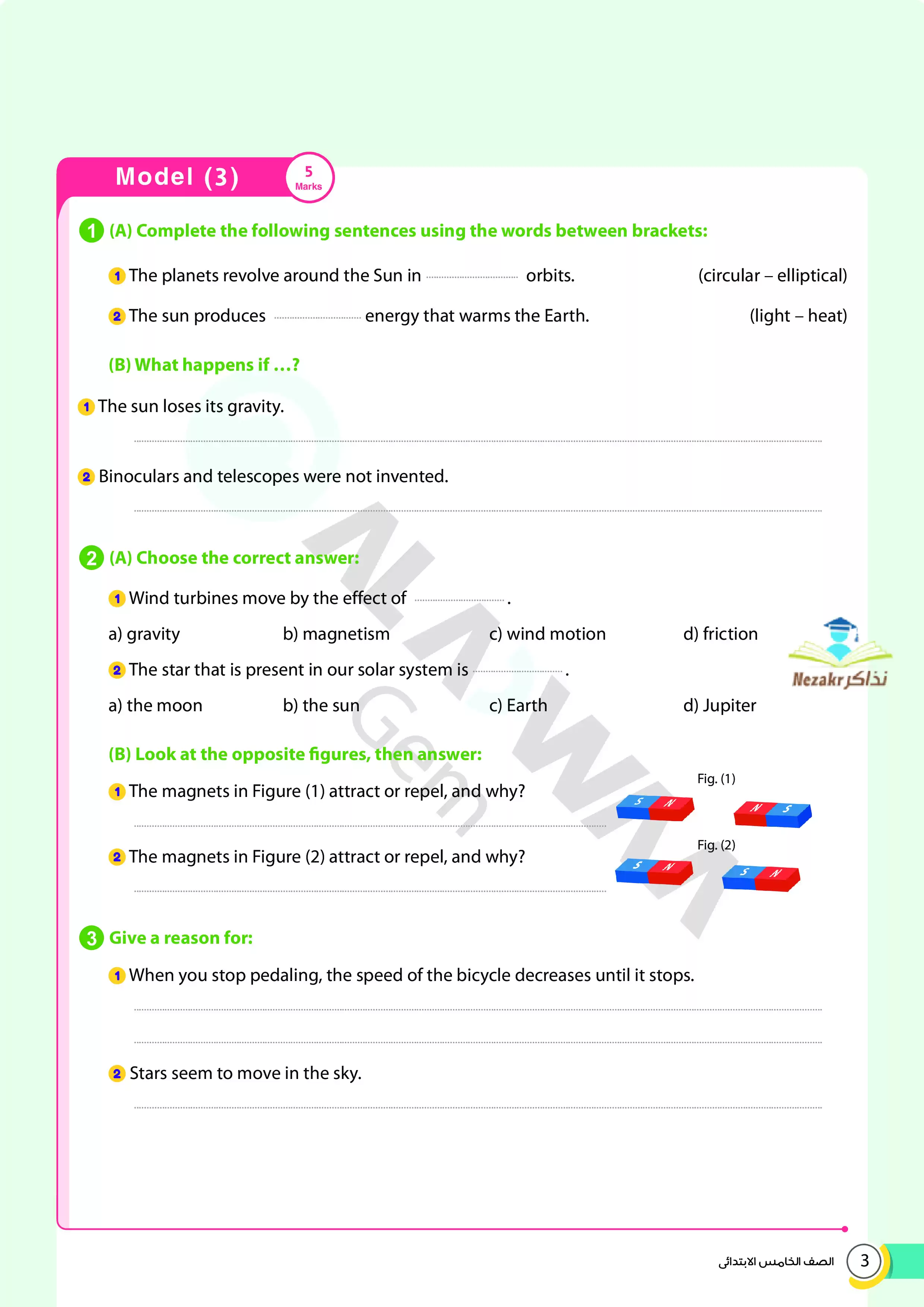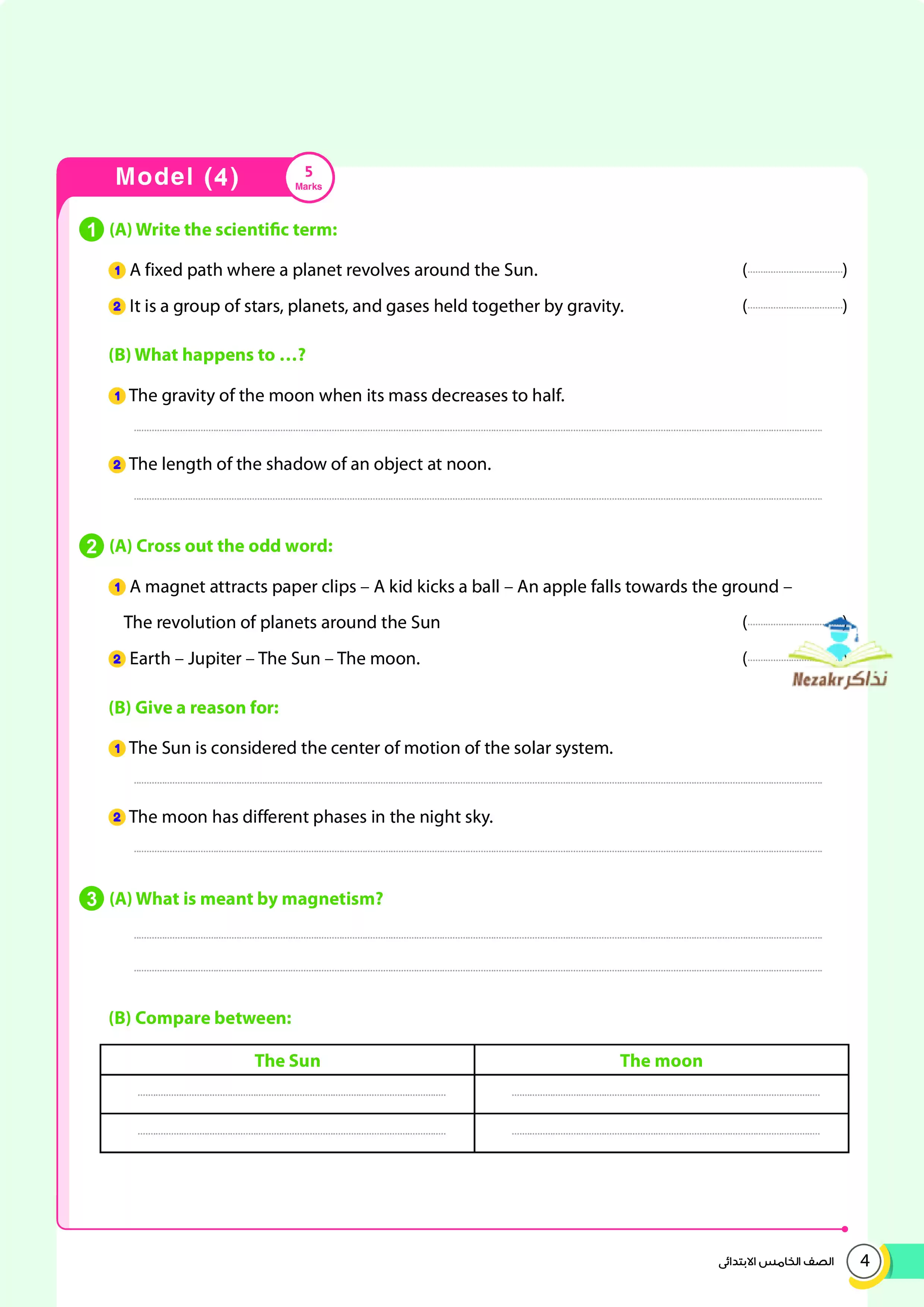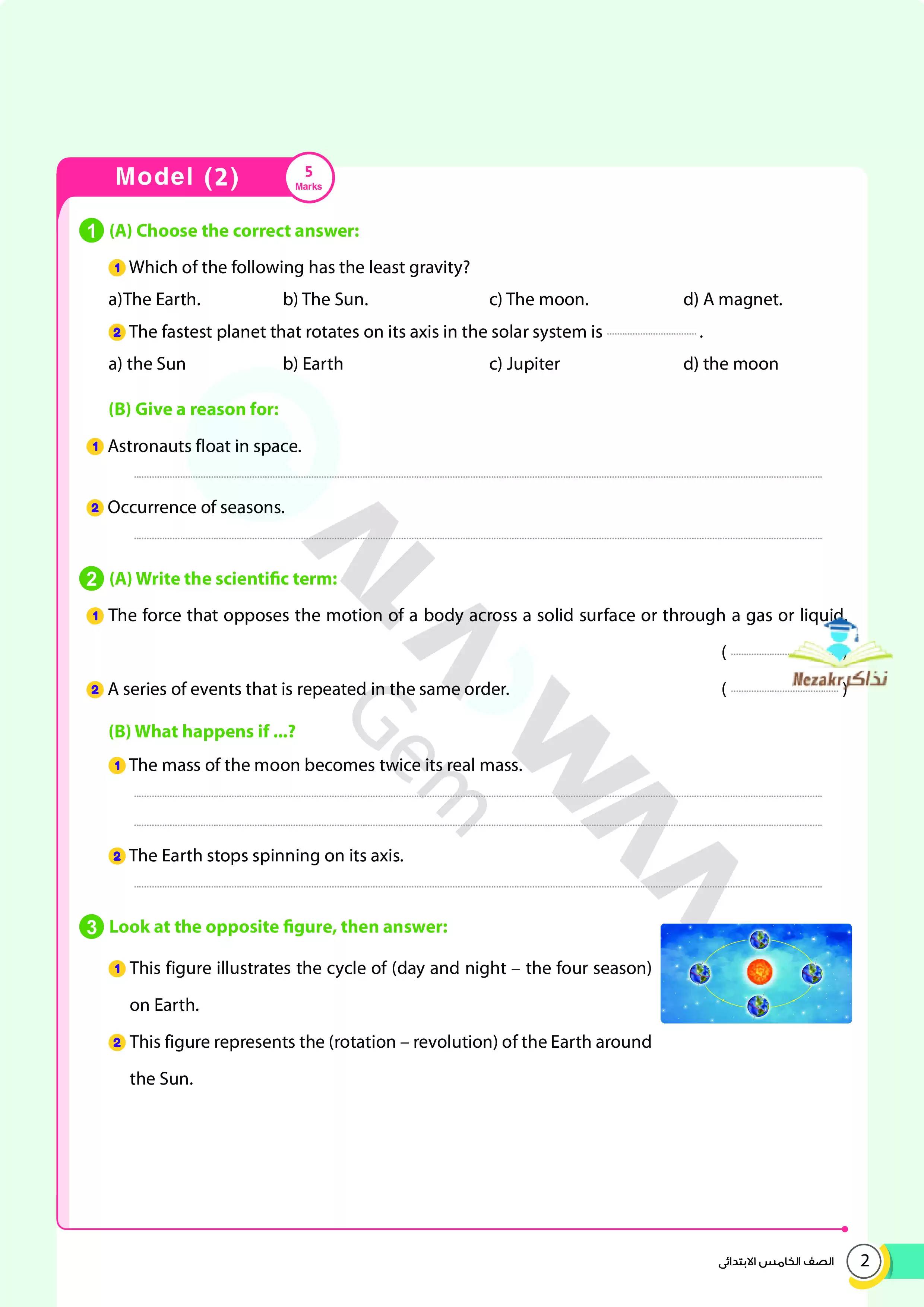 2. الاجابات النموذجية على نماذج امتحانات الأضواء على منهج الساينس Science المقرر في شهر أبريل للصف الخامس الابتدائي.