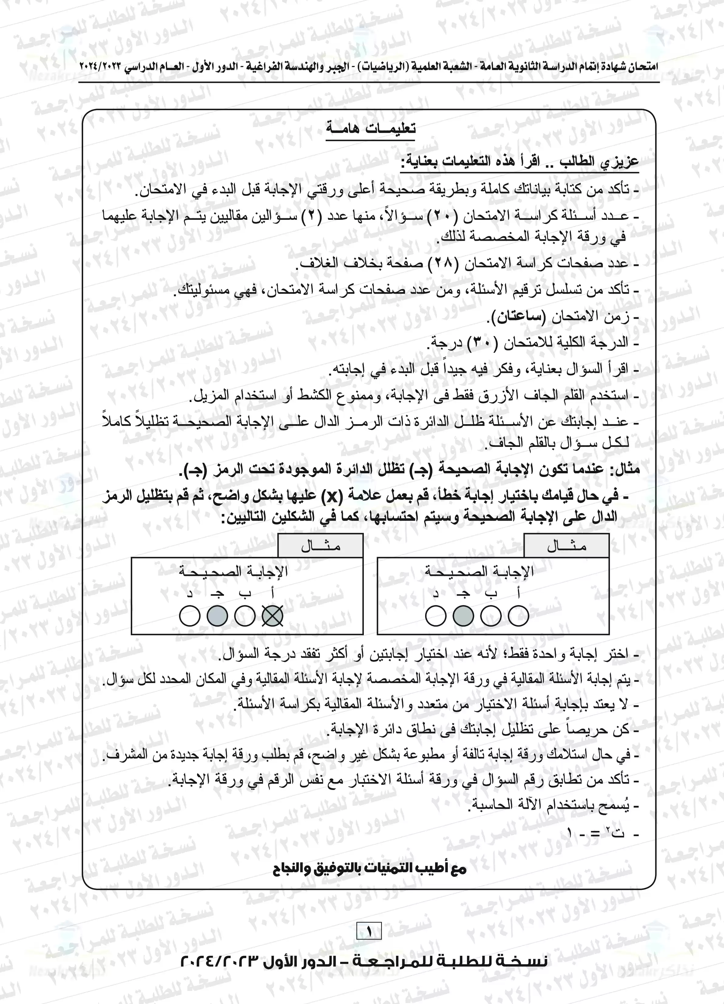 امتحان الجبر والهندسة الفراغية للثانوية العامة الدور الأول 2024 بصيغة PDF بالإجابات الرسمية