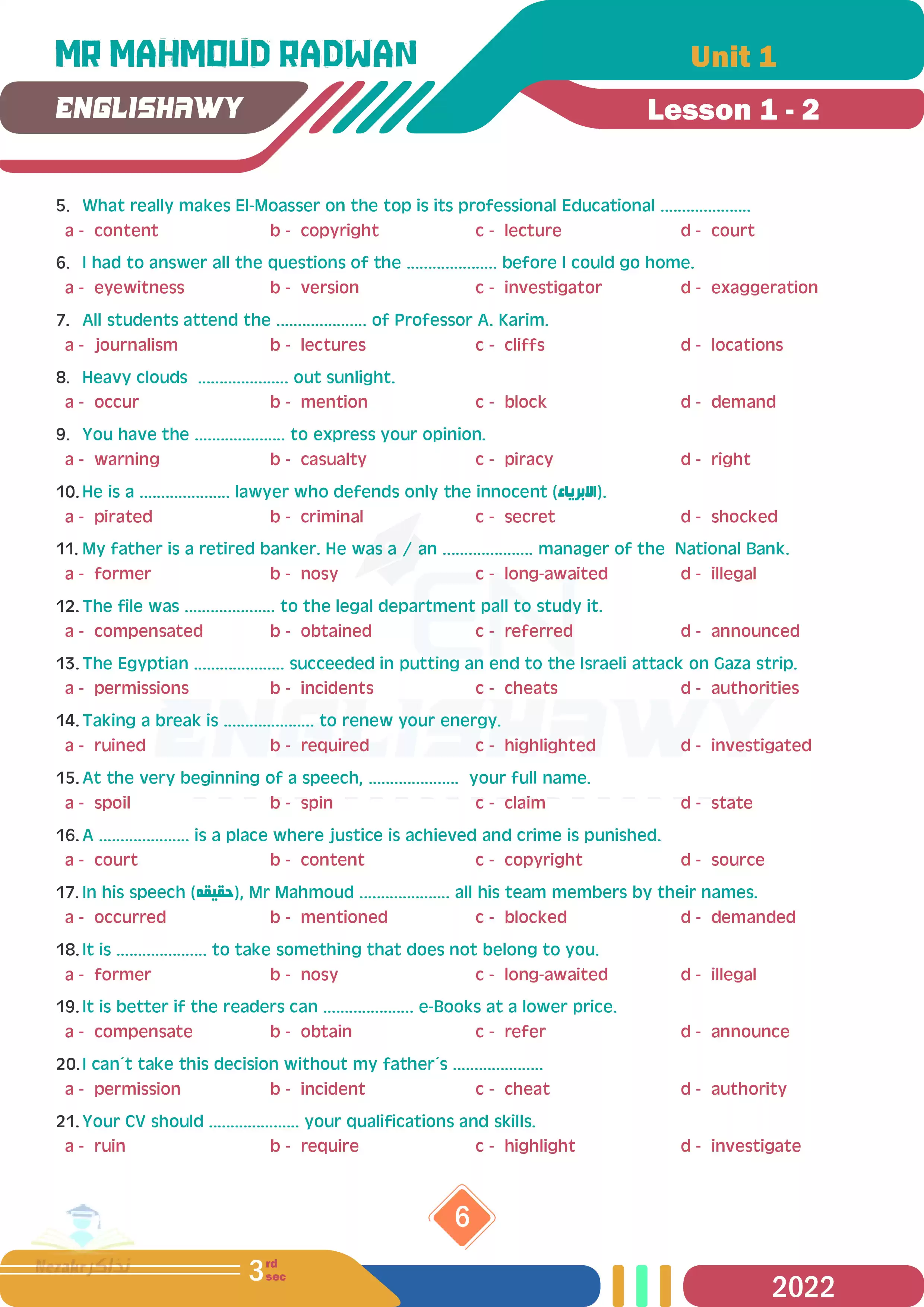 صفحة 6 من 337 صفحة من ملف: مذكرة انجلشاوي في اللغة الانجليزية للصف الثالث الثانوي مستر محمود رضوان - Nezakr